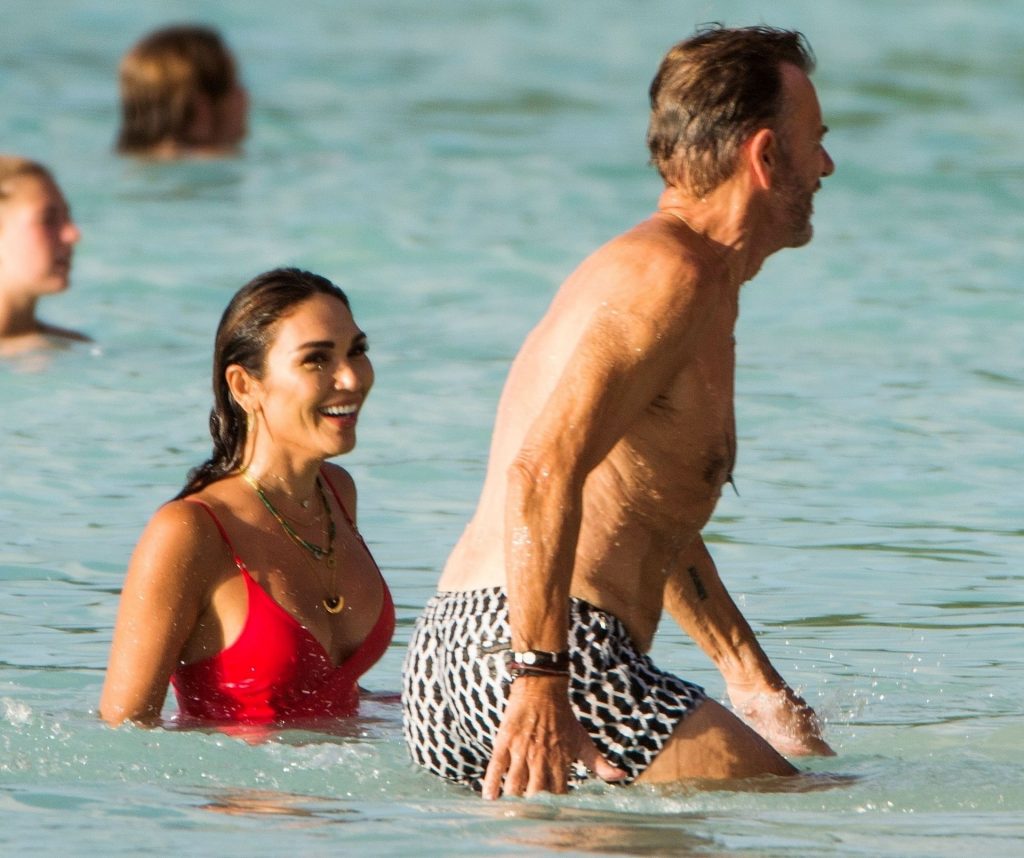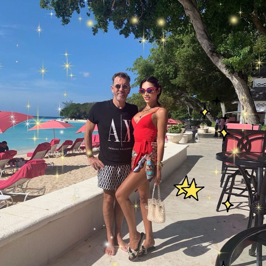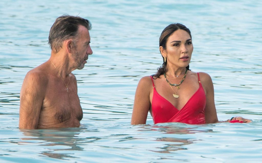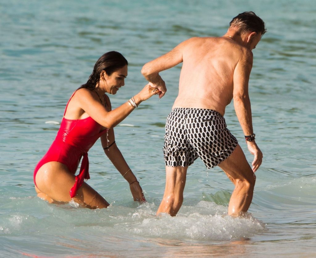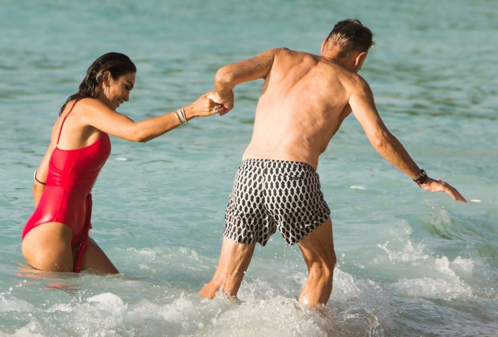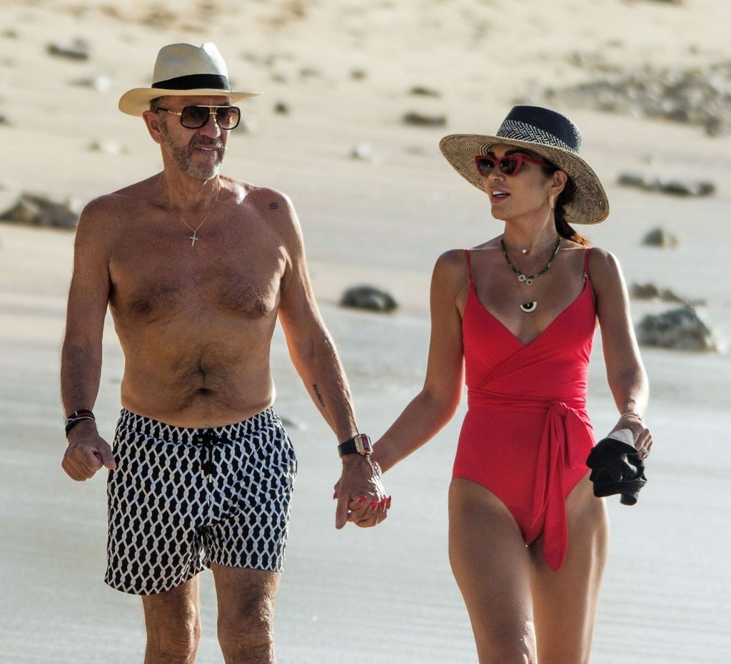 La esposa de Duncan Bannatyne, Nigora, 39, muestra su increíble físico con un traje de baño rojo al estilo Baywatch mientras camina de la mano con su esposo Duncan Bannatyne en la playa Sandy Lane en Barbados, 25/12/2019.