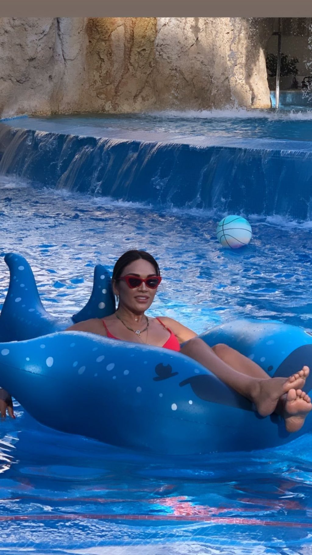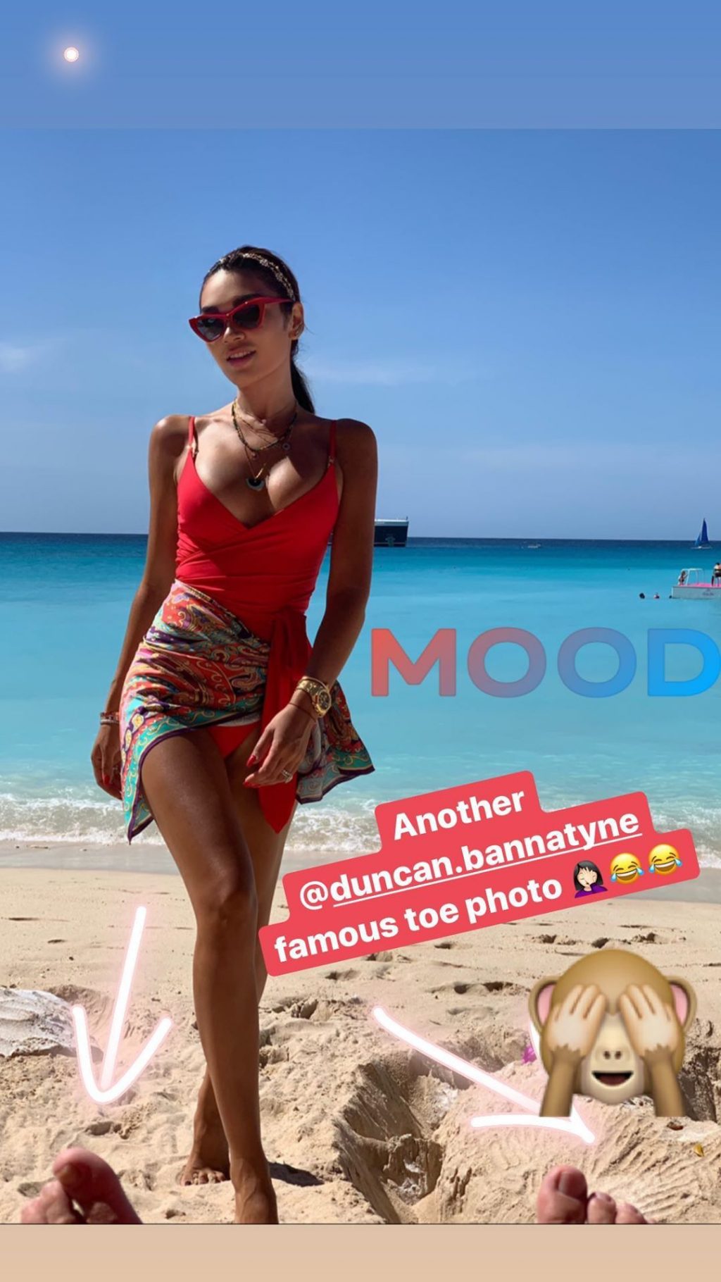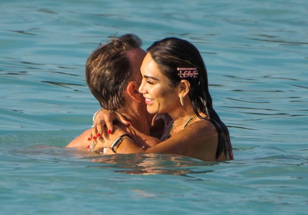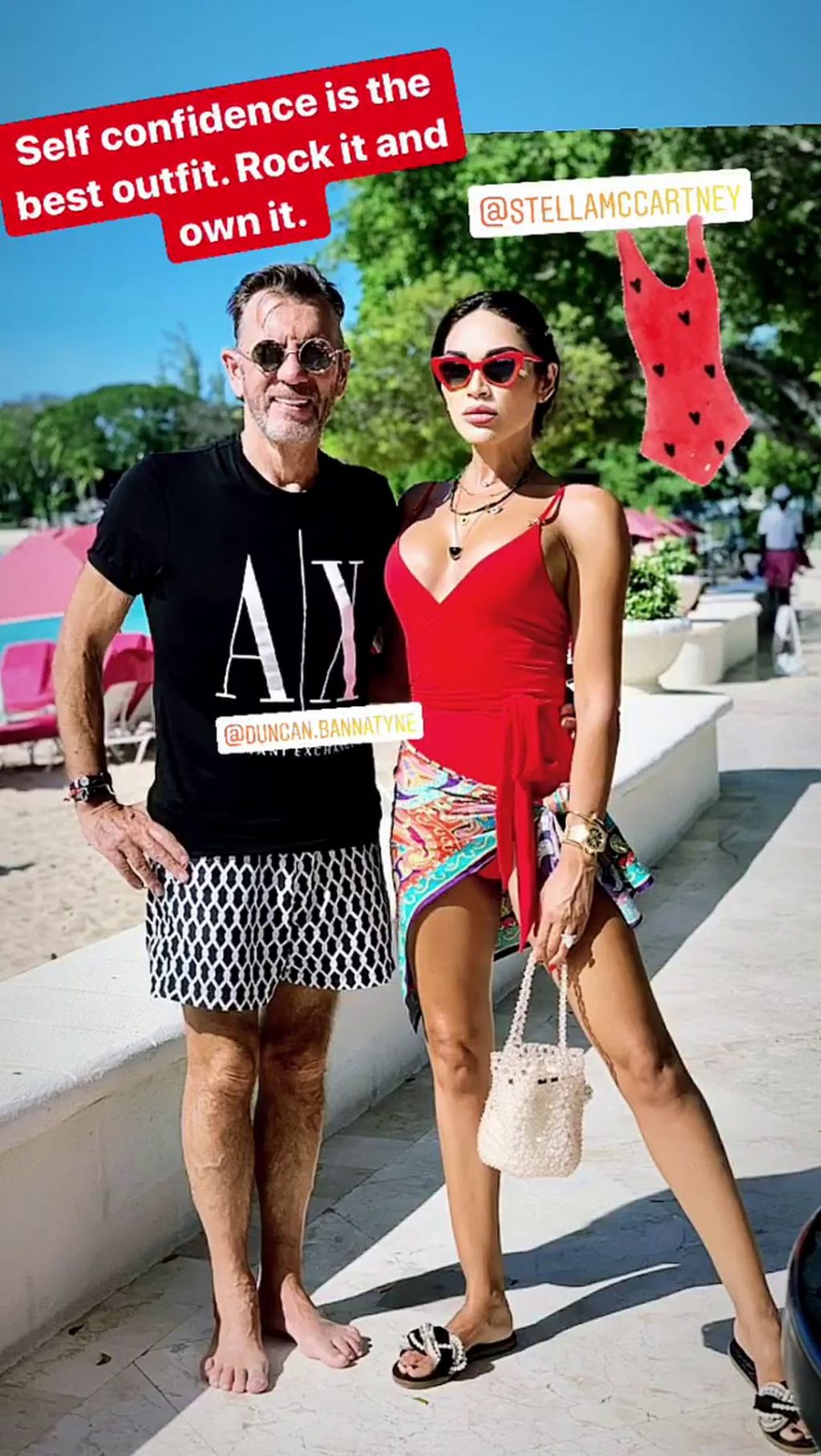 La esposa de Duncan Bannatyne, Nigora, 39, muestra su increíble físico con un traje de baño rojo al estilo Baywatch mientras camina de la mano con su esposo Duncan Bannatyne en la playa Sandy Lane en Barbados, 25/12/2019.