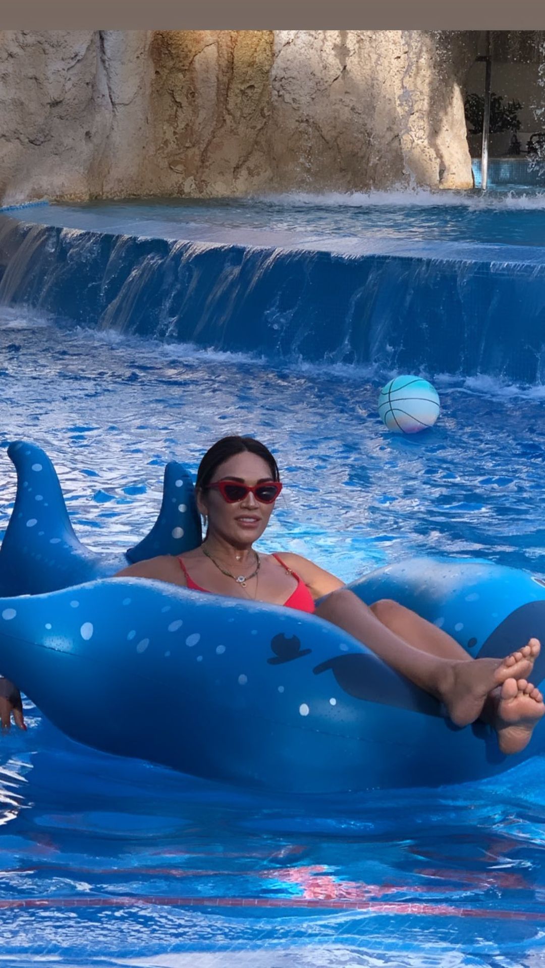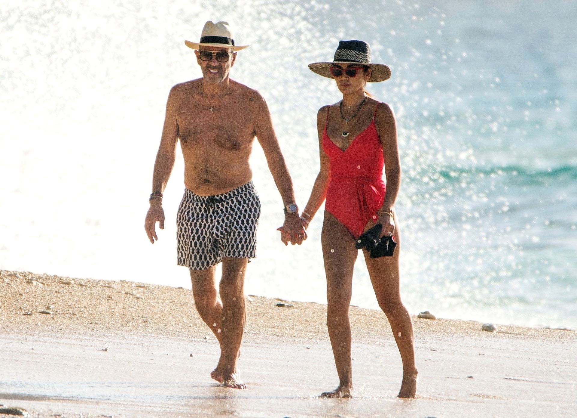 La esposa de Duncan Bannatyne, Nigora, 39, muestra su increíble físico con un traje de baño rojo al estilo Baywatch mientras camina de la mano con su esposo Duncan Bannatyne en la playa Sandy Lane en Barbados, 25/12/2019.
