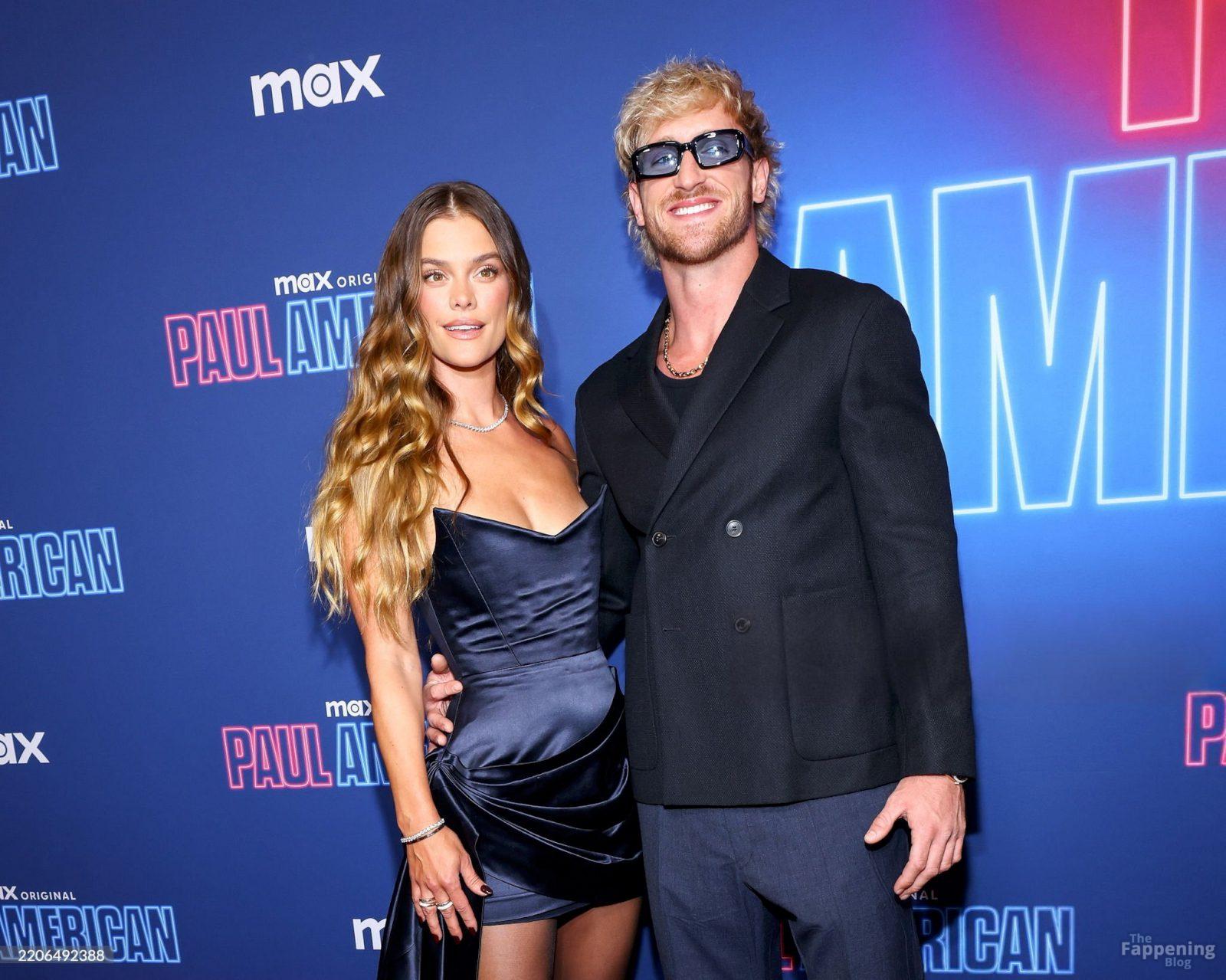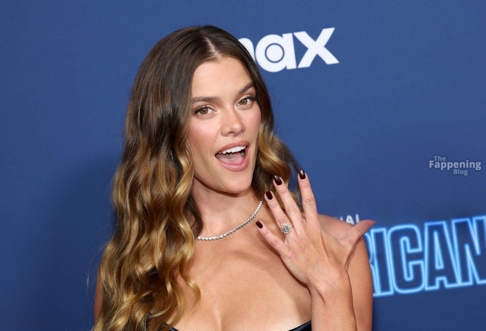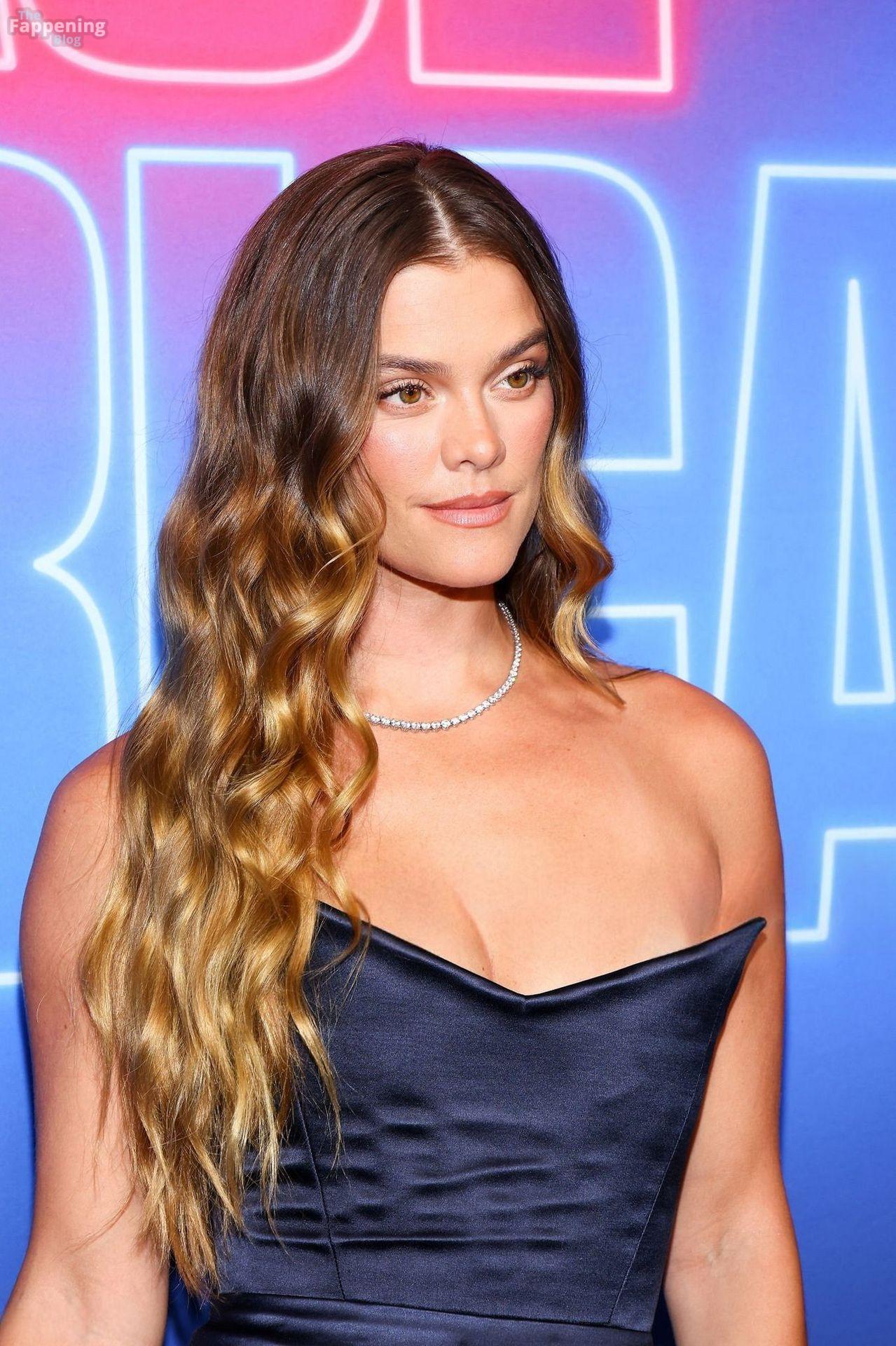 La danesa Nina Agdal asiste al estreno de “Paul American” con un vestido sin tirantes, luciendo su pronunciado escote y largas piernas.