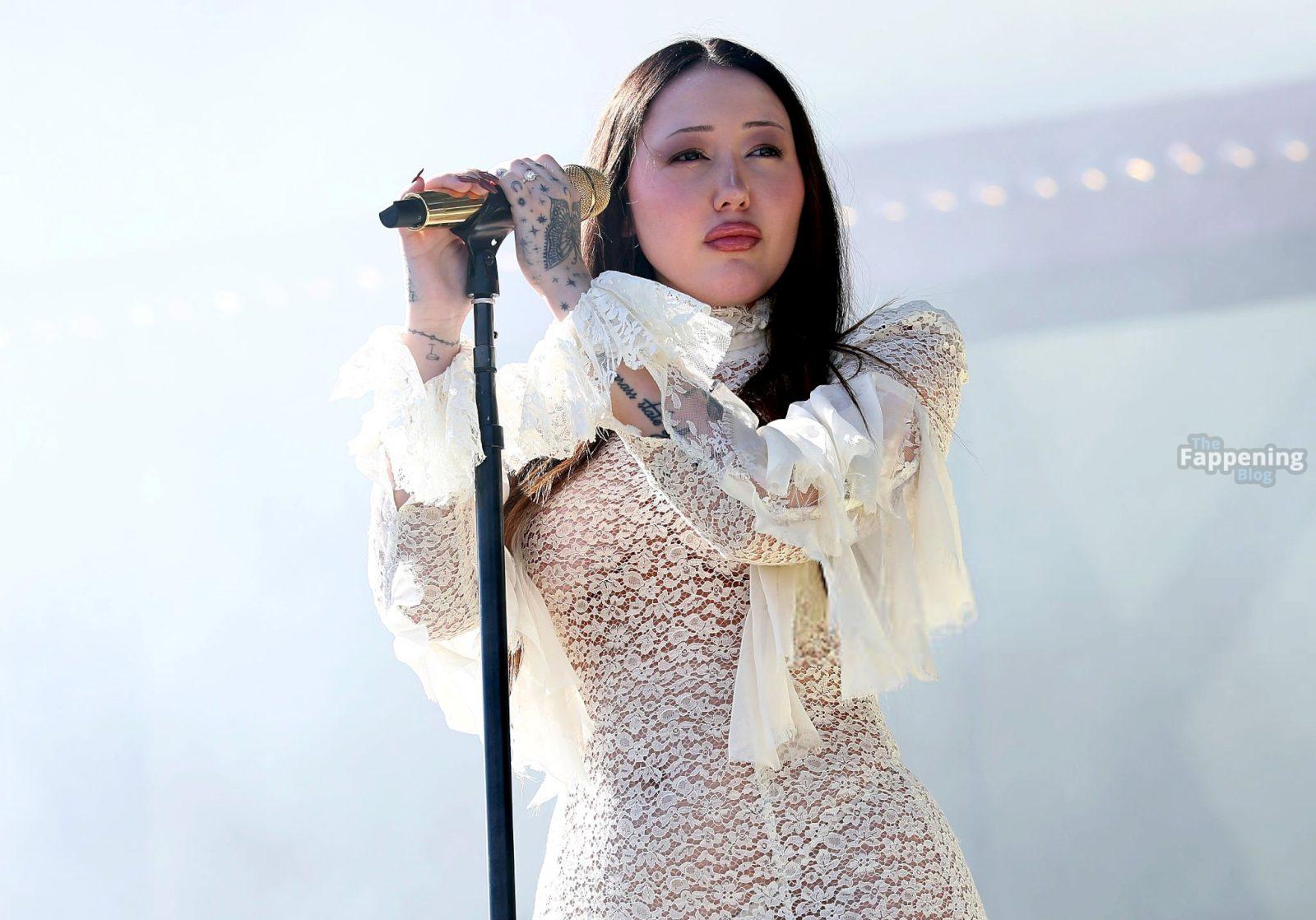 Noah Cyrus sin sujetador en Coachella 2025, luciendo un vestido de encaje transparente. La cantante muestra sus pechos y pezones.