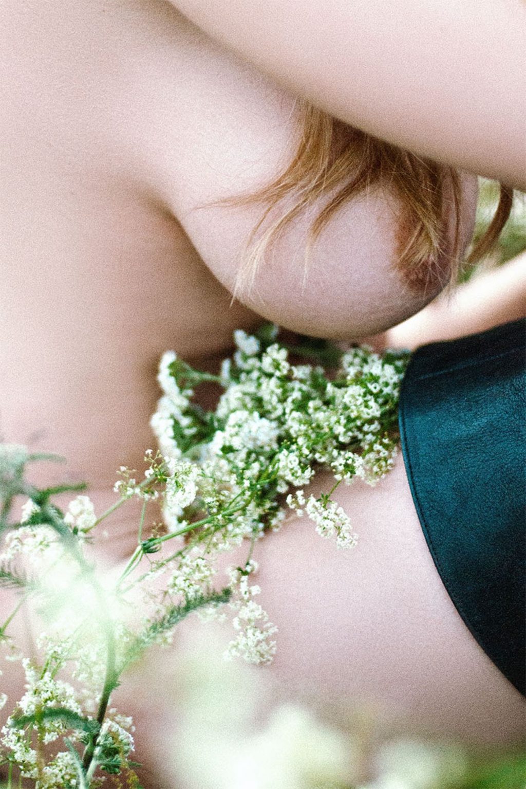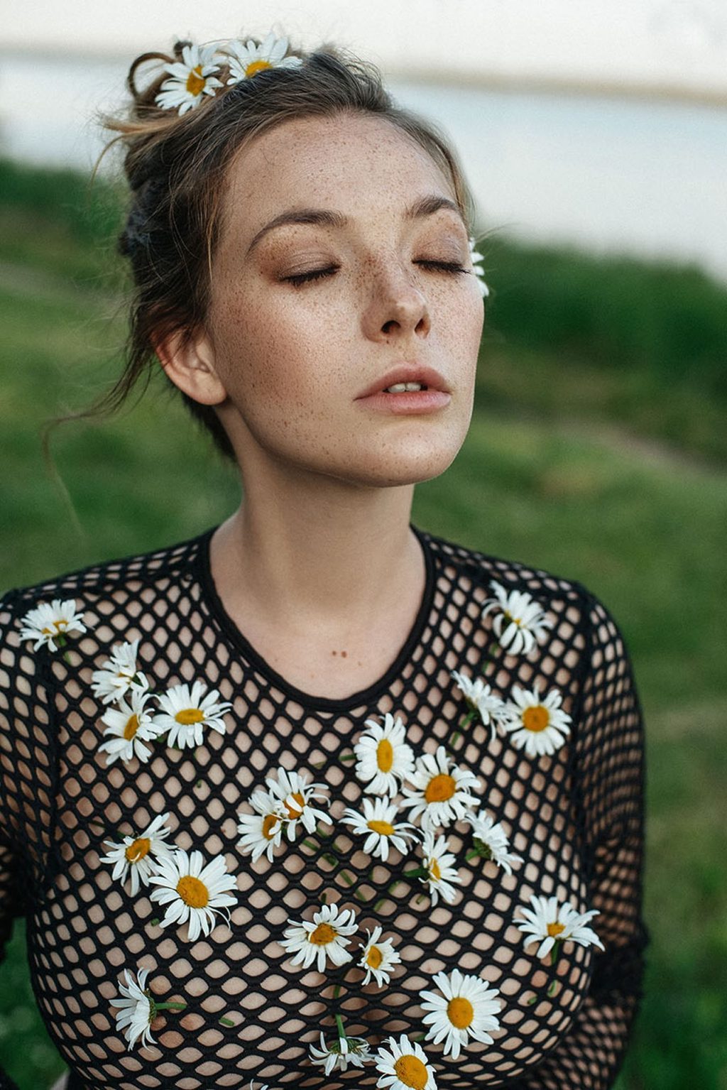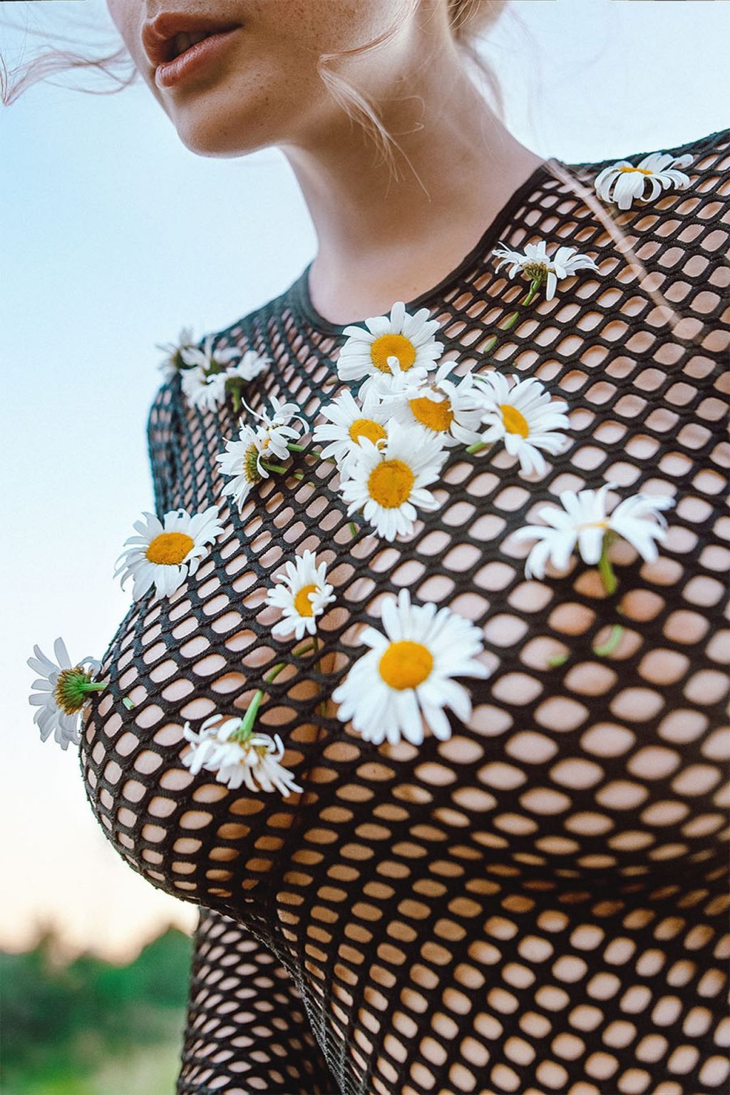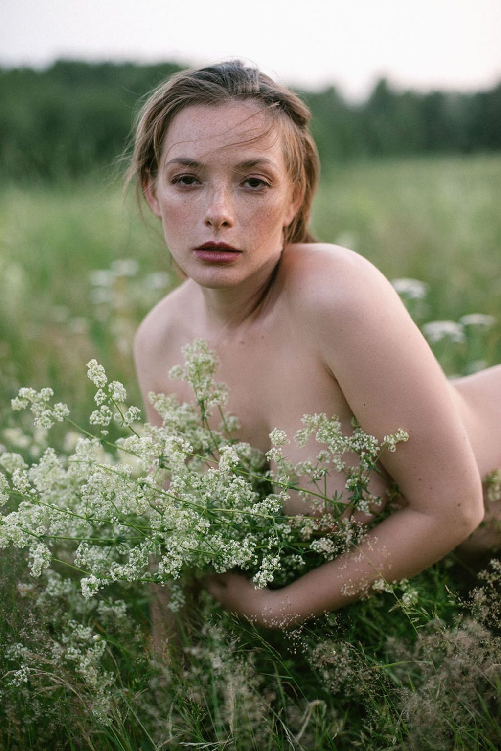 La modelo rusa Olga Kobzar posa con un top de malla y desnuda en el campo y se baña en una nueva sesión de fotos de Tatiana Mertsalova (julio de 2020).