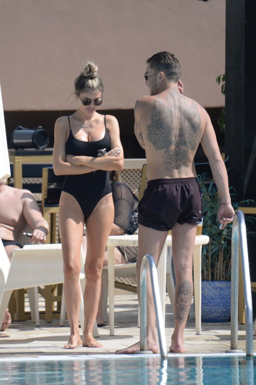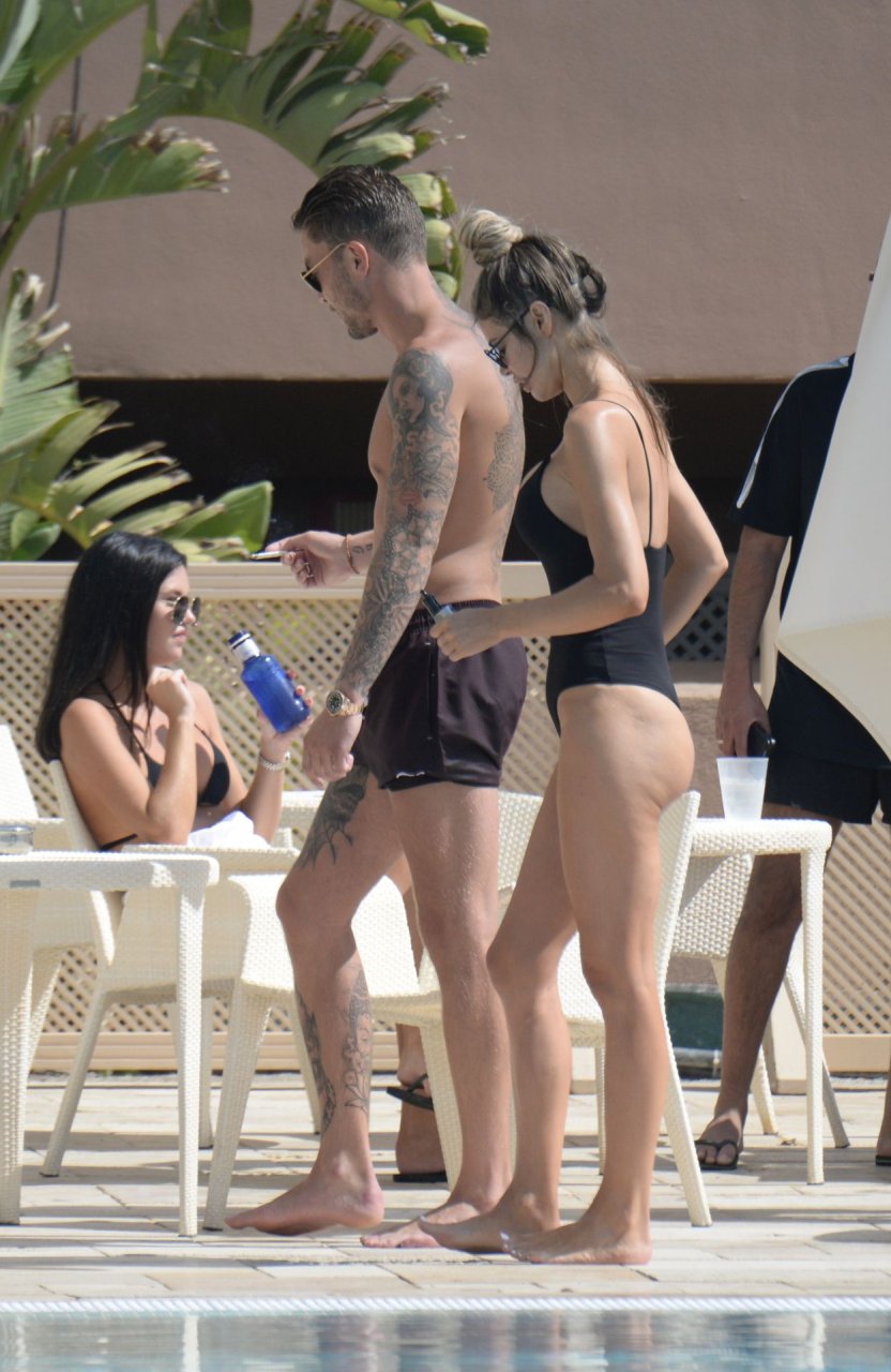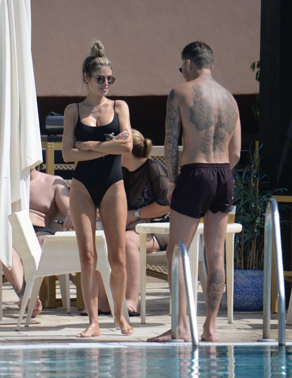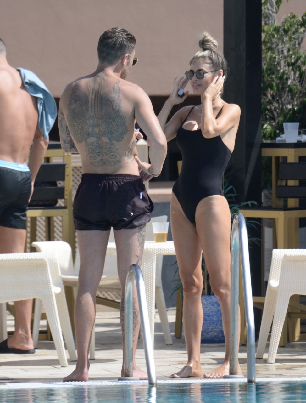 TOWIE estrella Olivia Atwood disfruta de la piscina en Marbella, España, 18/09/2019. La estrella de reality mostró sus curvas con un bikini rosa y fue vista aplicándose loción bronceadora con amigos, mientras llevaba gafas de sol y sostenía una bebida y un teléfono.