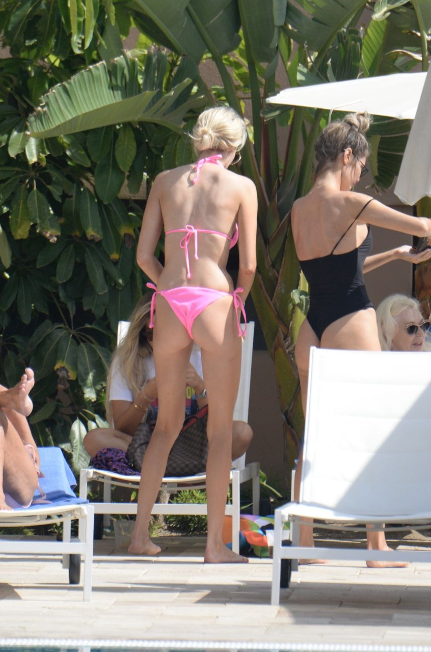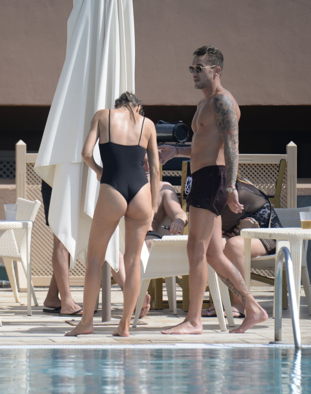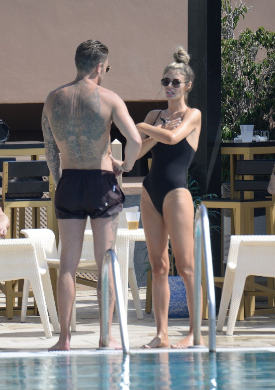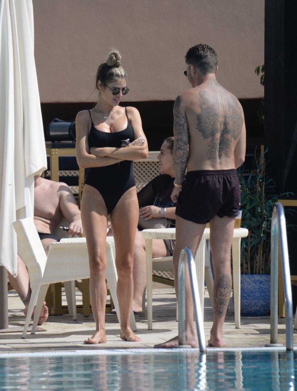 TOWIE estrella Olivia Atwood disfruta de la piscina en Marbella, España, 18/09/2019. La estrella de reality mostró sus curvas con un bikini rosa y fue vista aplicándose loción bronceadora con amigos, mientras llevaba gafas de sol y sostenía una bebida y un teléfono.