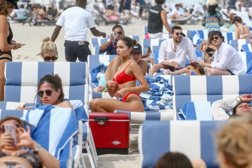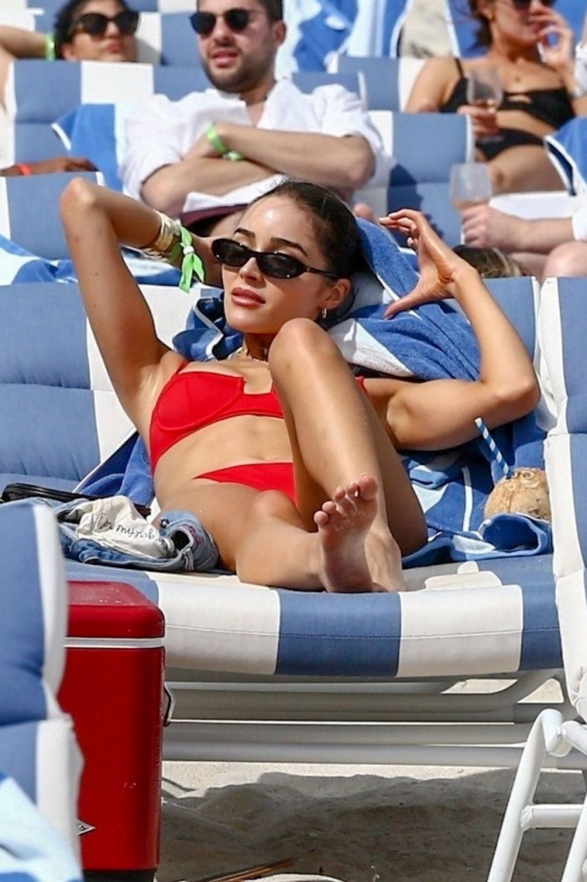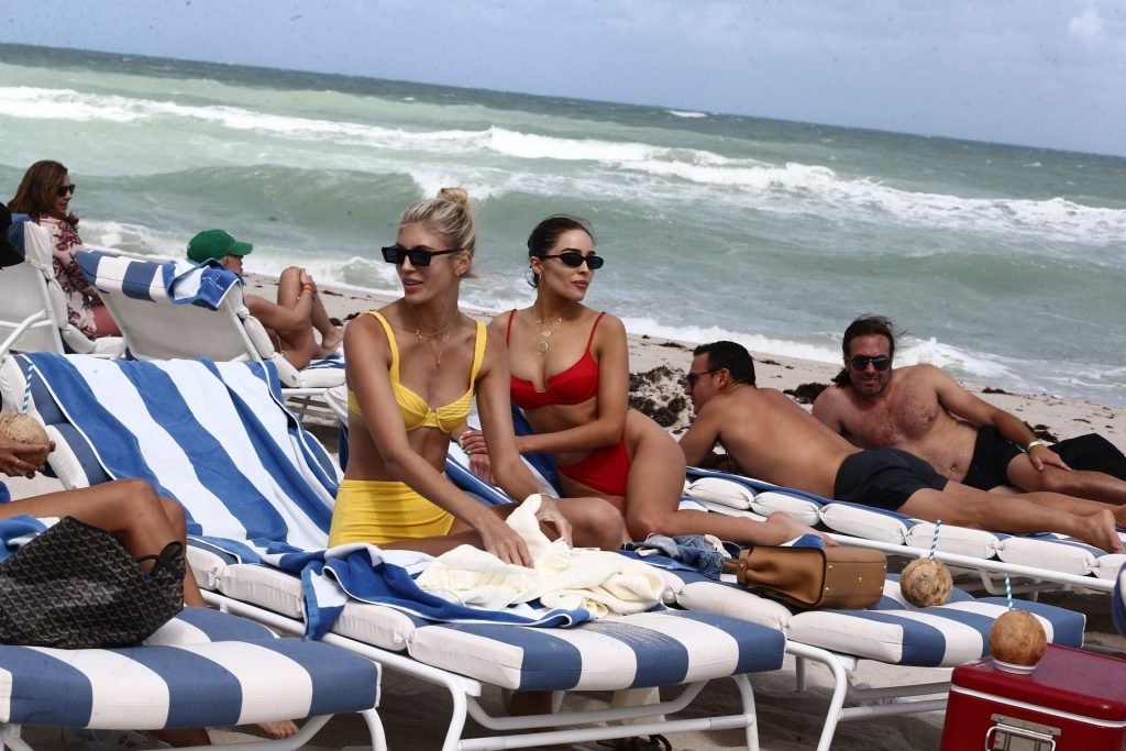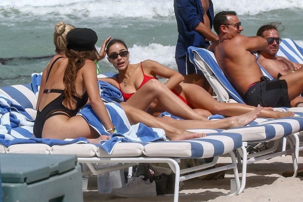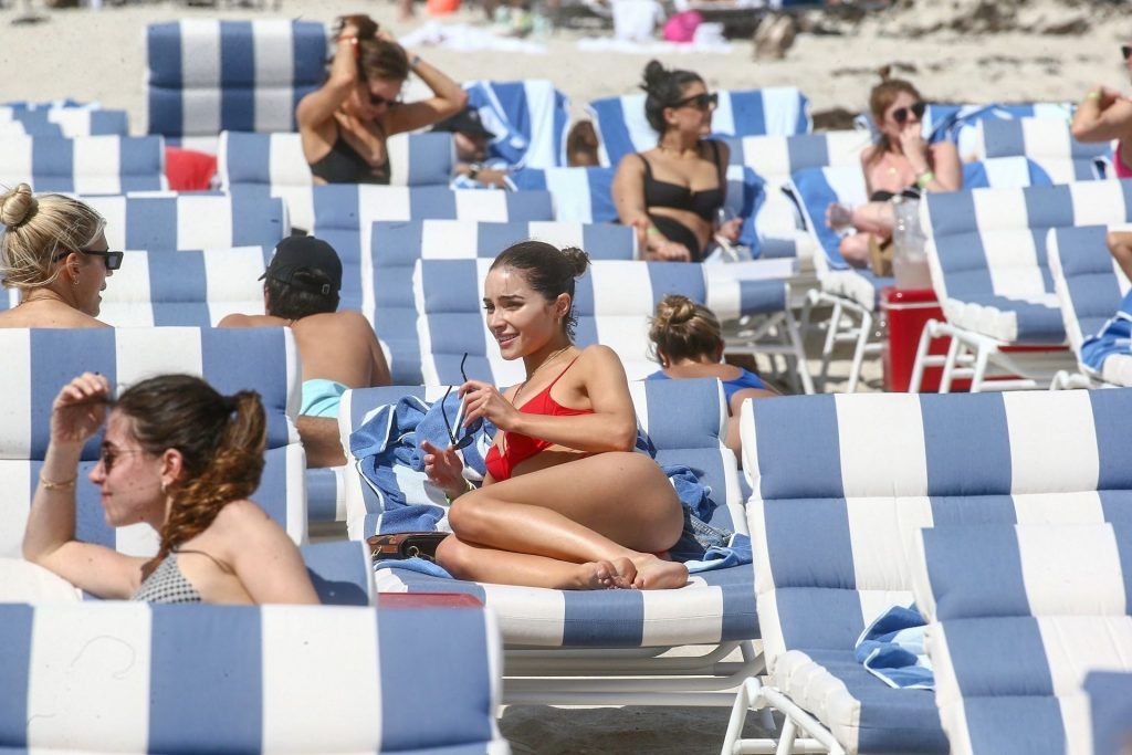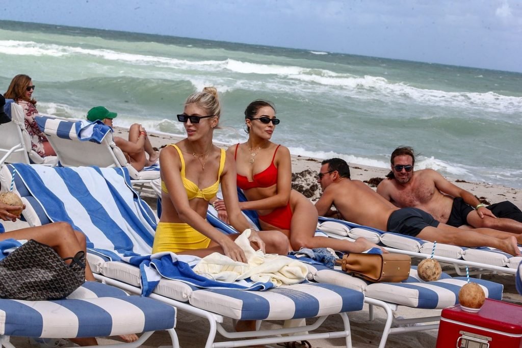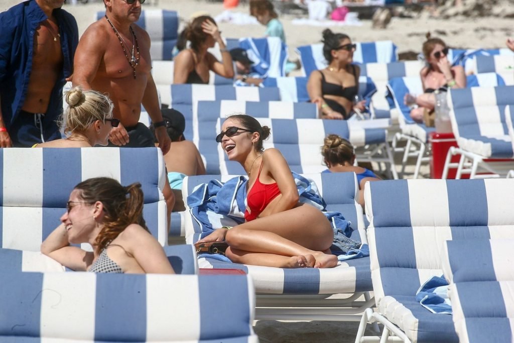 Las dos atraen bastante atención luciendo bikinis brillantes y escasos. Olivia lleva un bikini rojo de dos piezas mientras se recuesta en una silla de playa, mientras que Devon se pone un traje de baño amarillo para la diversión junto a la playa.