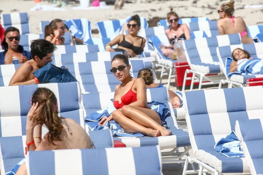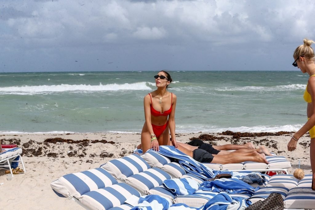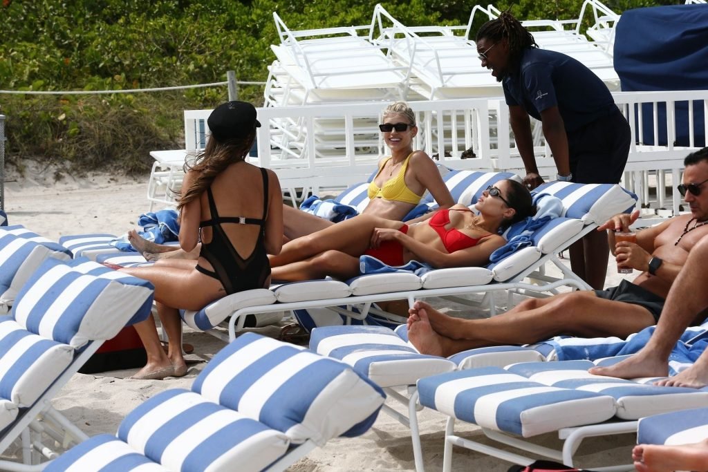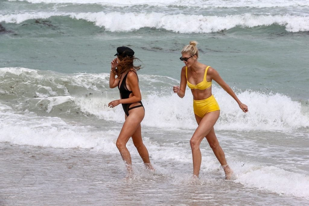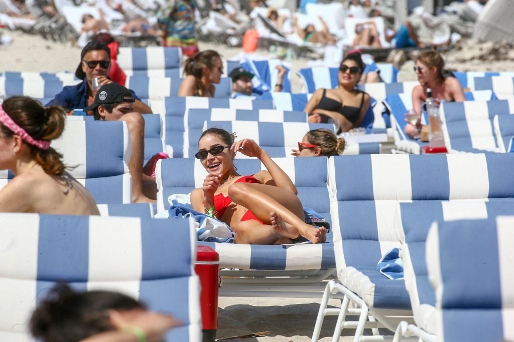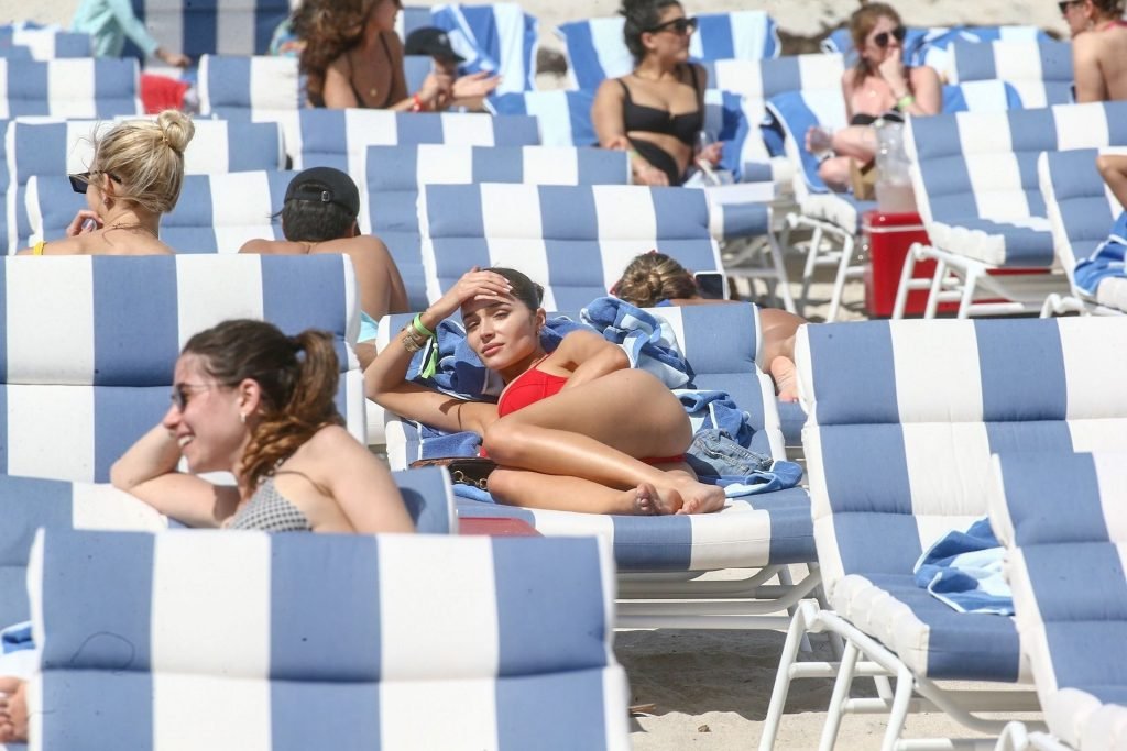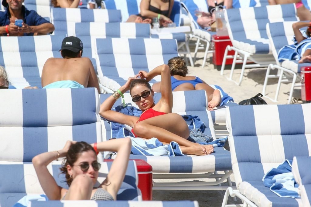 Las dos atraen bastante atención luciendo bikinis brillantes y escasos. Olivia lleva un bikini rojo de dos piezas mientras se recuesta en una silla de playa, mientras que Devon se pone un traje de baño amarillo para la diversión junto a la playa.