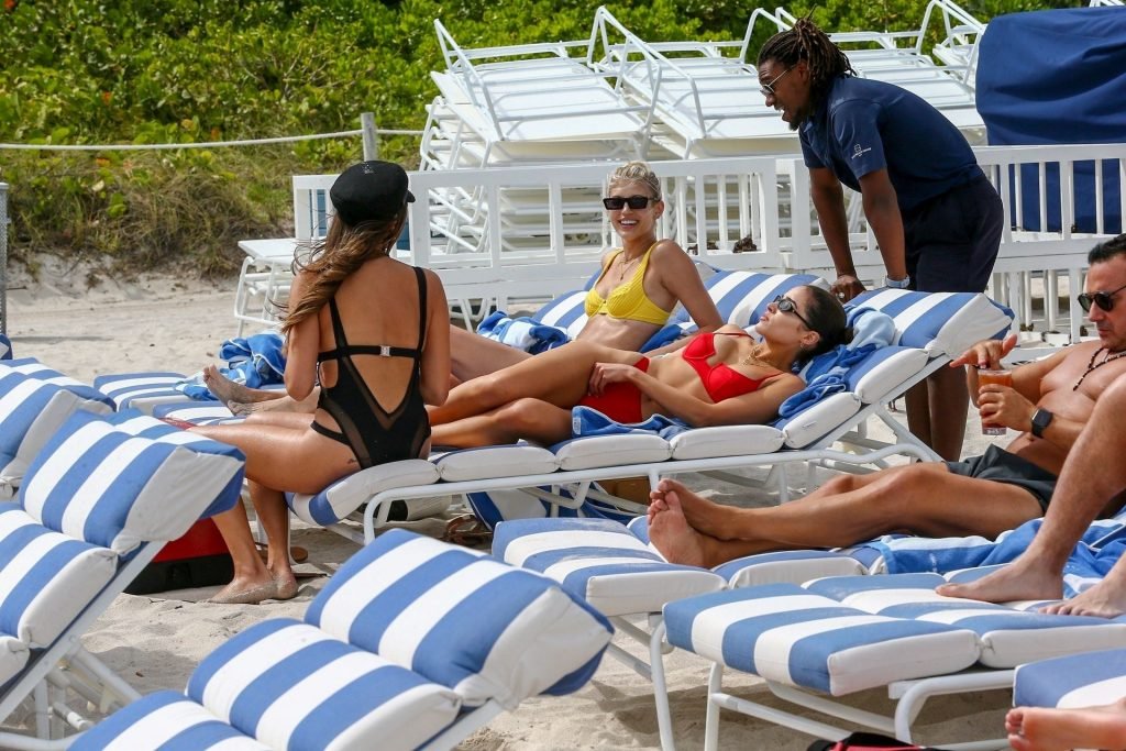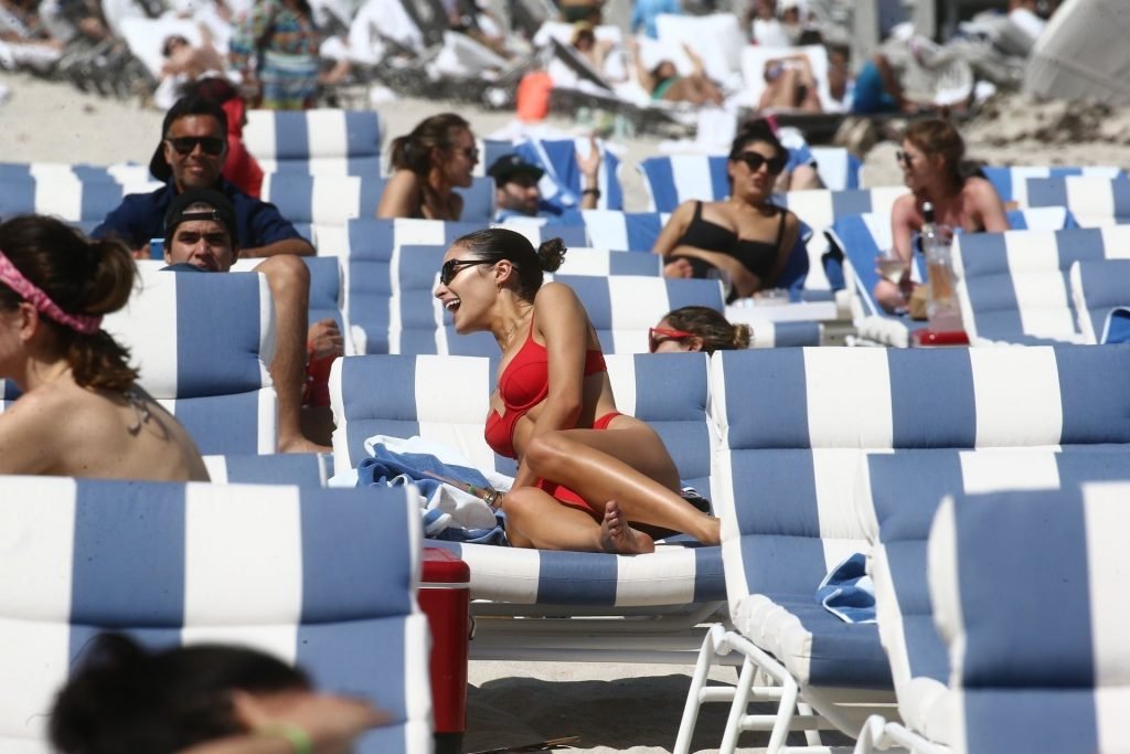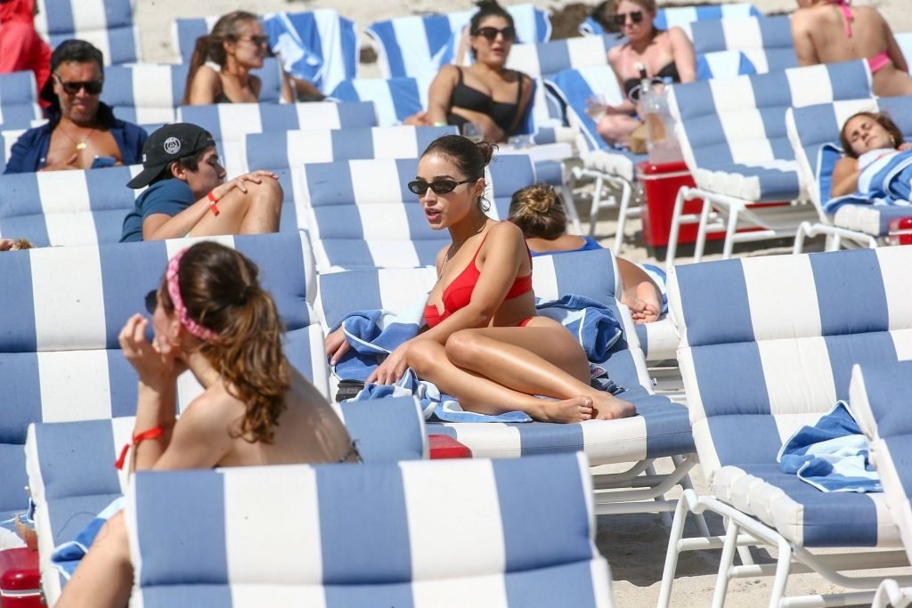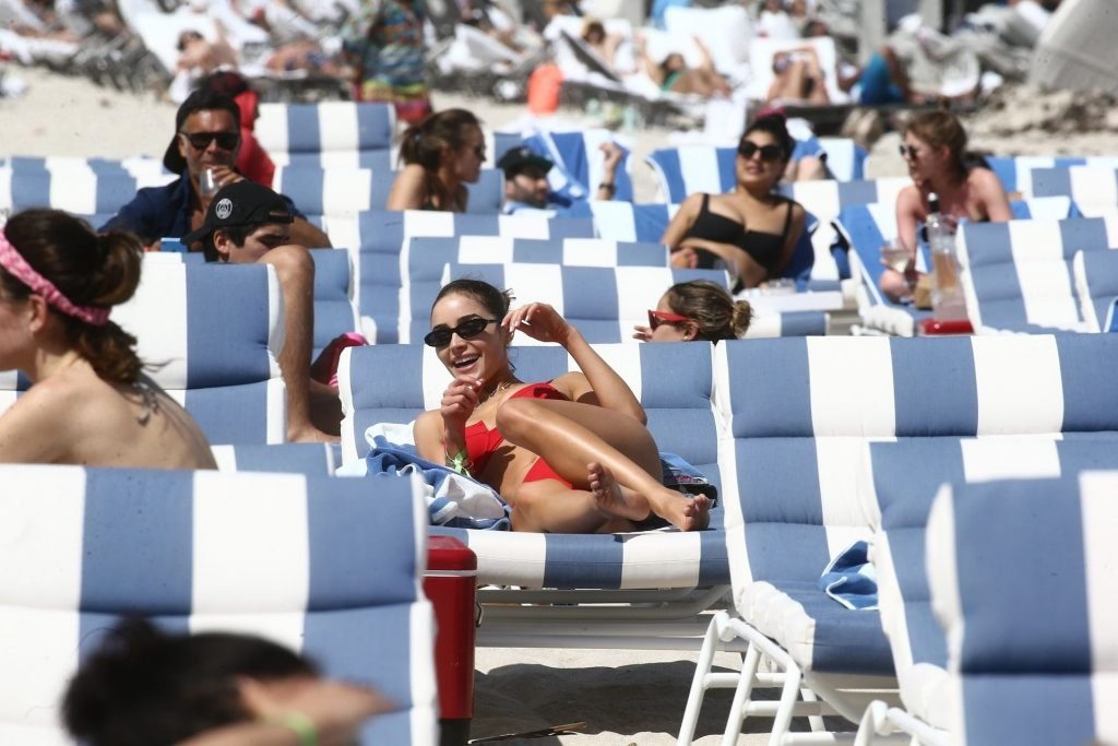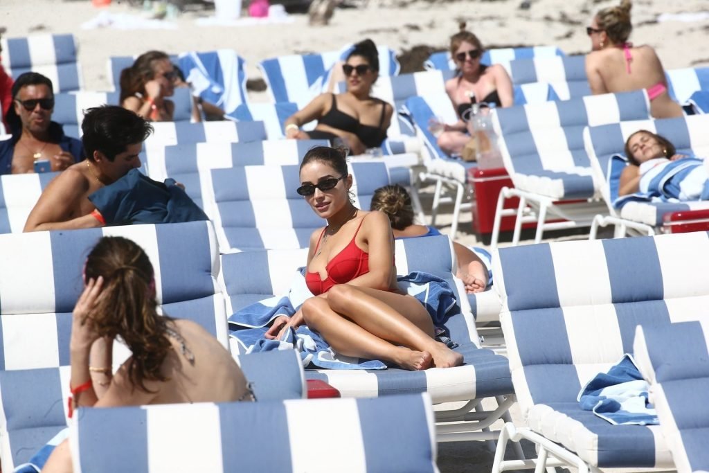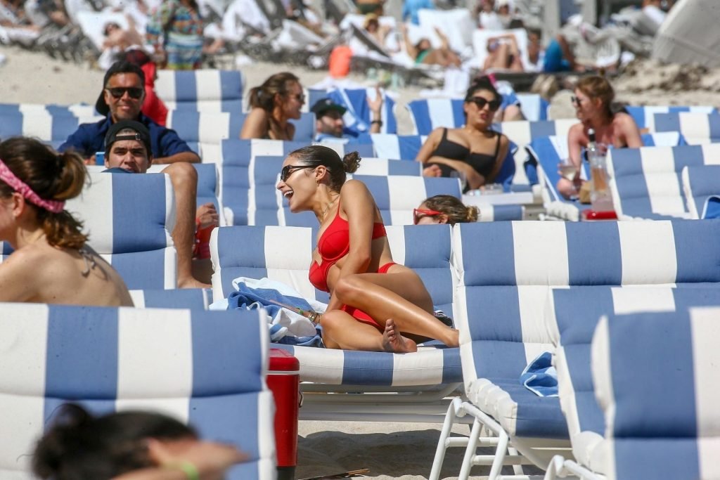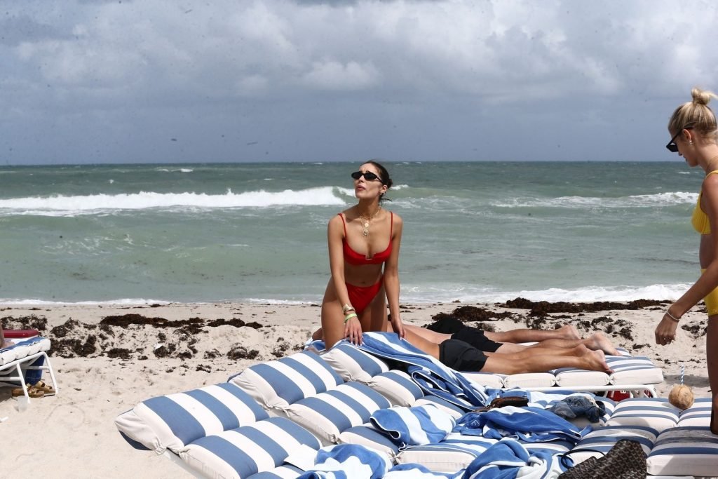 Las dos atraen bastante atención luciendo bikinis brillantes y escasos. Olivia lleva un bikini rojo de dos piezas mientras se recuesta en una silla de playa, mientras que Devon se pone un traje de baño amarillo para la diversión junto a la playa.