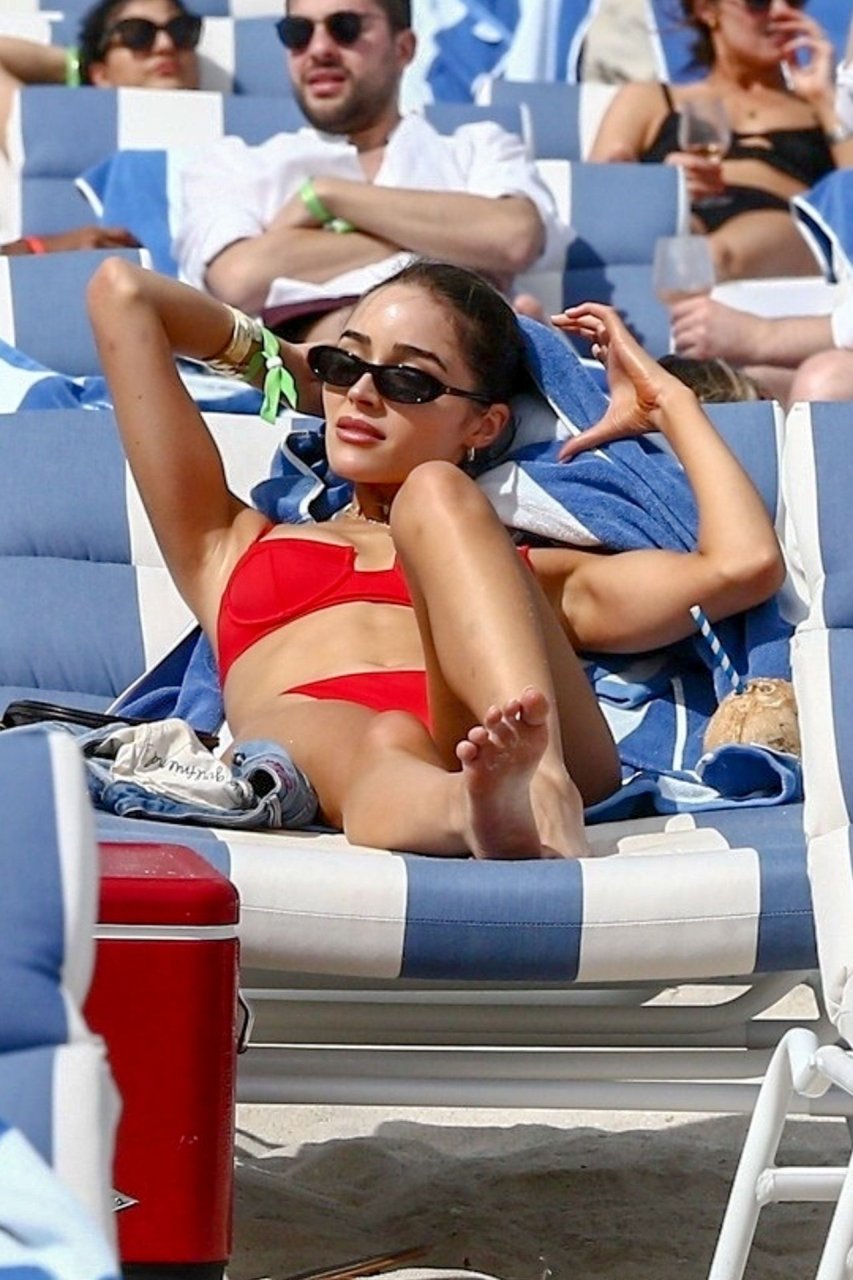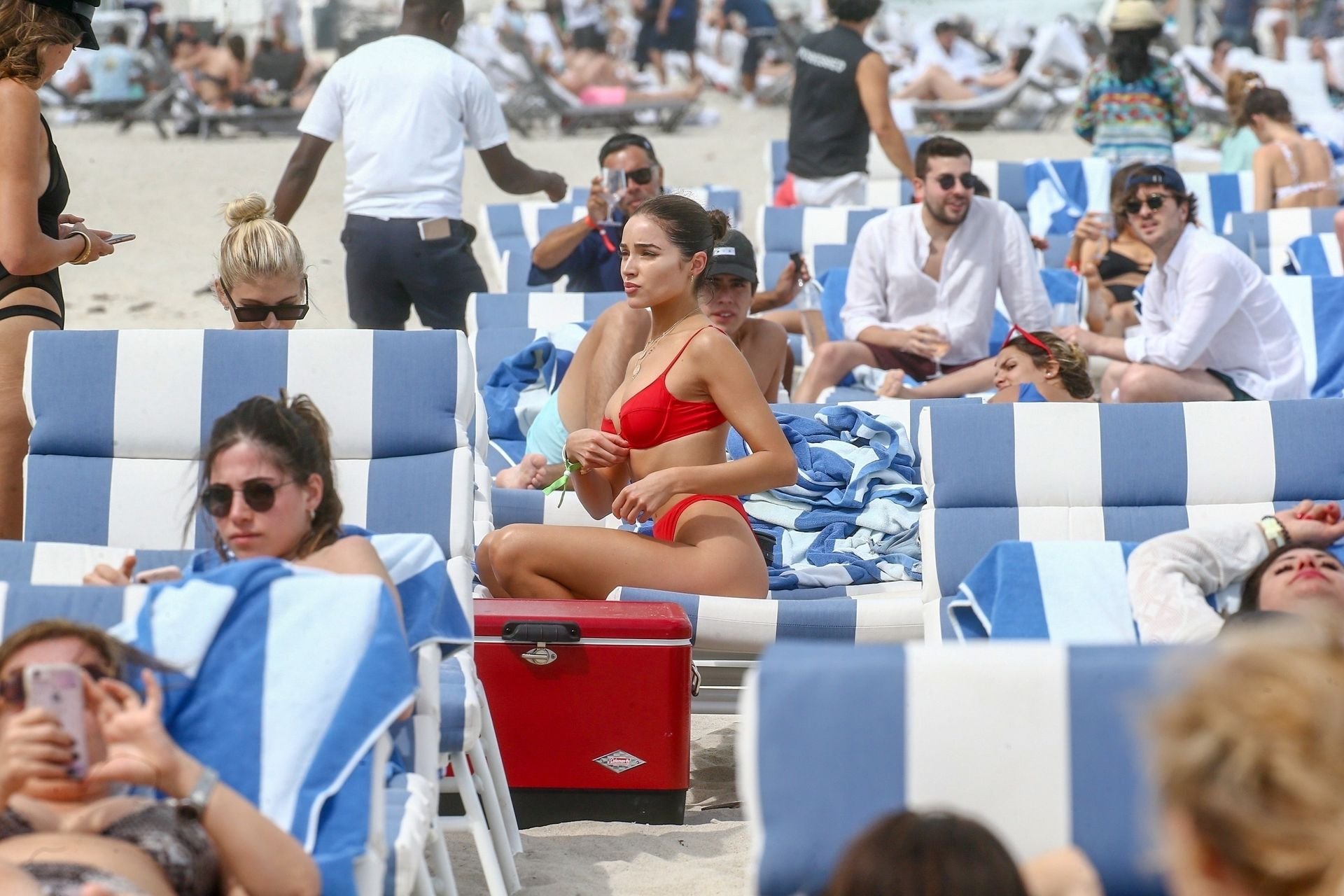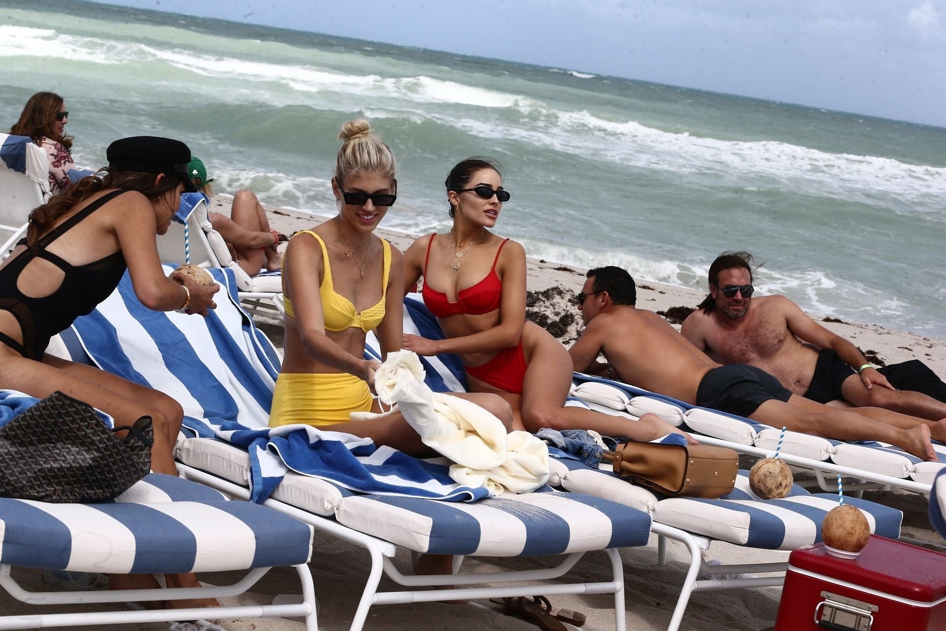 Las dos atraen bastante atención luciendo bikinis brillantes y escasos. Olivia lleva un bikini rojo de dos piezas mientras se recuesta en una silla de playa, mientras que Devon se pone un traje de baño amarillo para la diversión junto a la playa.