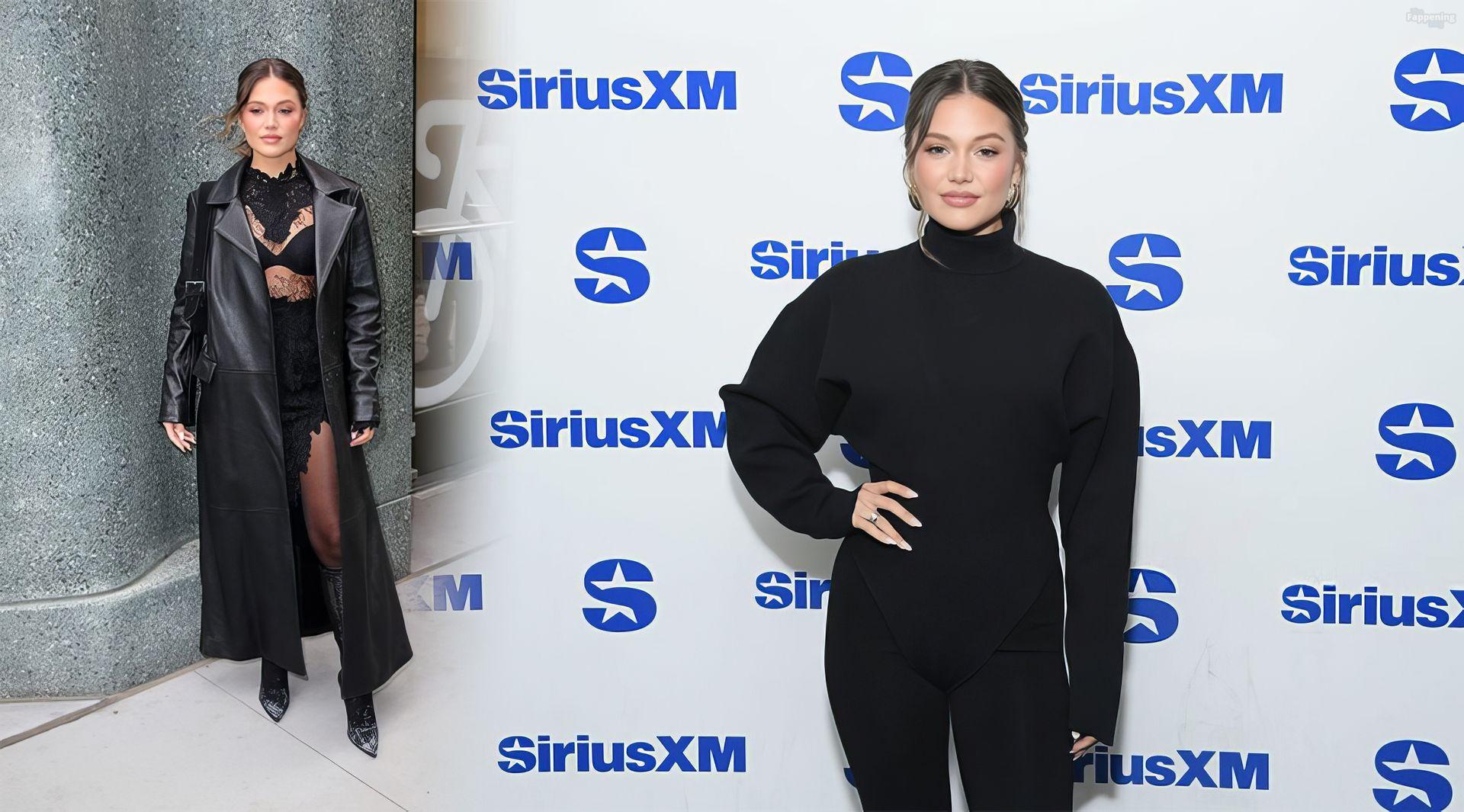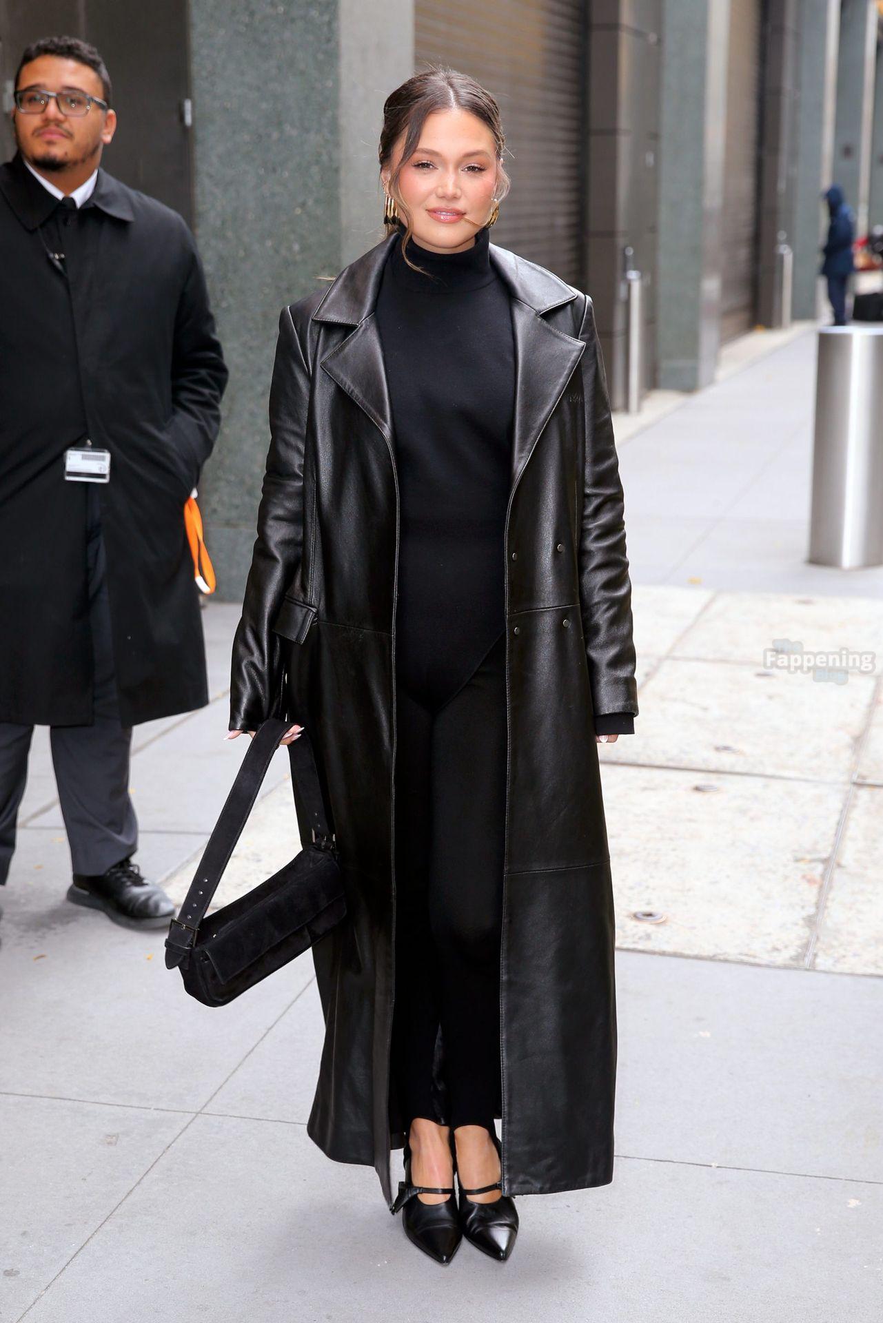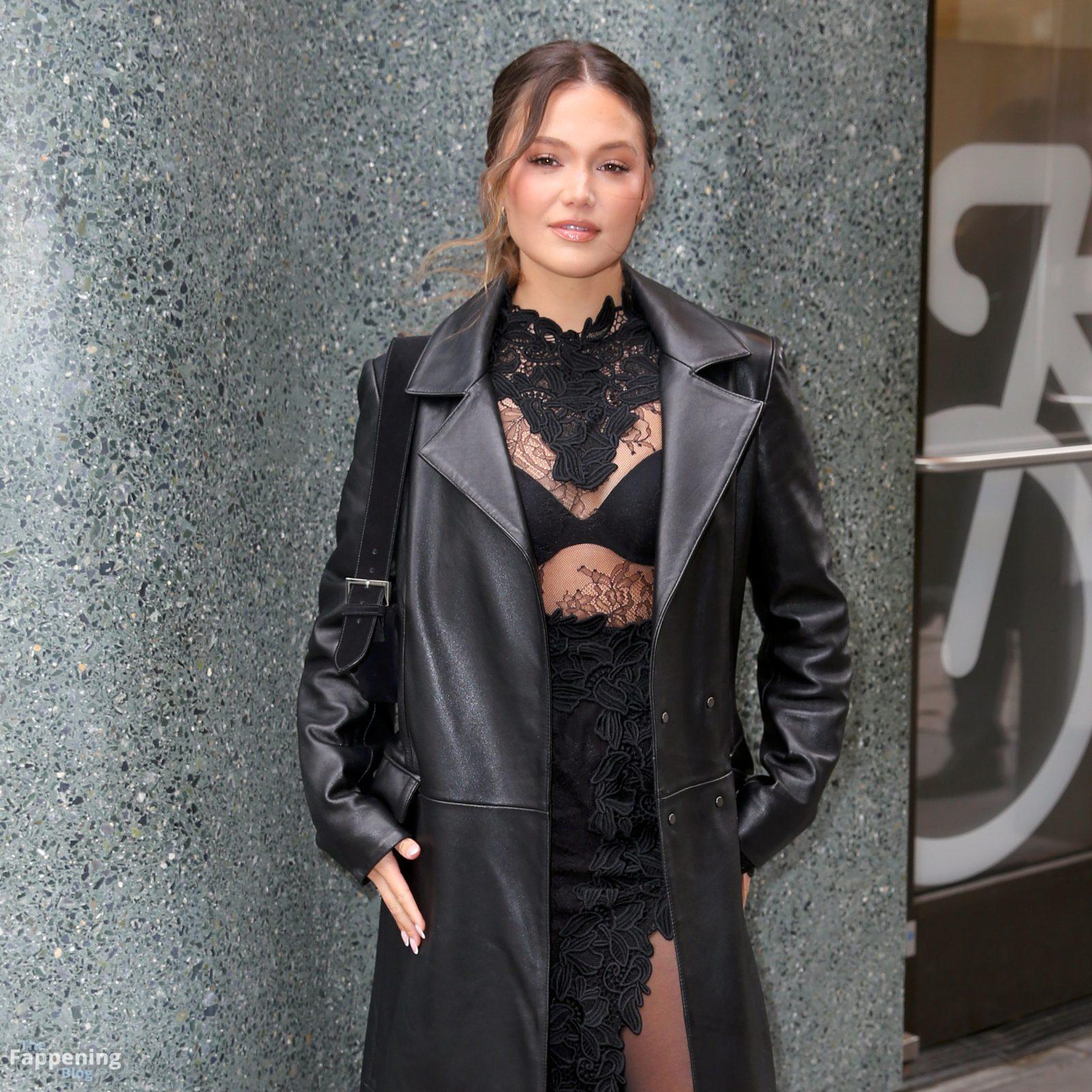 Olivia Holt deslumbra en Nueva York, caminando con un body de encaje transparente y una gabardina de cuero negro. Mira sus piernas y escote en Live with Kelly & Mark en la ciudad de Nueva York.