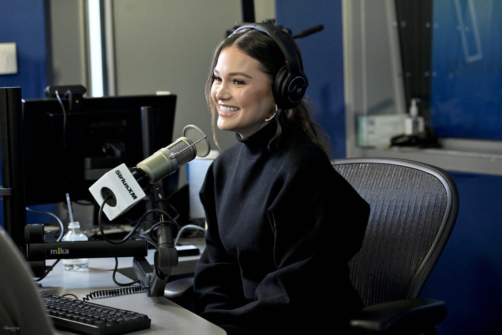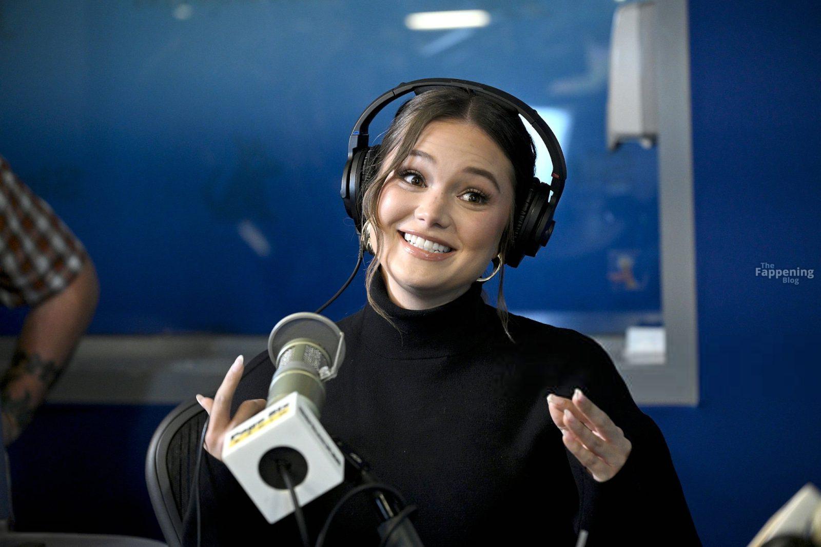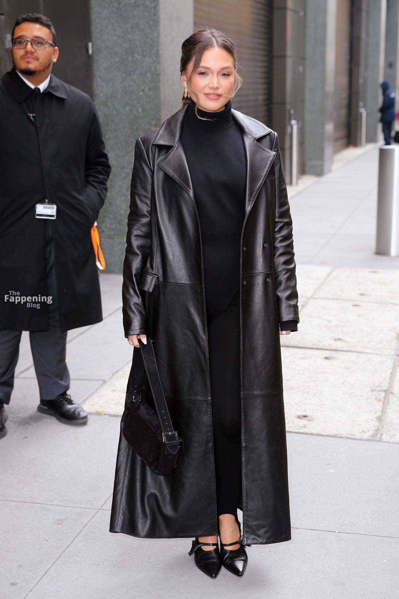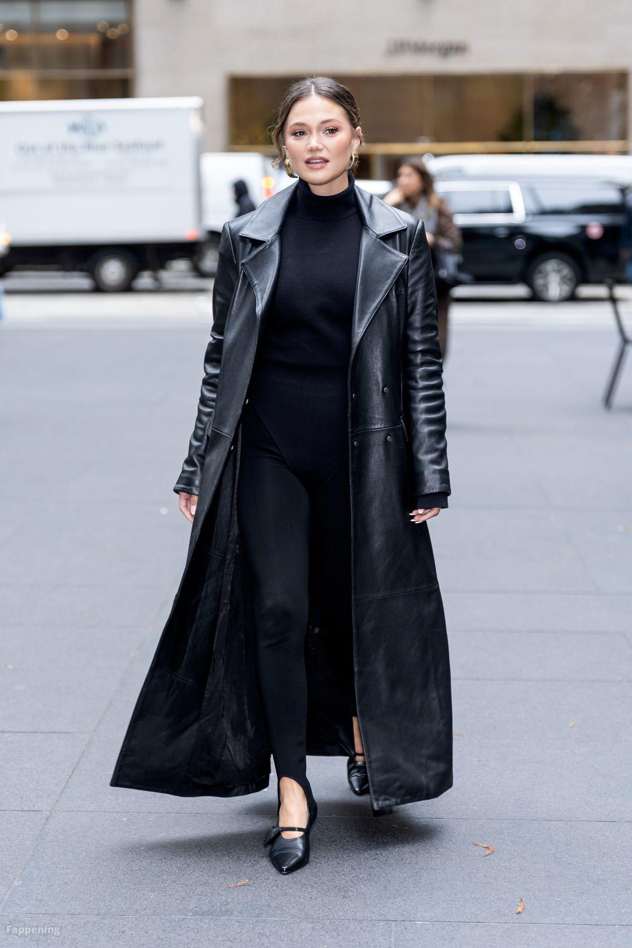 Olivia Holt deslumbra en Nueva York, caminando con un body de encaje transparente y una gabardina de cuero negro. Mira sus piernas y escote en Live with Kelly & Mark en la ciudad de Nueva York.