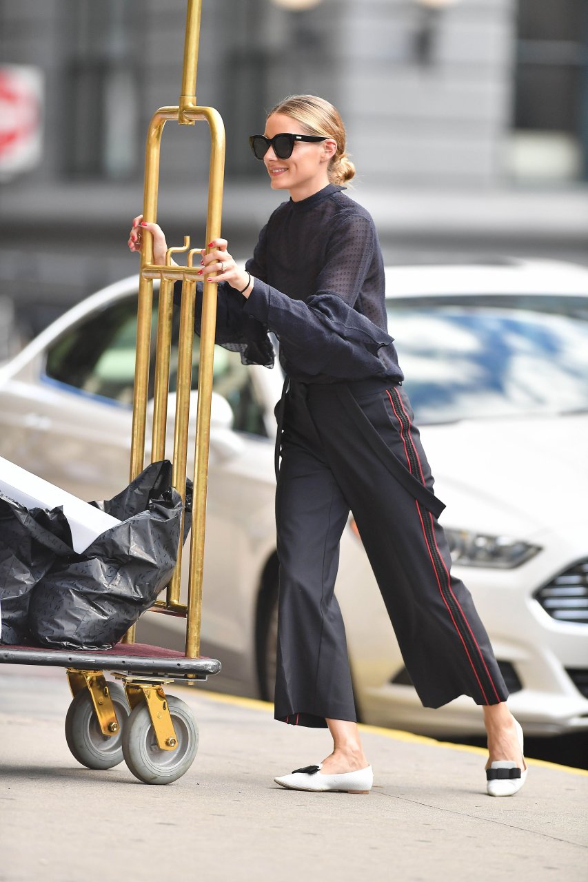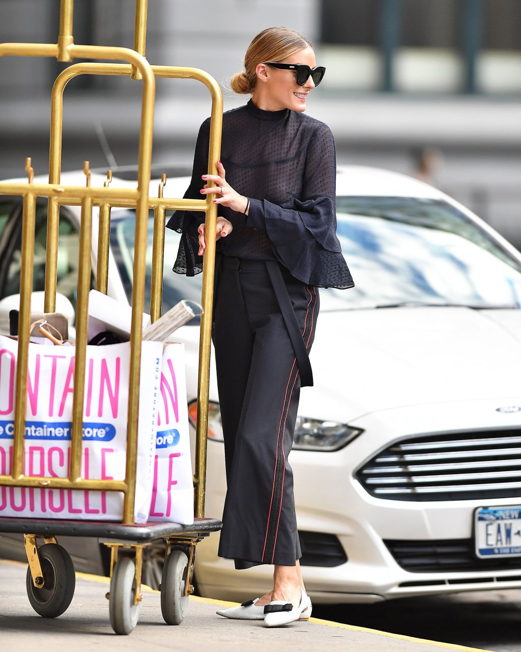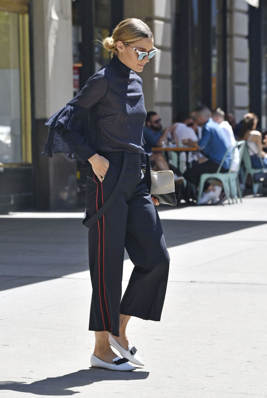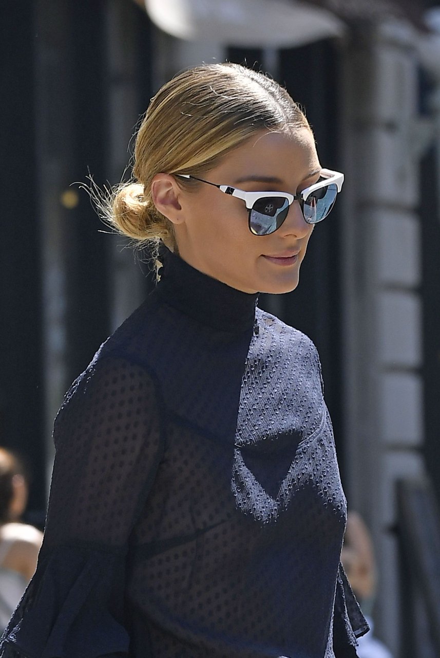 Olivia Palermo lleva una blusa negra transparente con cubrepezones mientras sale de su apartamento en Brooklyn, 17/08/2016. Olivia Palermo es una socialité estadounidense. Edad: 30 (28 de febrero de 1986).