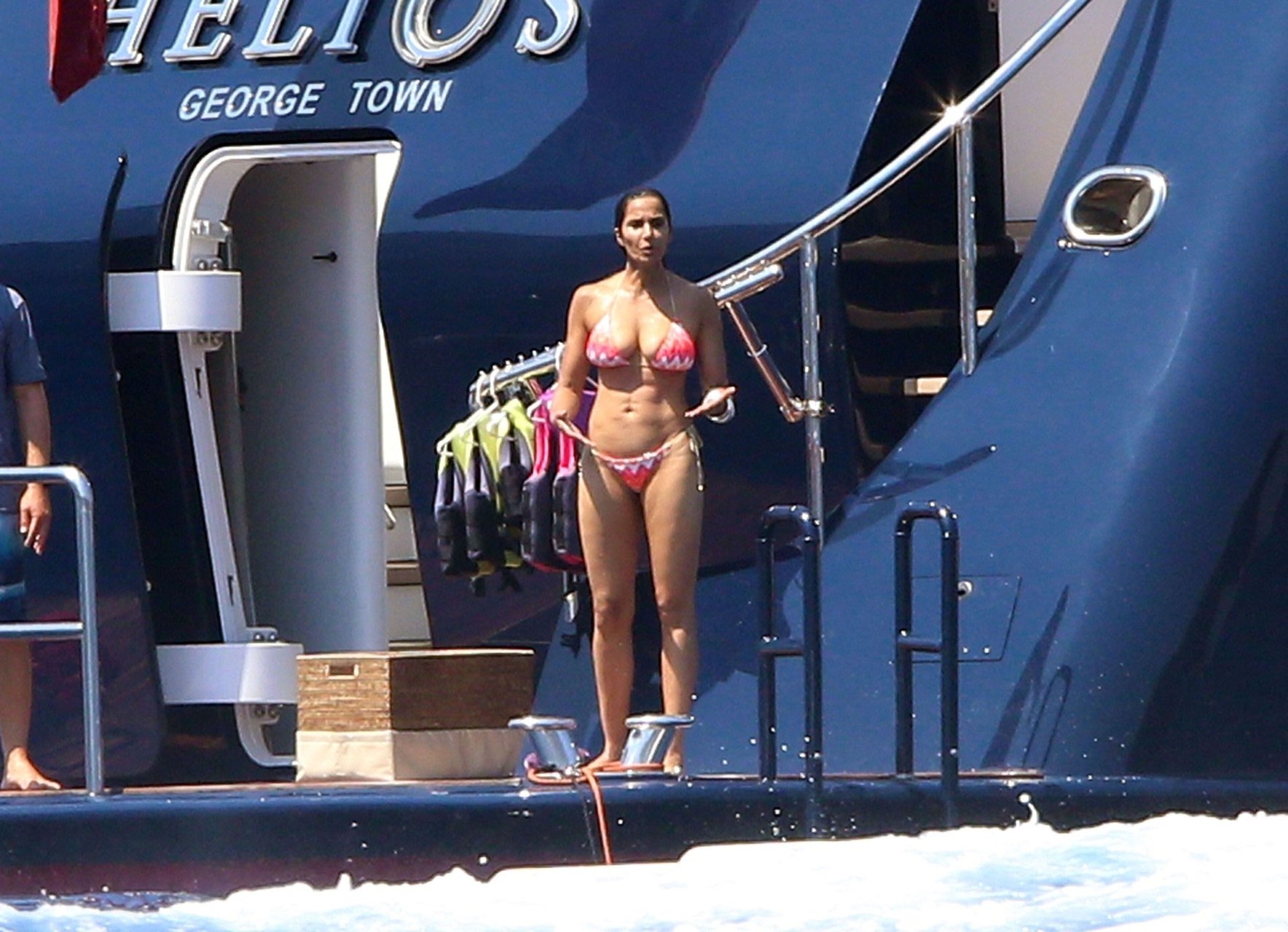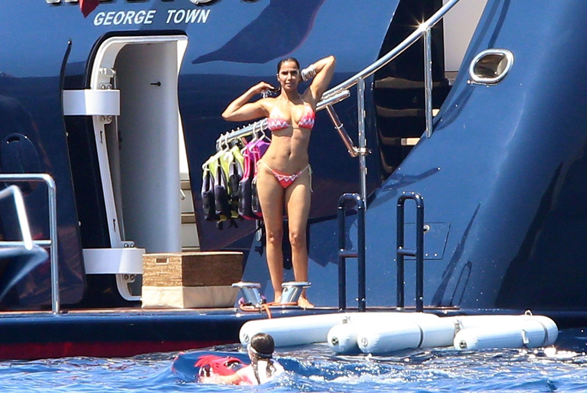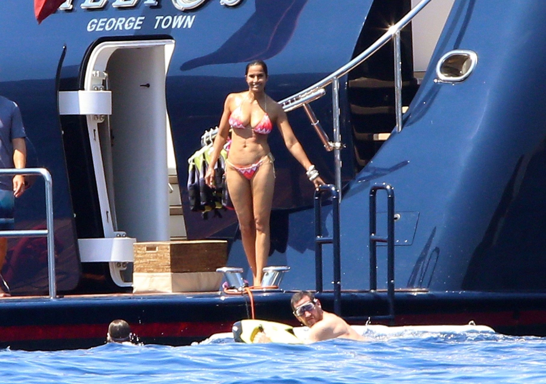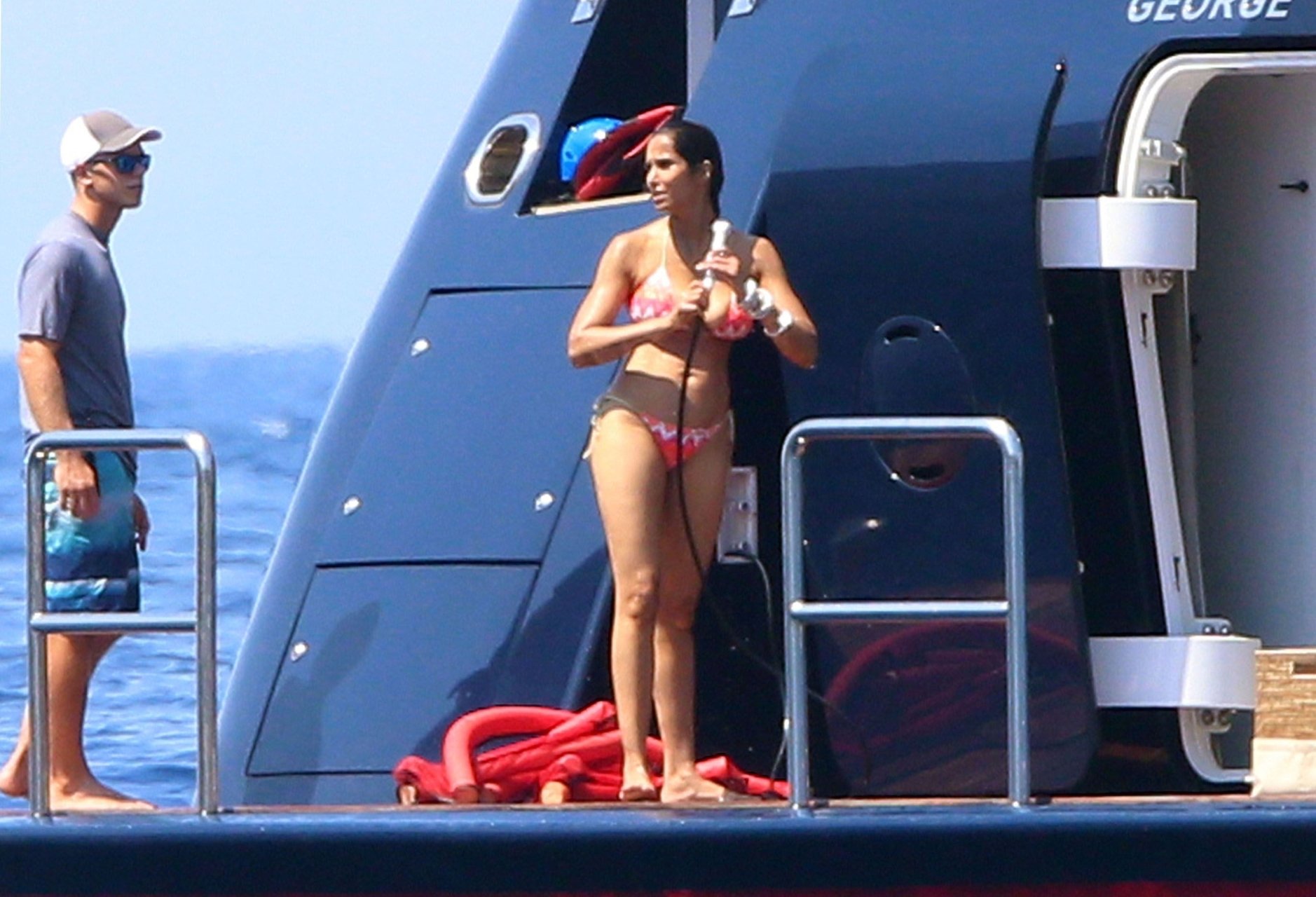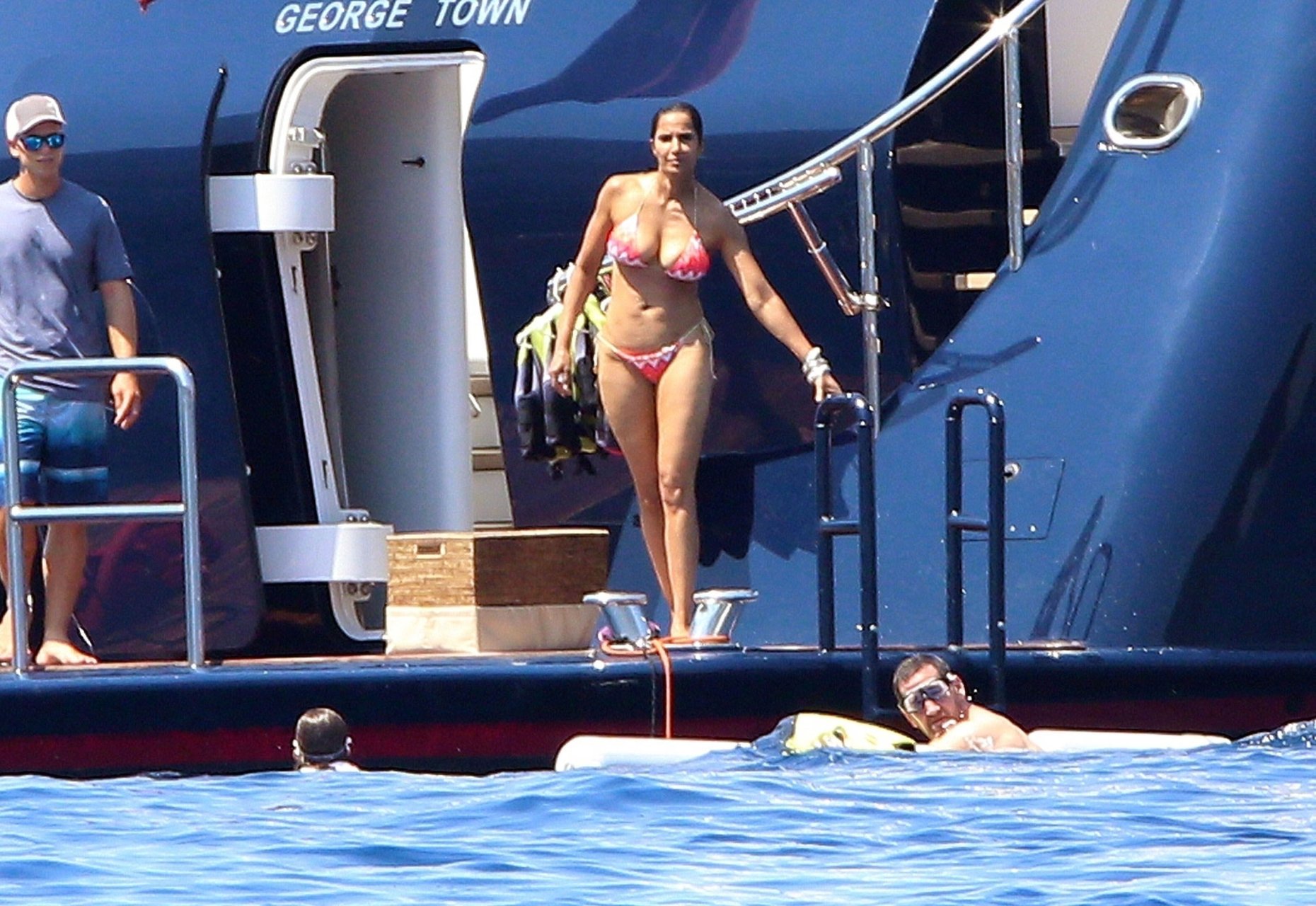 La ex esposa del controvertido autor Salman Rushdie estaba sonriendo en su lujoso yate mientras se daba un baño en el cálido mar con su pareja Adam Dell.