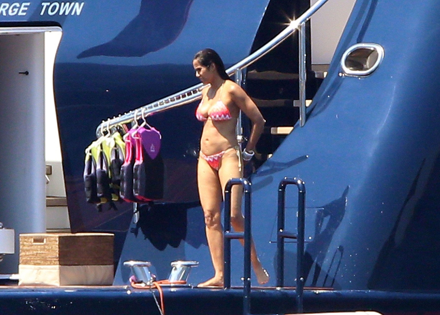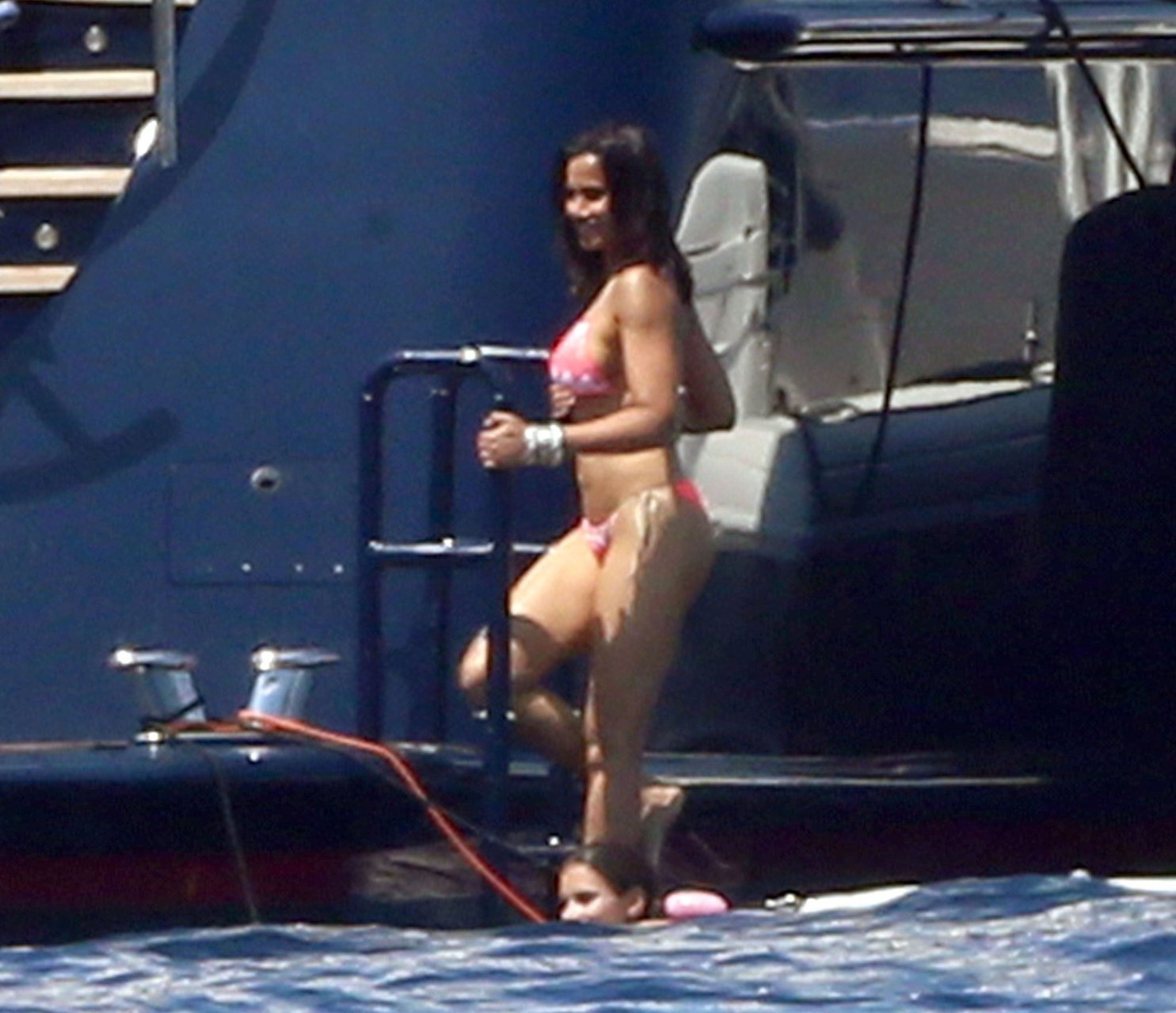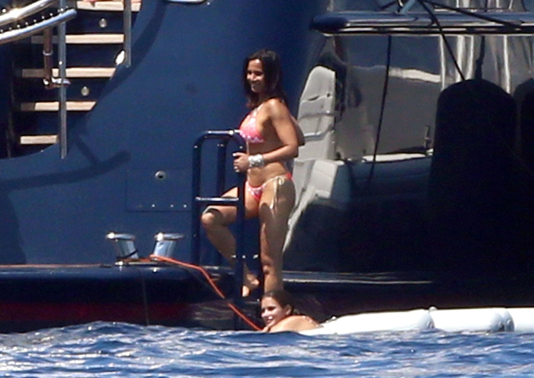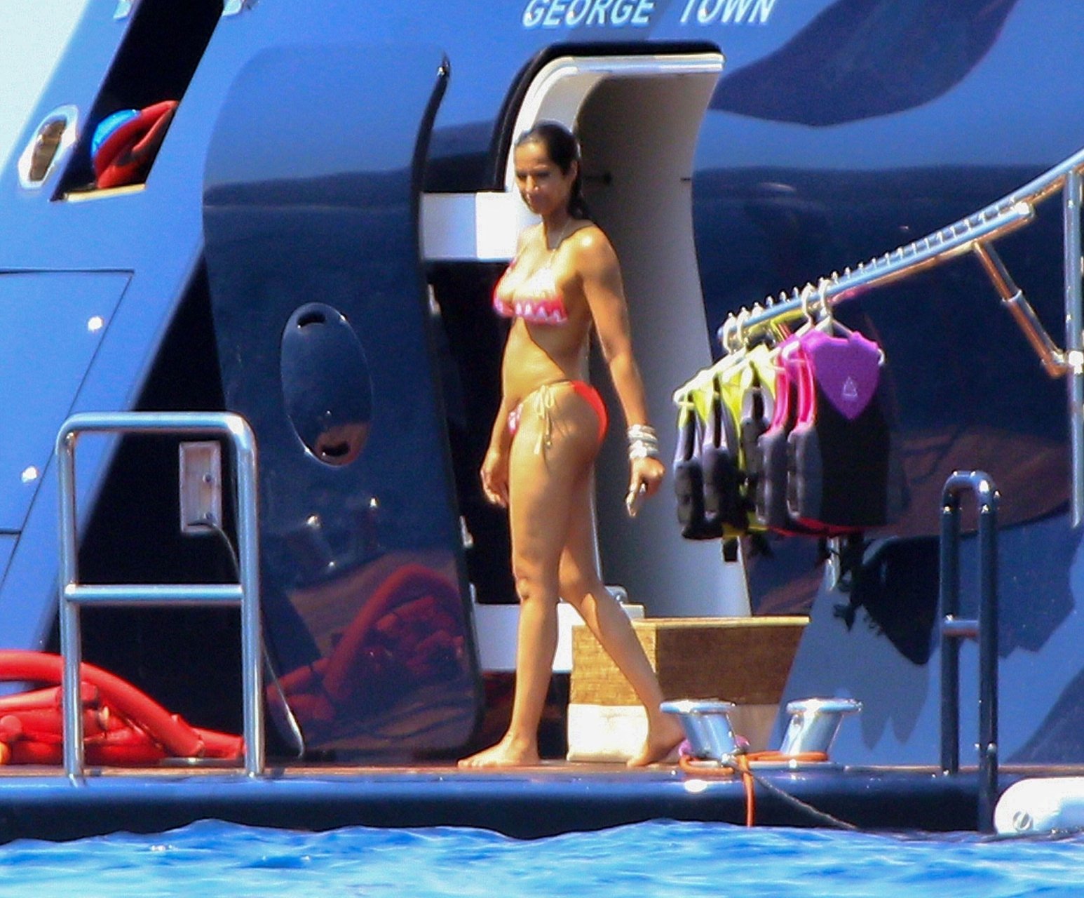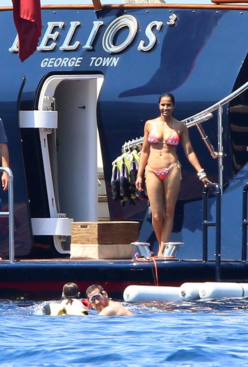 La ex esposa del controvertido autor Salman Rushdie estaba sonriendo en su lujoso yate mientras se daba un baño en el cálido mar con su pareja Adam Dell.
