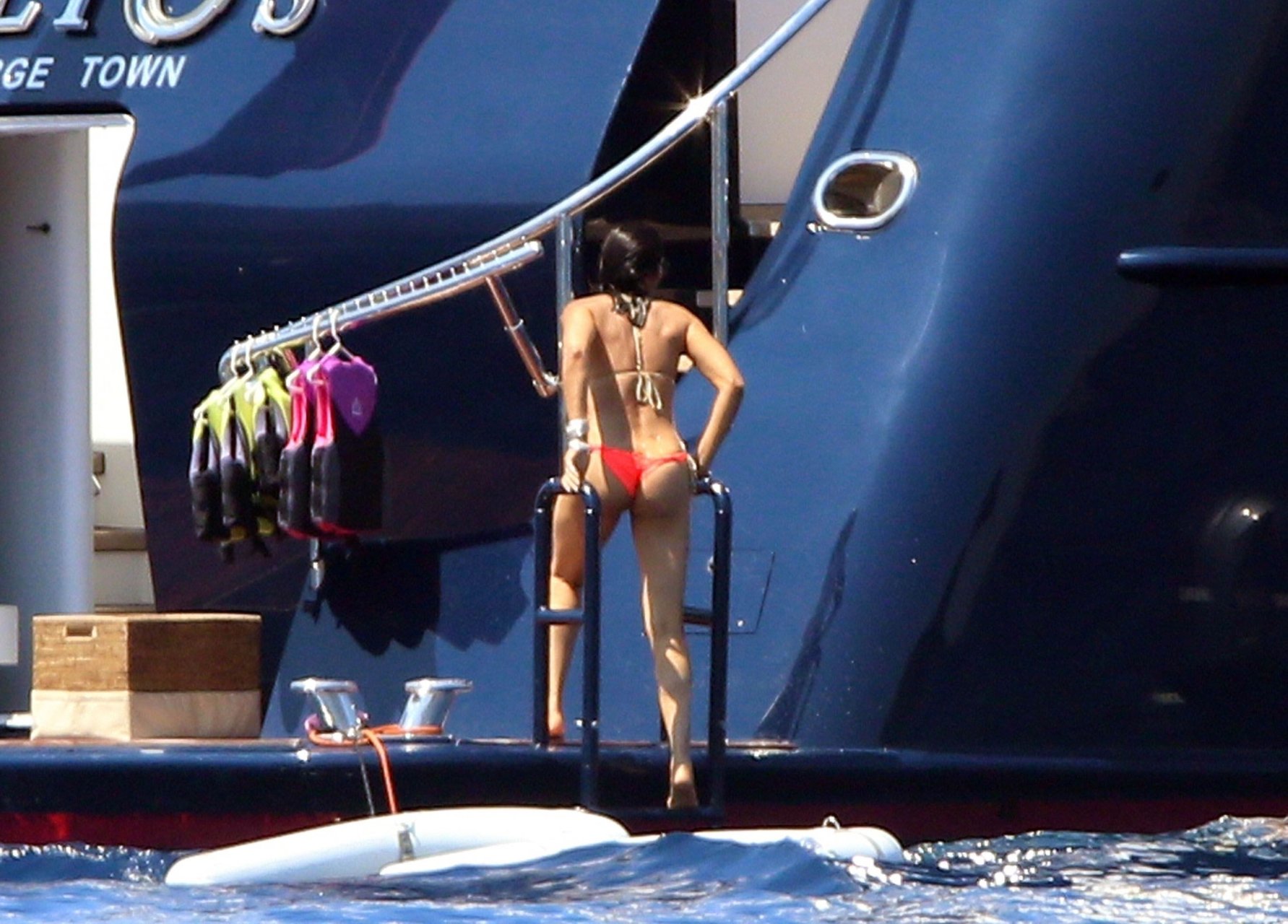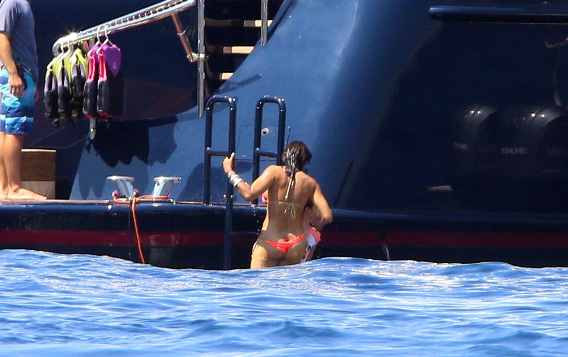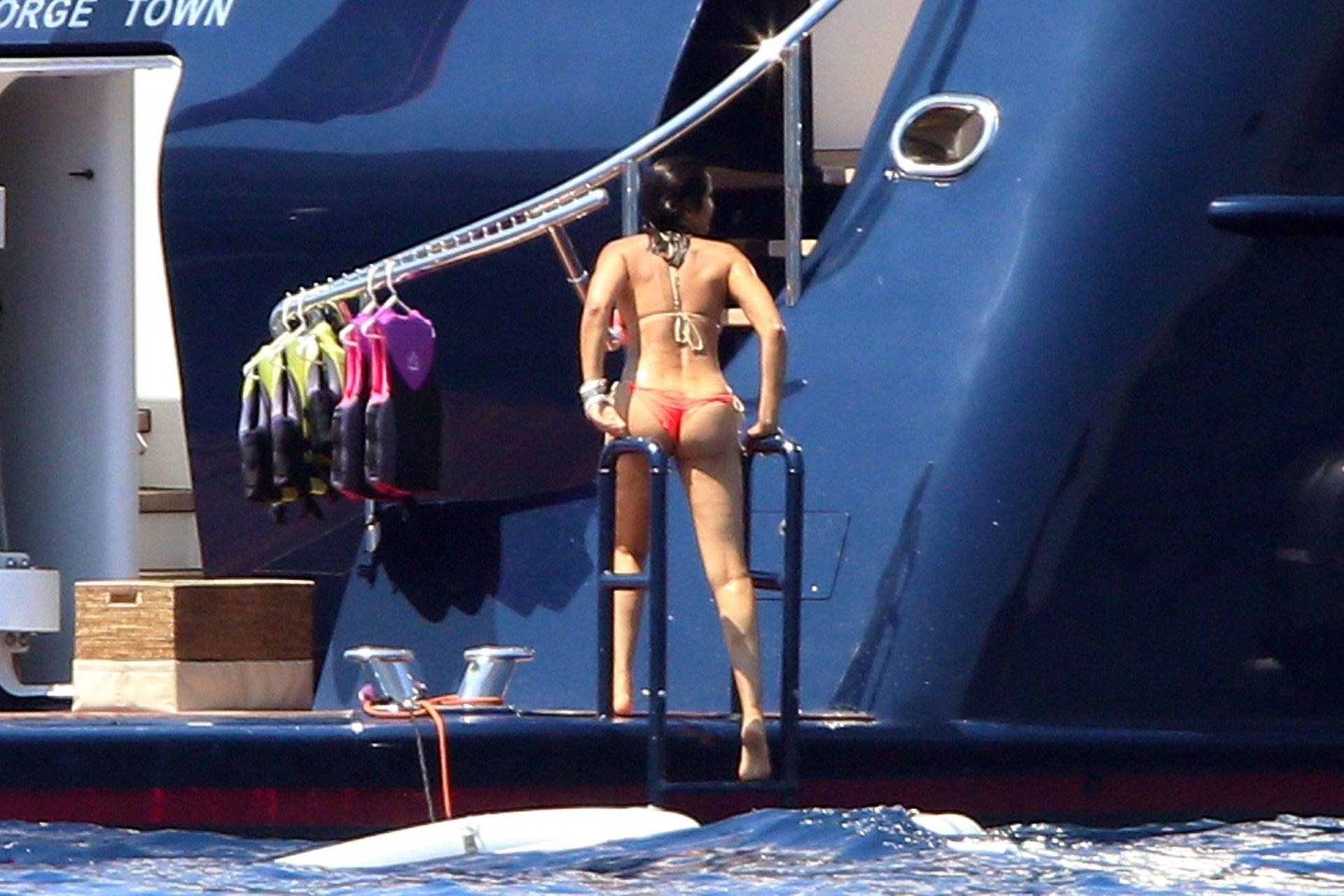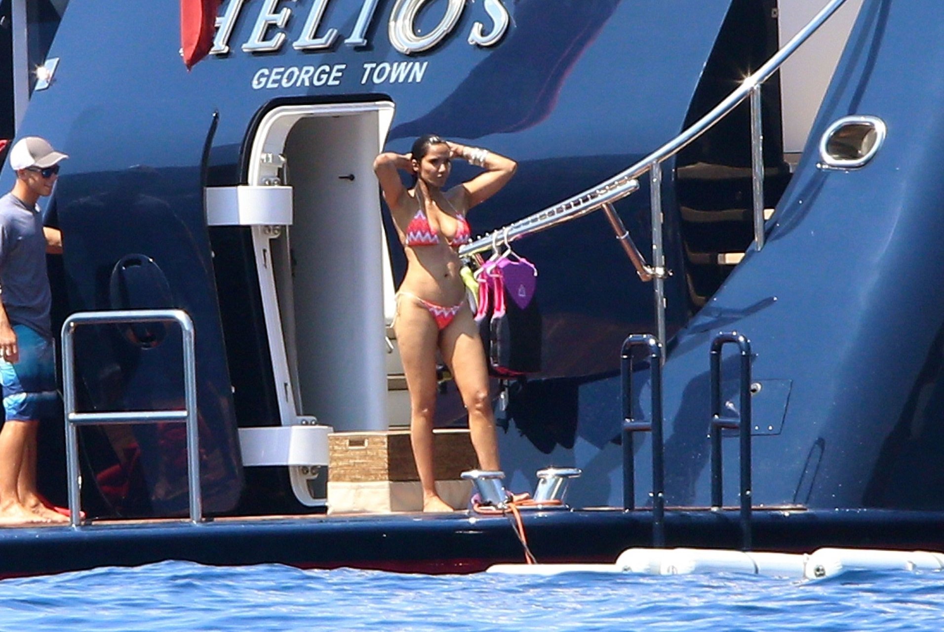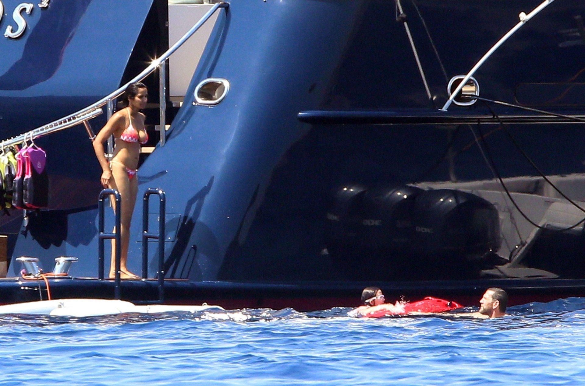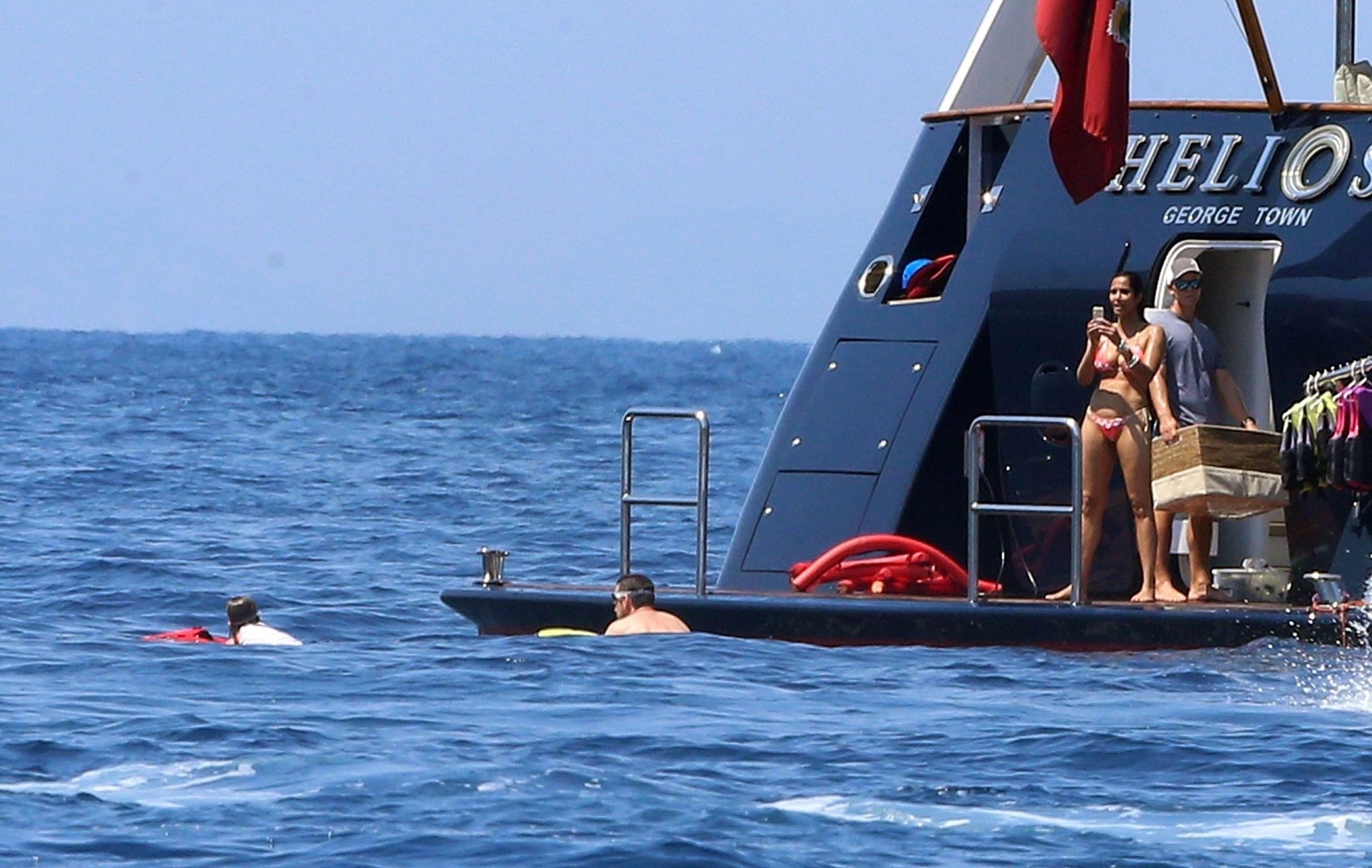 La ex esposa del controvertido autor Salman Rushdie estaba sonriendo en su lujoso yate mientras se daba un baño en el cálido mar con su pareja Adam Dell.