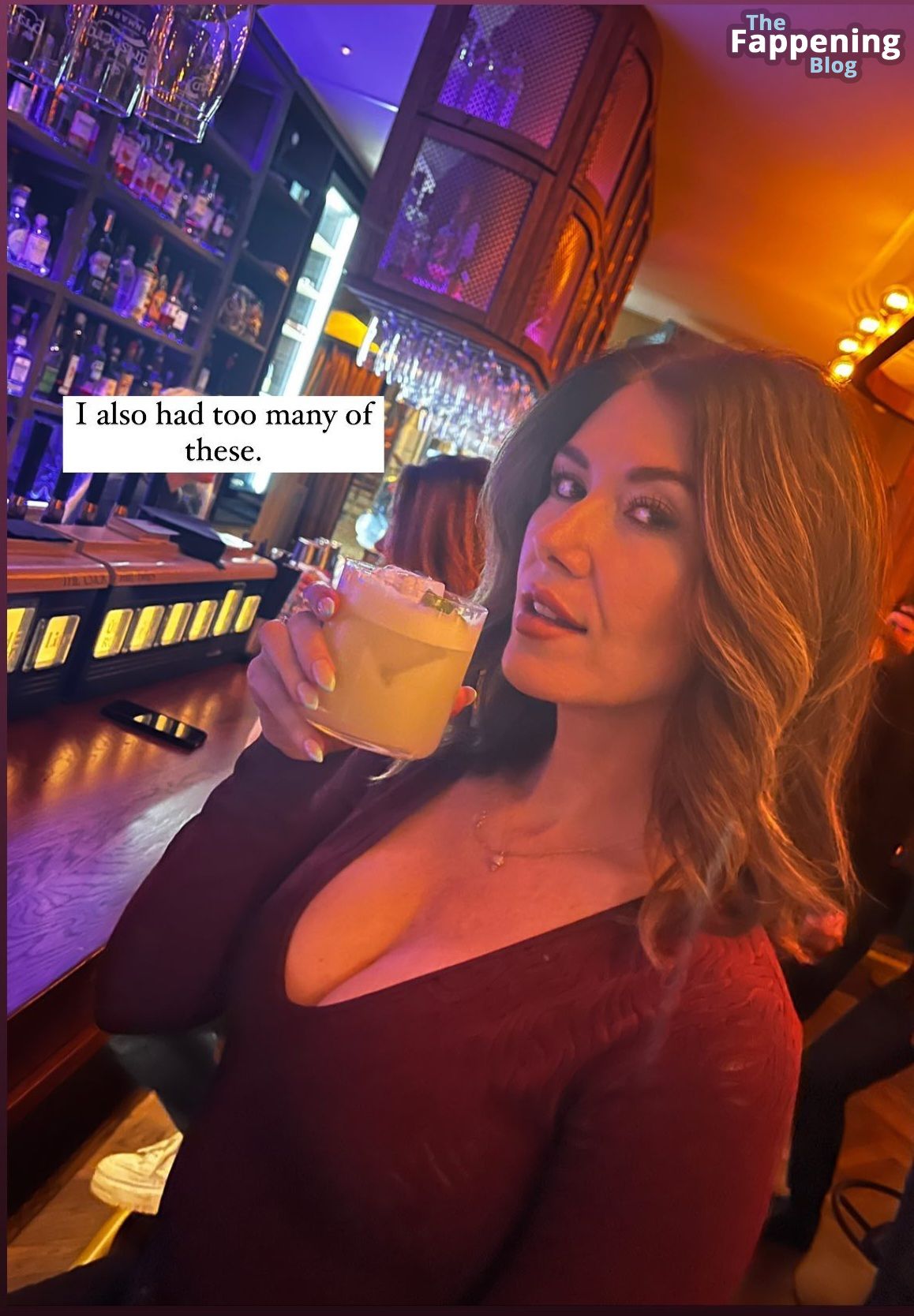 Jewel Staite luce un escote increíble, mostrando su generoso busto en un top sexy mientras disfruta de una bebida en un evento animado.