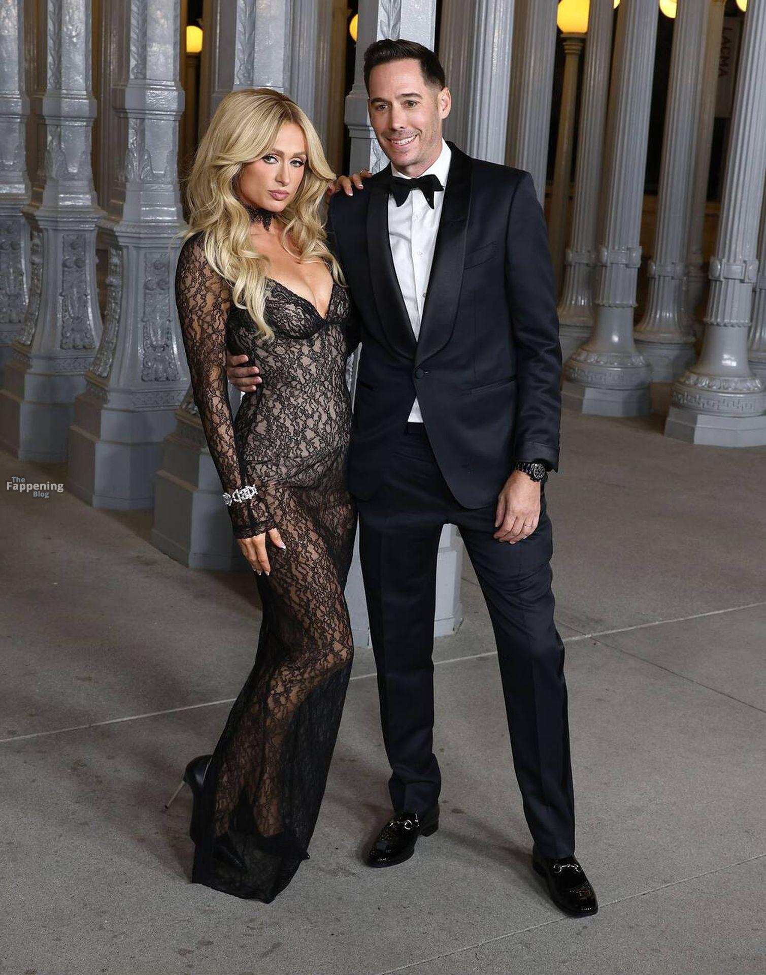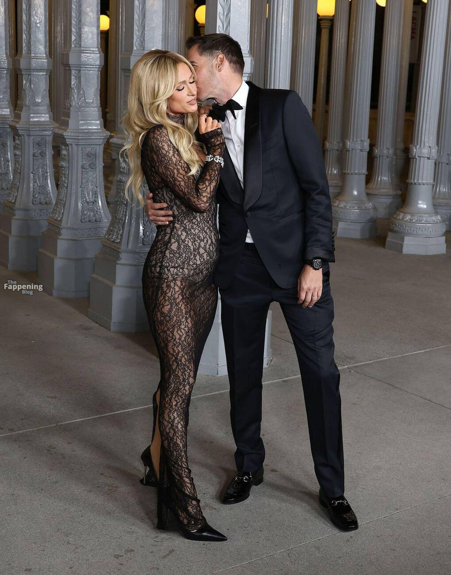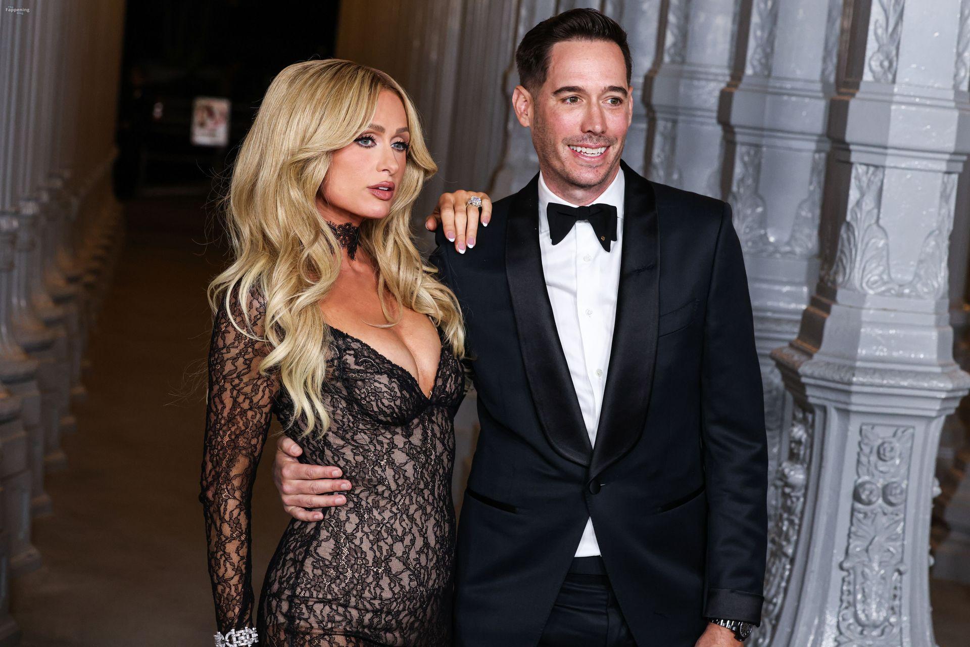 Paris Hilton apareció en la Gala Art+Film LACMA 2025 en Los Ángeles, California. Posó para fotos con su esposo, Carter Reum, con un vestido de encaje transparente con un escote en V pronunciado sobre un body color nude.