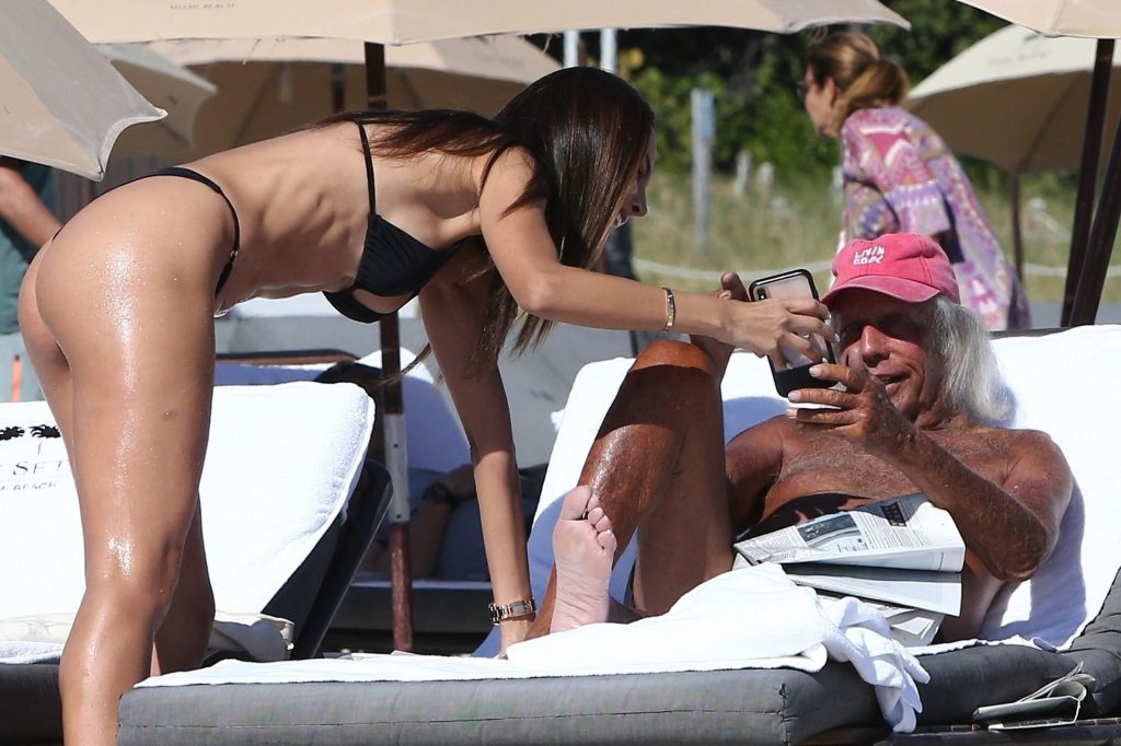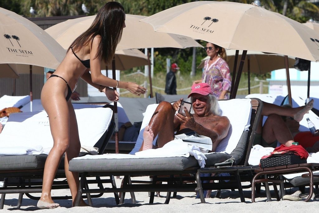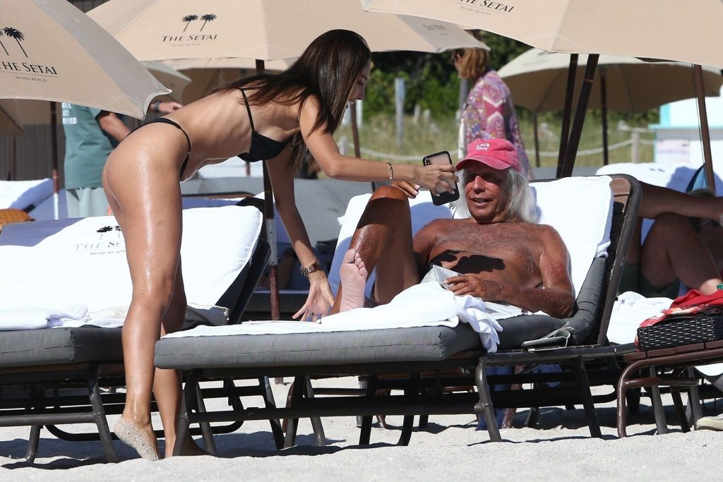 Patricia Contreras se da un rápido chapuzón en el agua mientras está en la playa con el “superfanático de la NBA” James Goldstein, quien se relaja en una silla de playa – Miami, 12/07/2019.