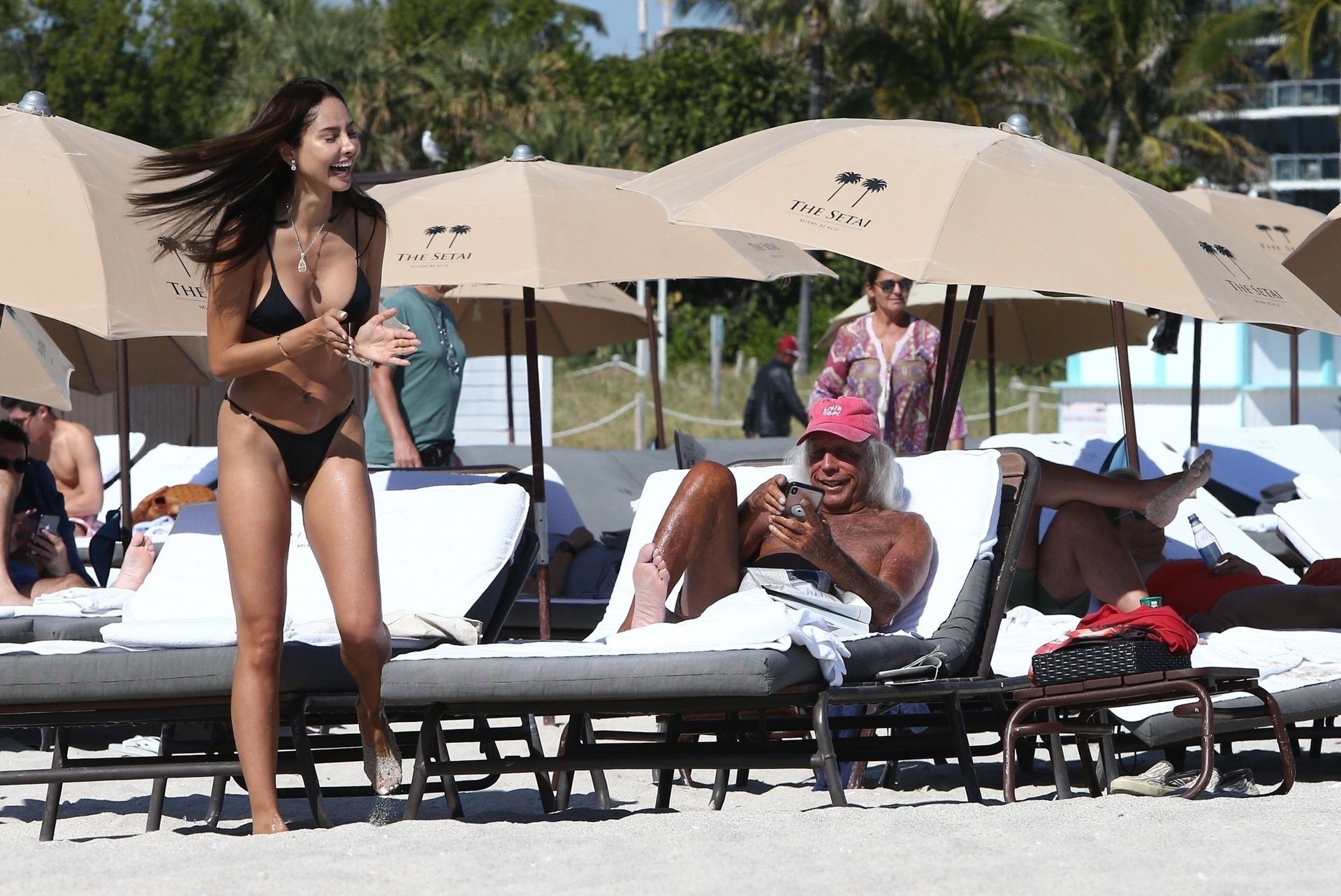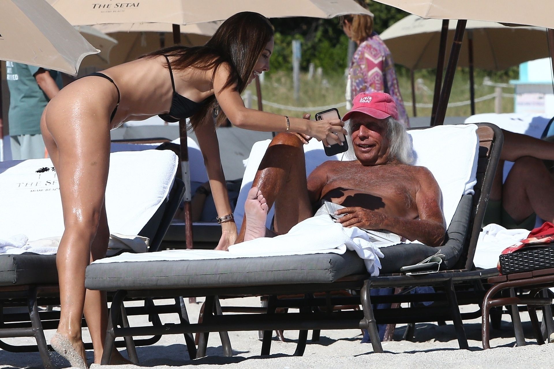 Patricia Contreras se da un rápido chapuzón en el agua mientras está en la playa con el “superfanático de la NBA” James Goldstein, quien se relaja en una silla de playa – Miami, 12/07/2019.