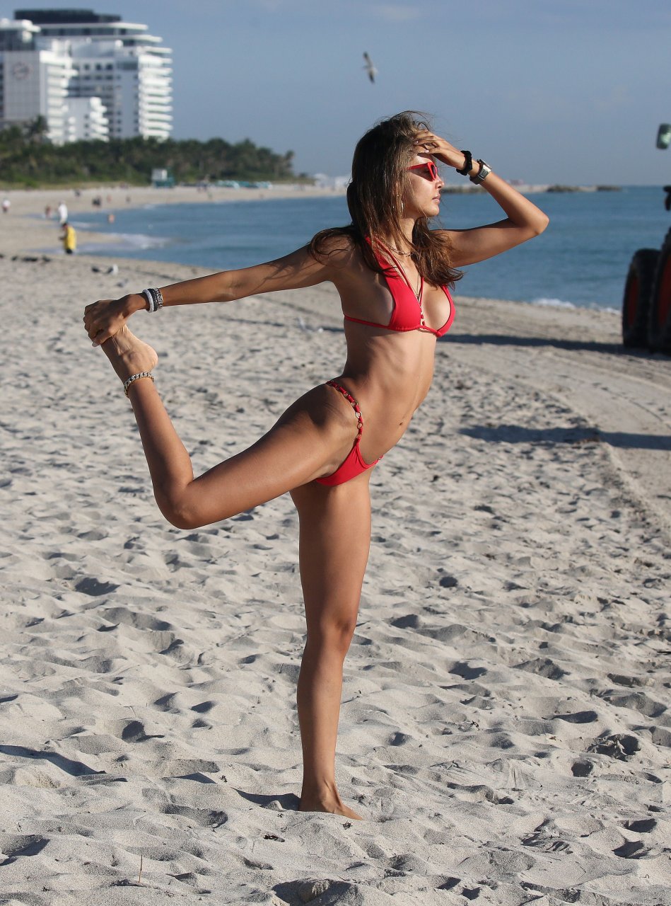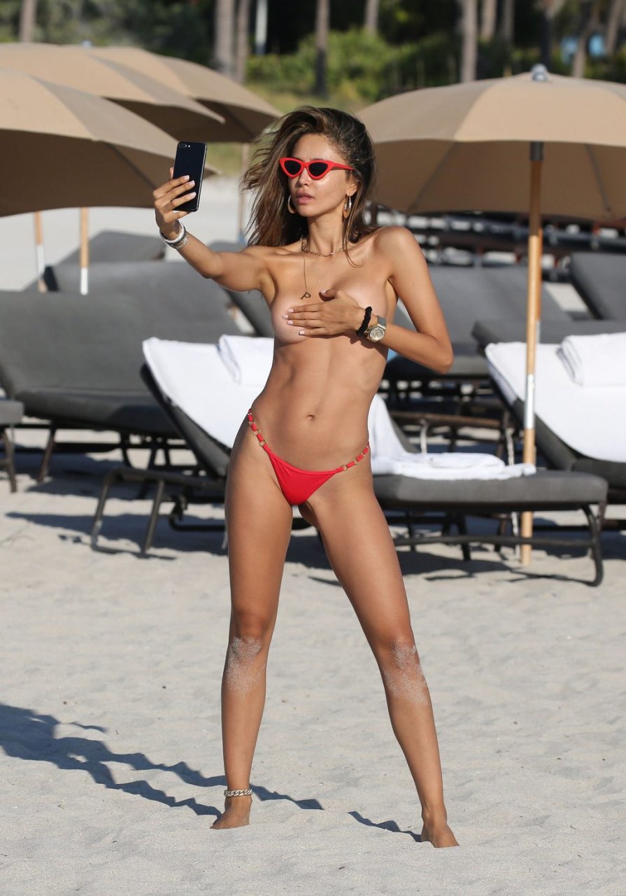 Modelo y actriz mexicana Patricia Contreras se muestra topless para selfies en la playa de Miami, 01/11/2018.