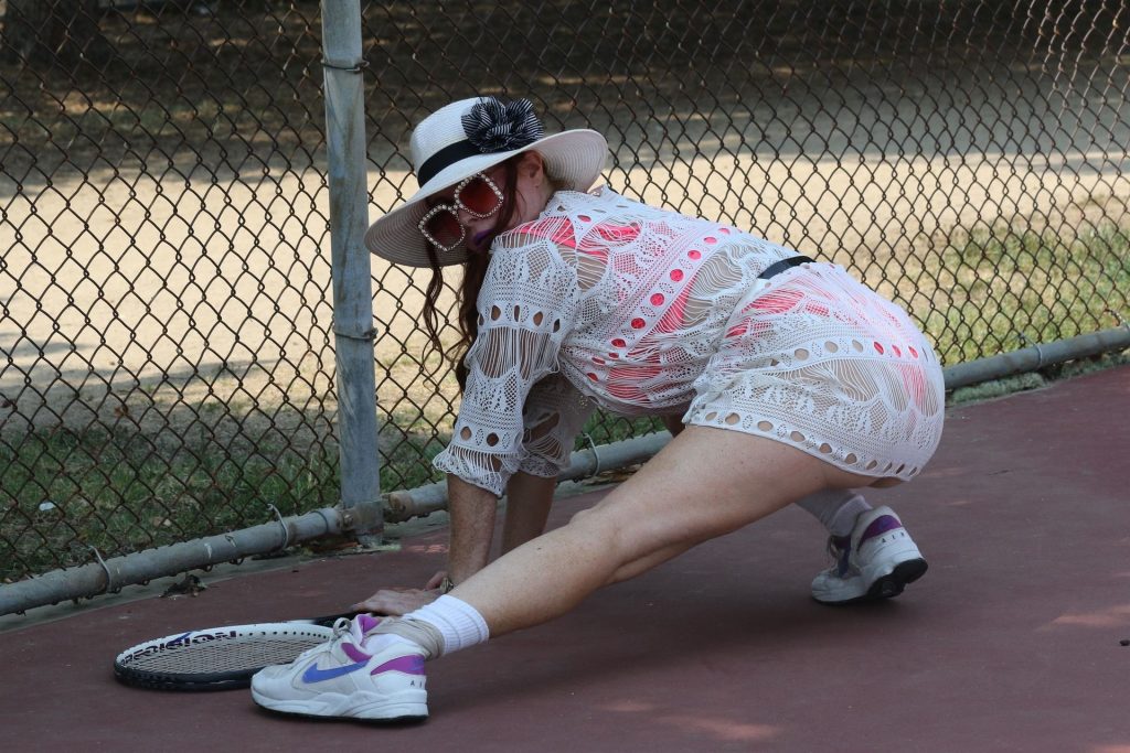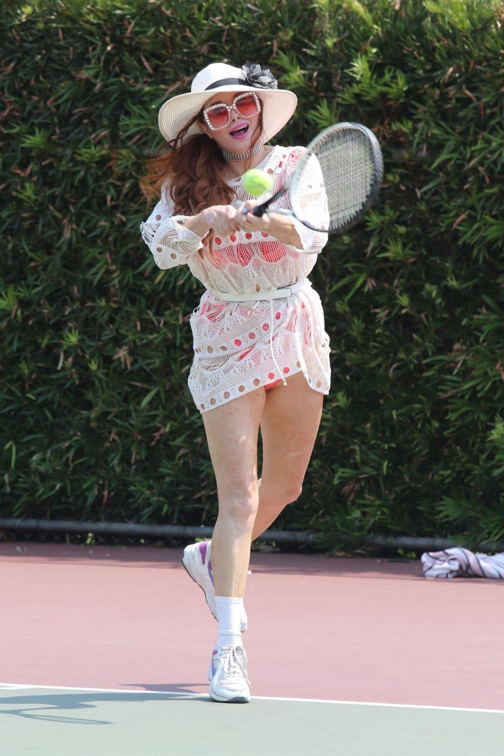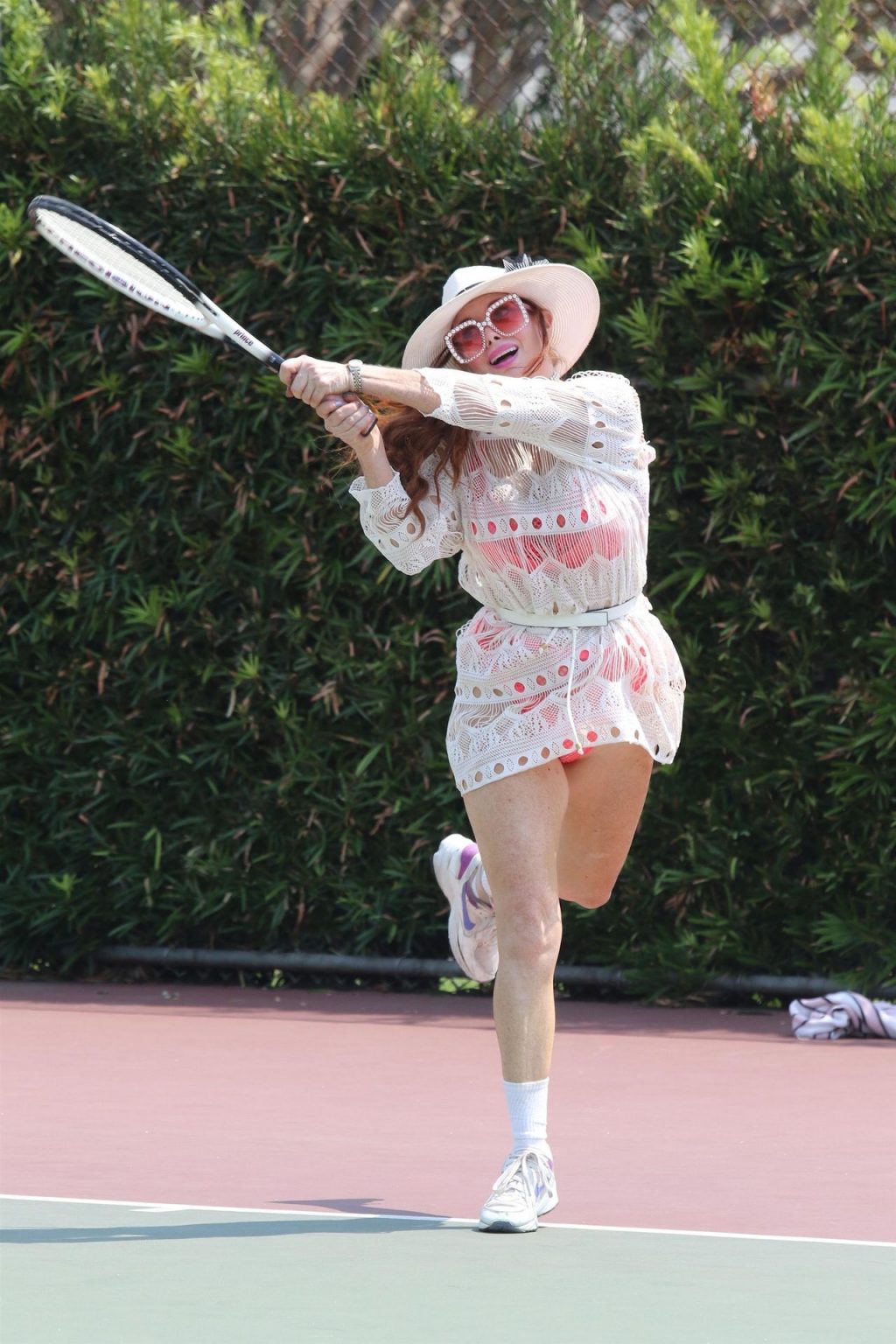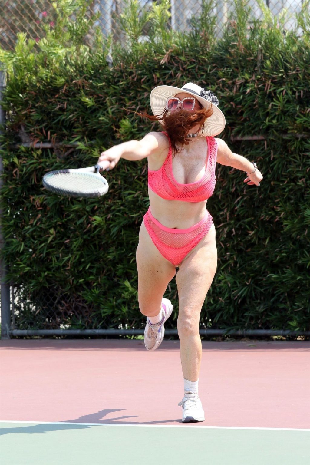 Ella parece 20 años más joven de la cintura para abajo que de la cintura para arriba. Phoebe, ¡siempre usa una camisa de manga larga y mantente bien alejada del sol! No me gusta su cara/maquillaje, pero me la tiraría a cuatro patas.