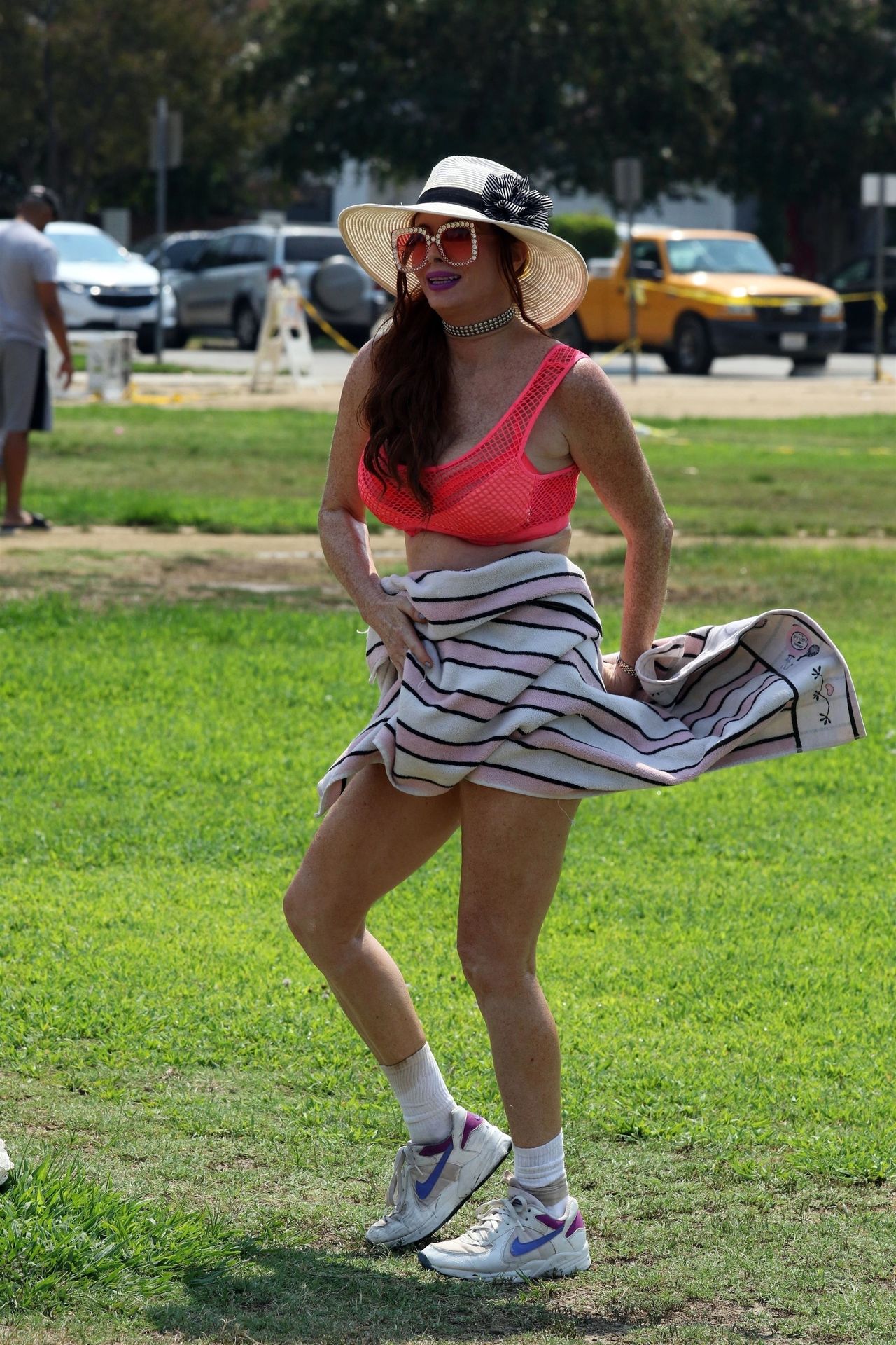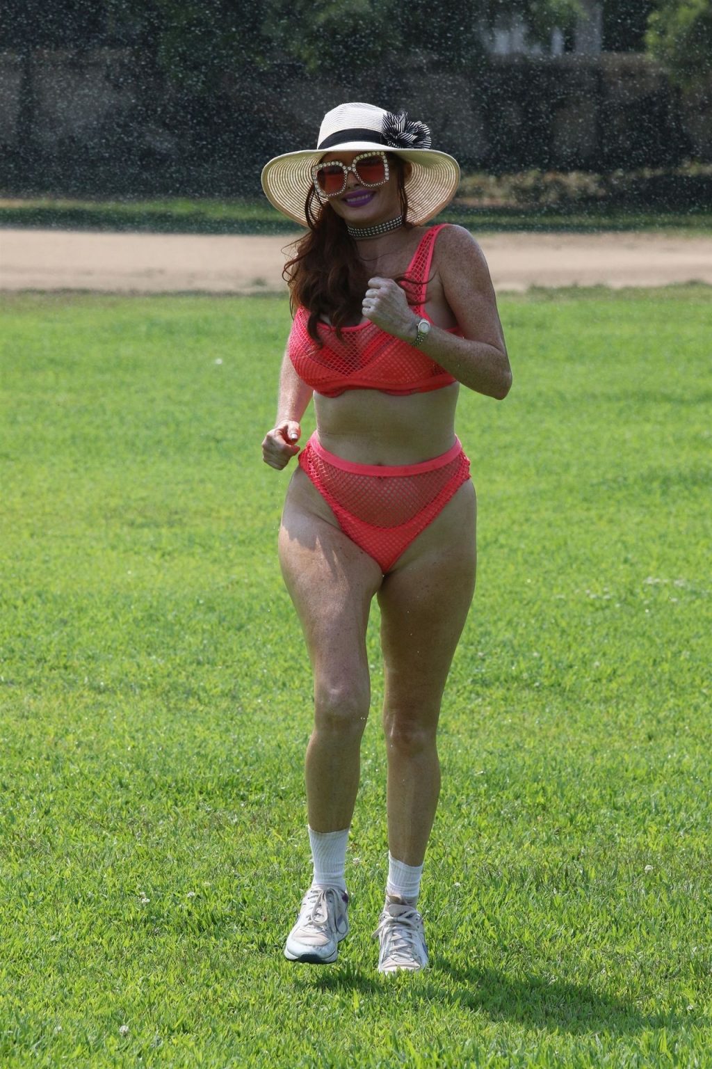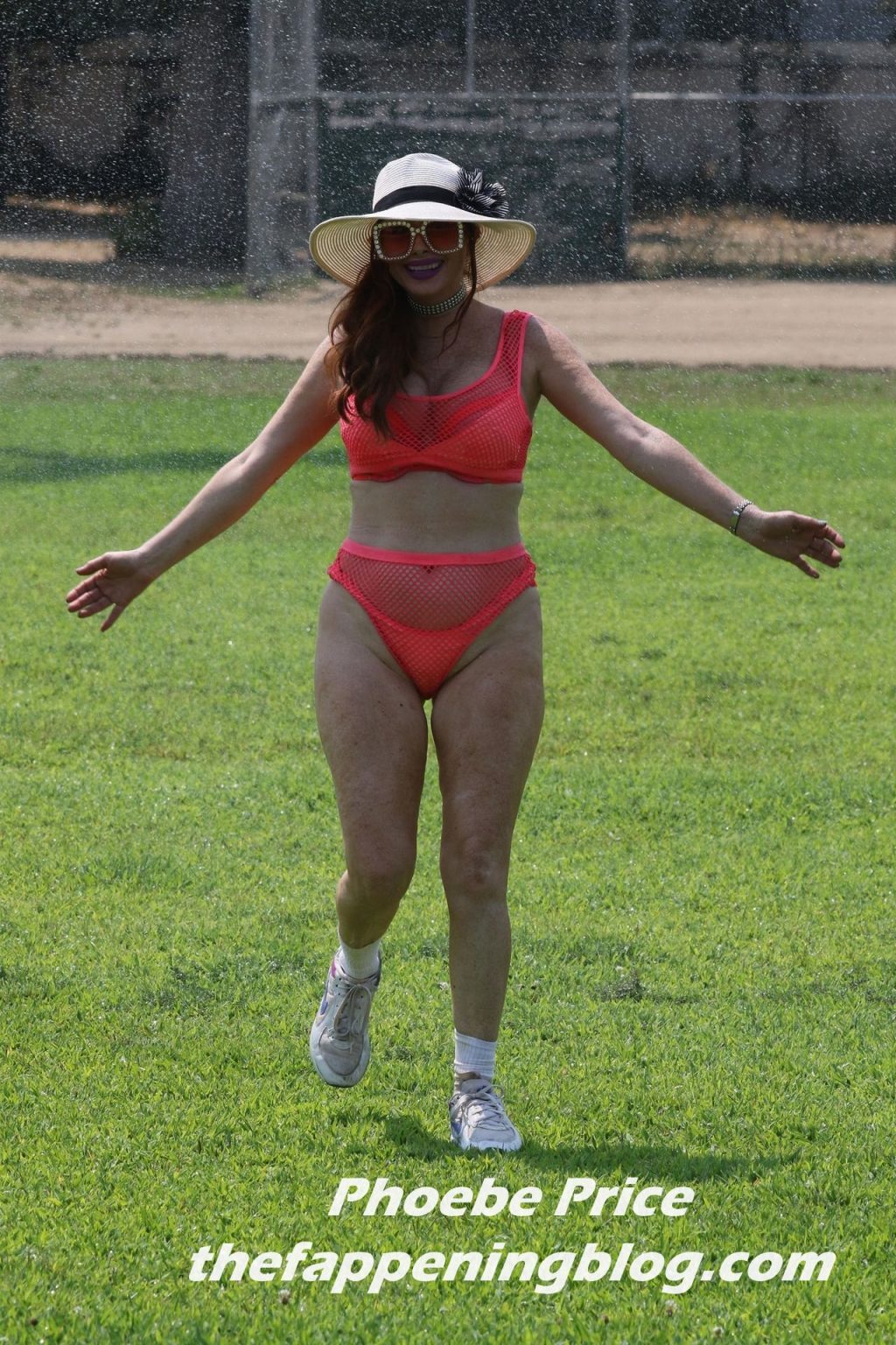 Phoebe Price se ve en bikini en el parque mojándose con los aspersores durante la ola de calor en Los Ángeles, 20/08/2020.