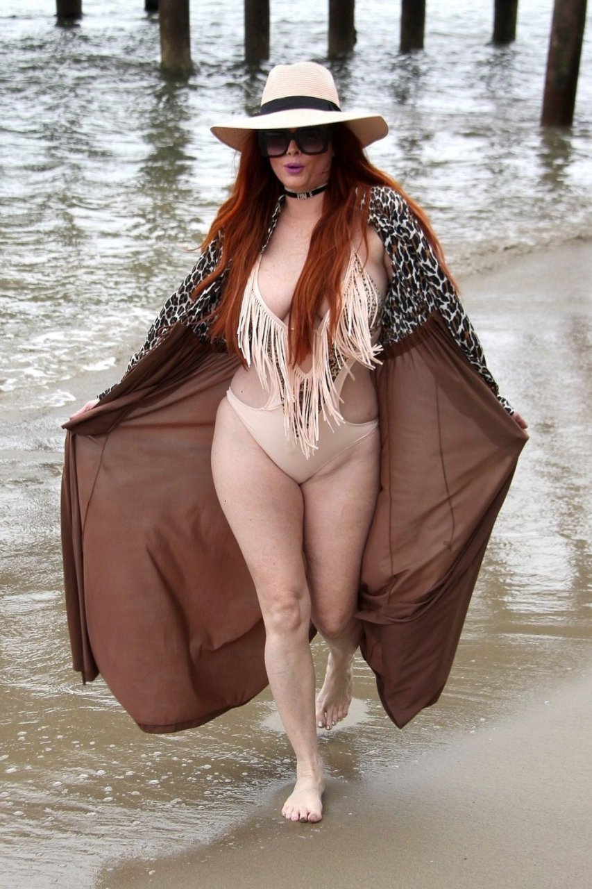 Phoebe Price posa para una sesión de fotos en Malibu hoy y luce un bikini nude bajo una cubierta de playa estampada, 02/05/2019. Phoebe llevó uno de sus característicos sombreros de ala ancha y sus poses distintivas.