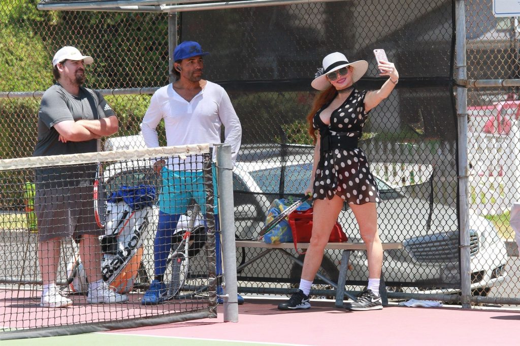 Phoebe Price se ve con otro entrenador de tenis en Los Ángeles, 23/07/2020. La estrella de reality recibe ayuda del entrenador Santiago junto con otro alumno.