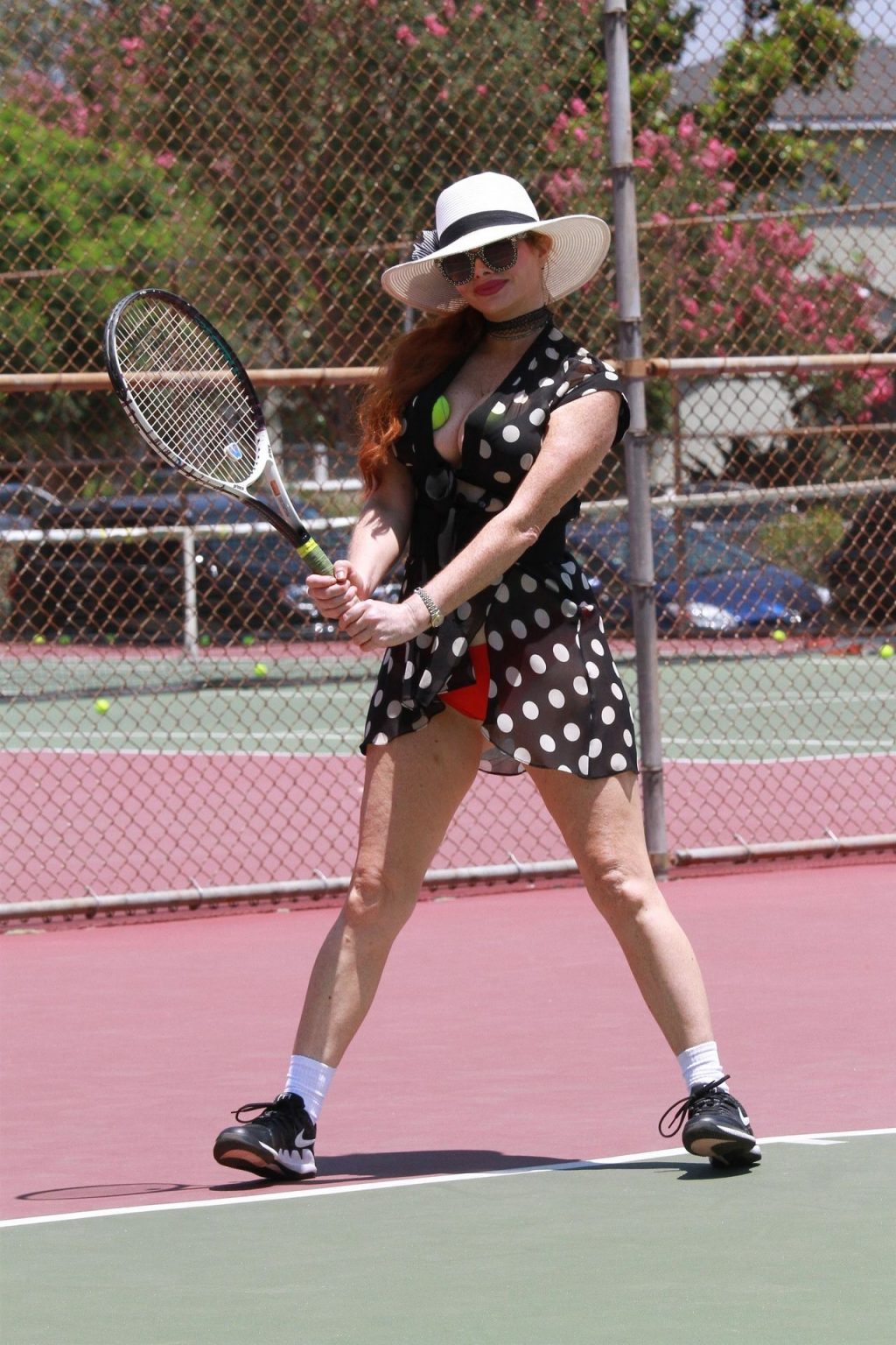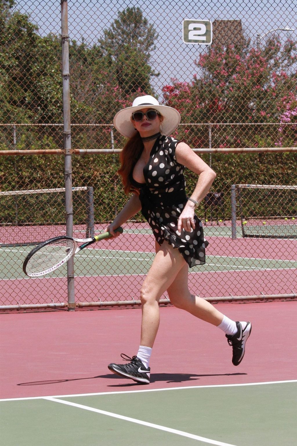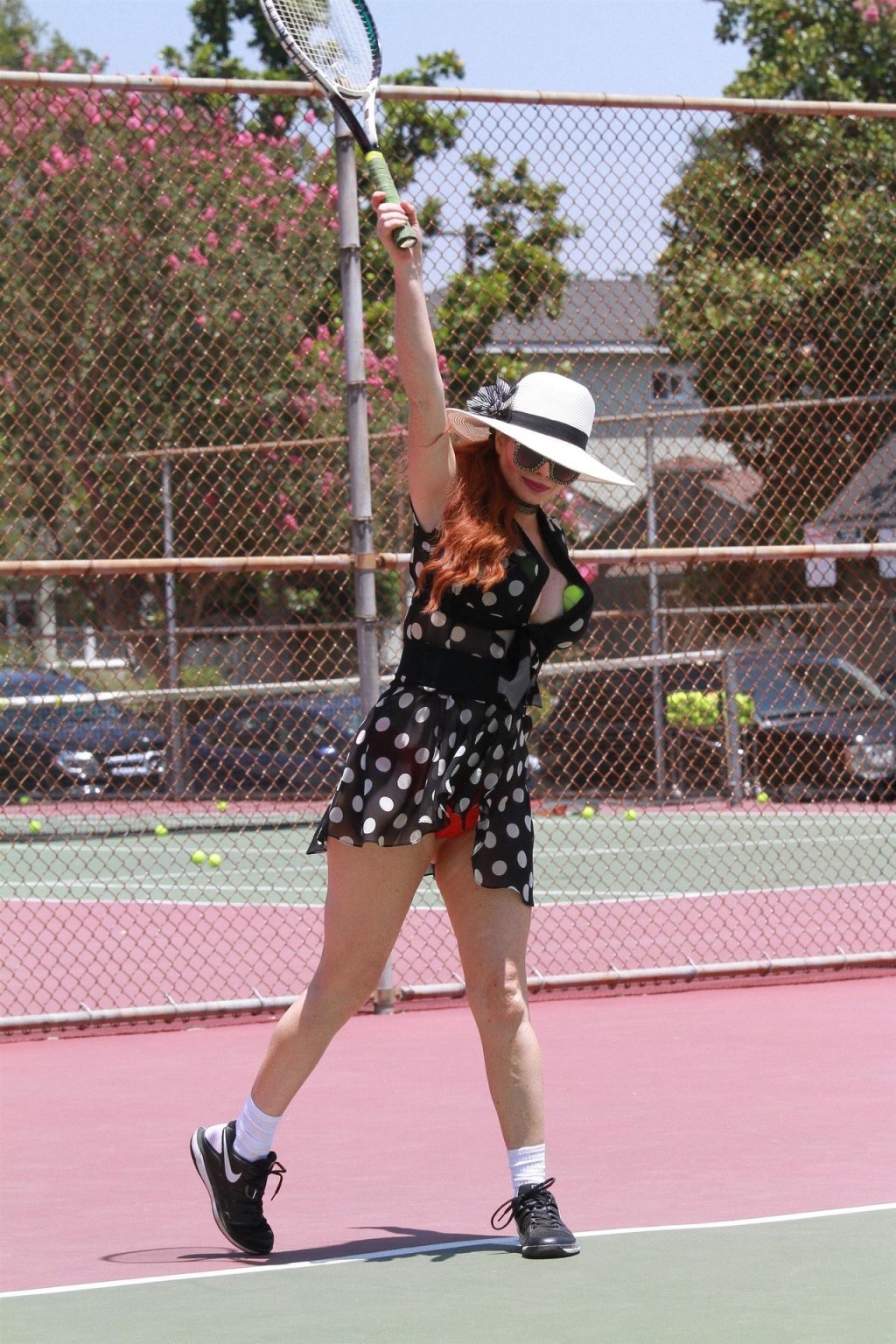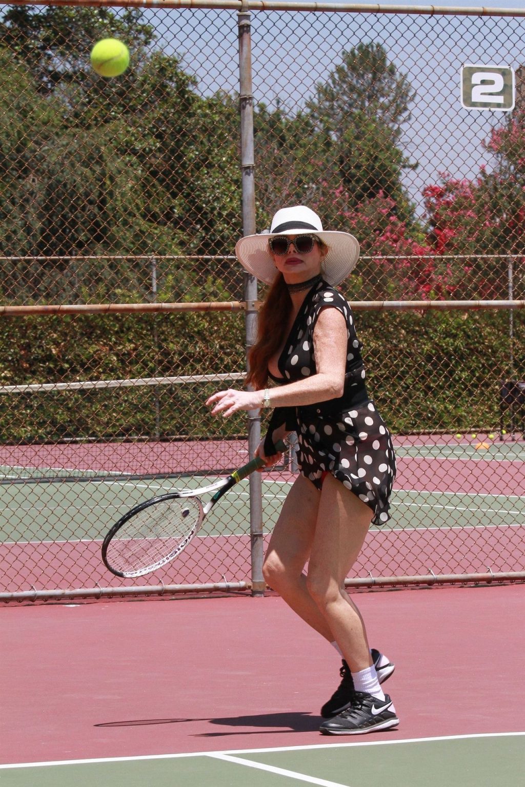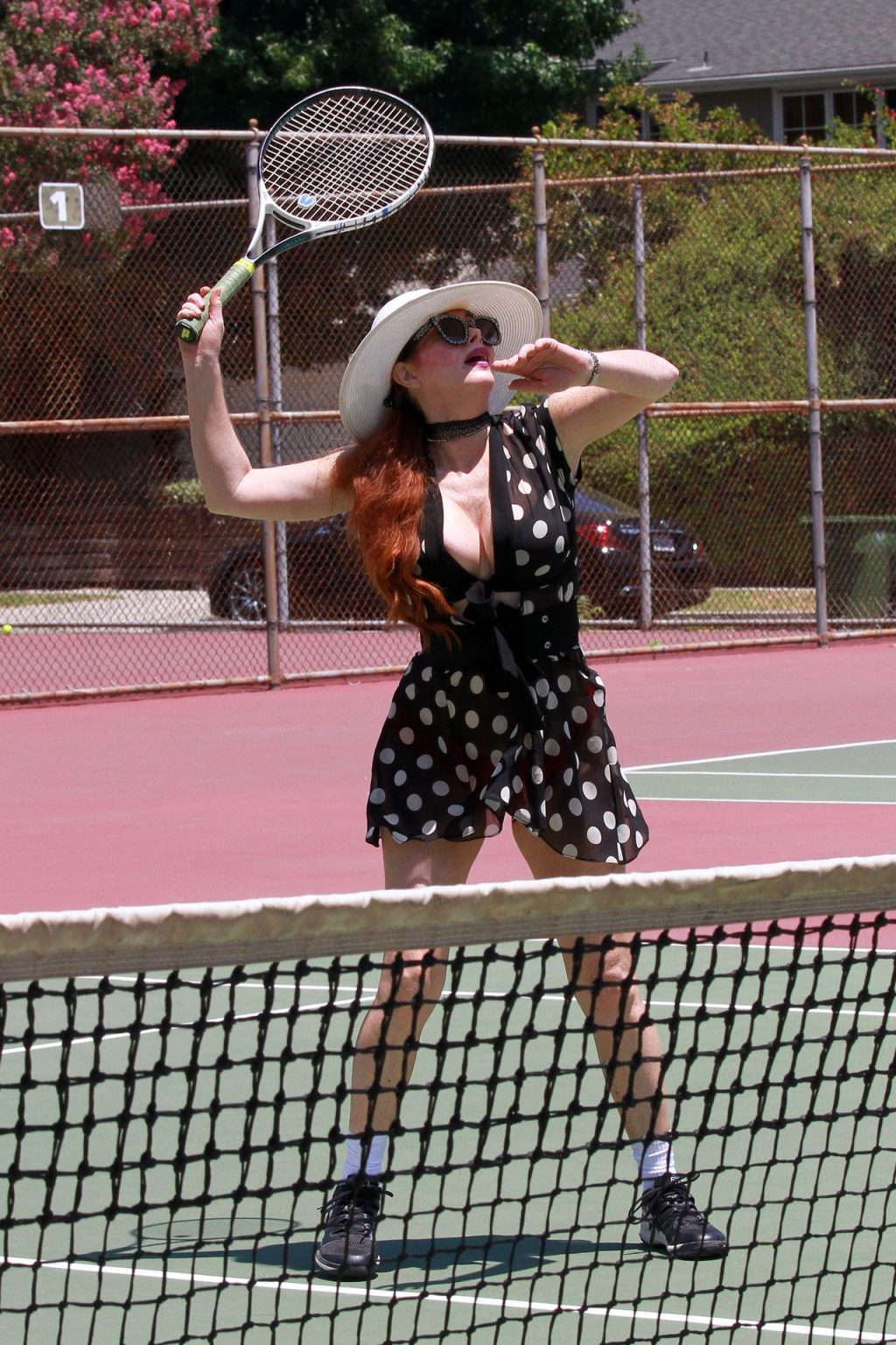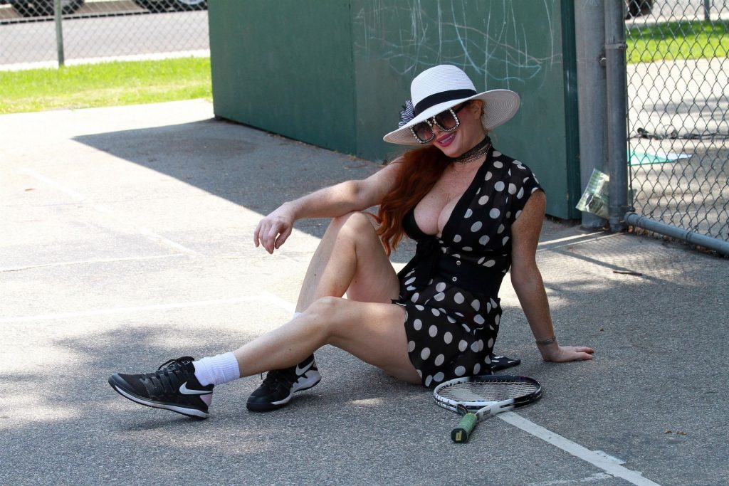 La actriz muestra un nuevo conjunto para las canchas y mucho escote. Se divierte golpeando pelotas y hace su entrenamiento.