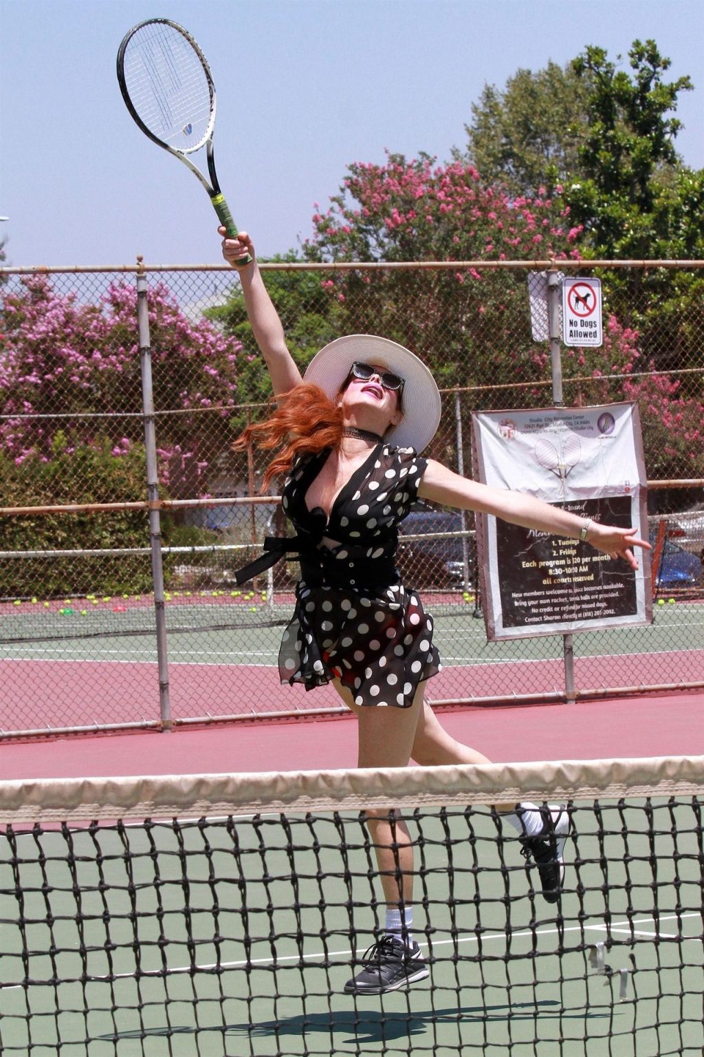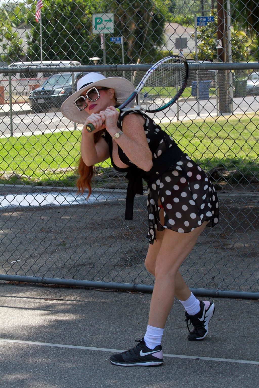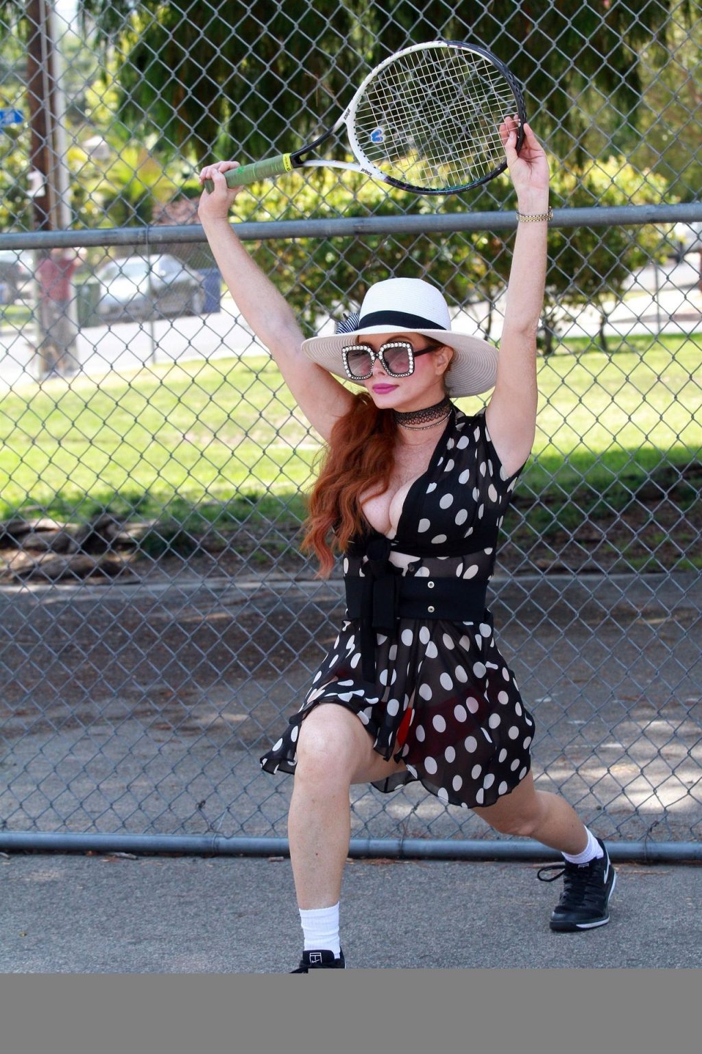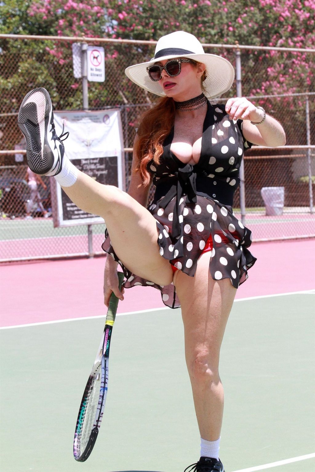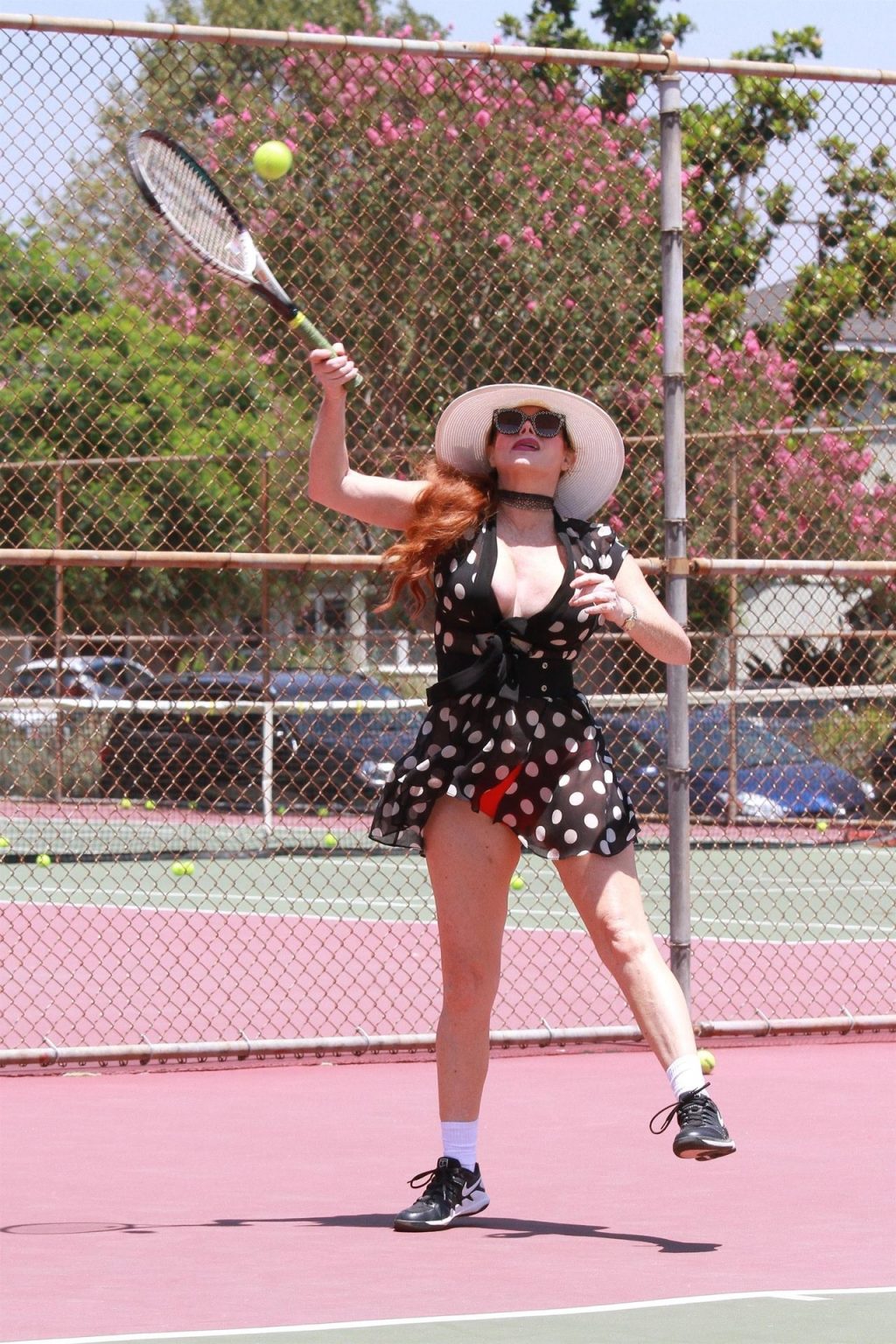 La actriz muestra un nuevo conjunto para las canchas y mucho escote. Se divierte golpeando pelotas y hace su entrenamiento.