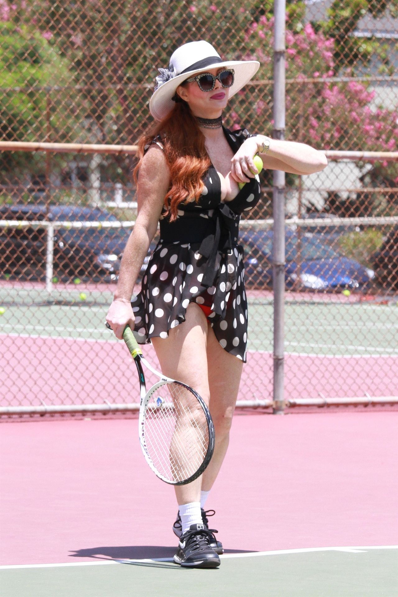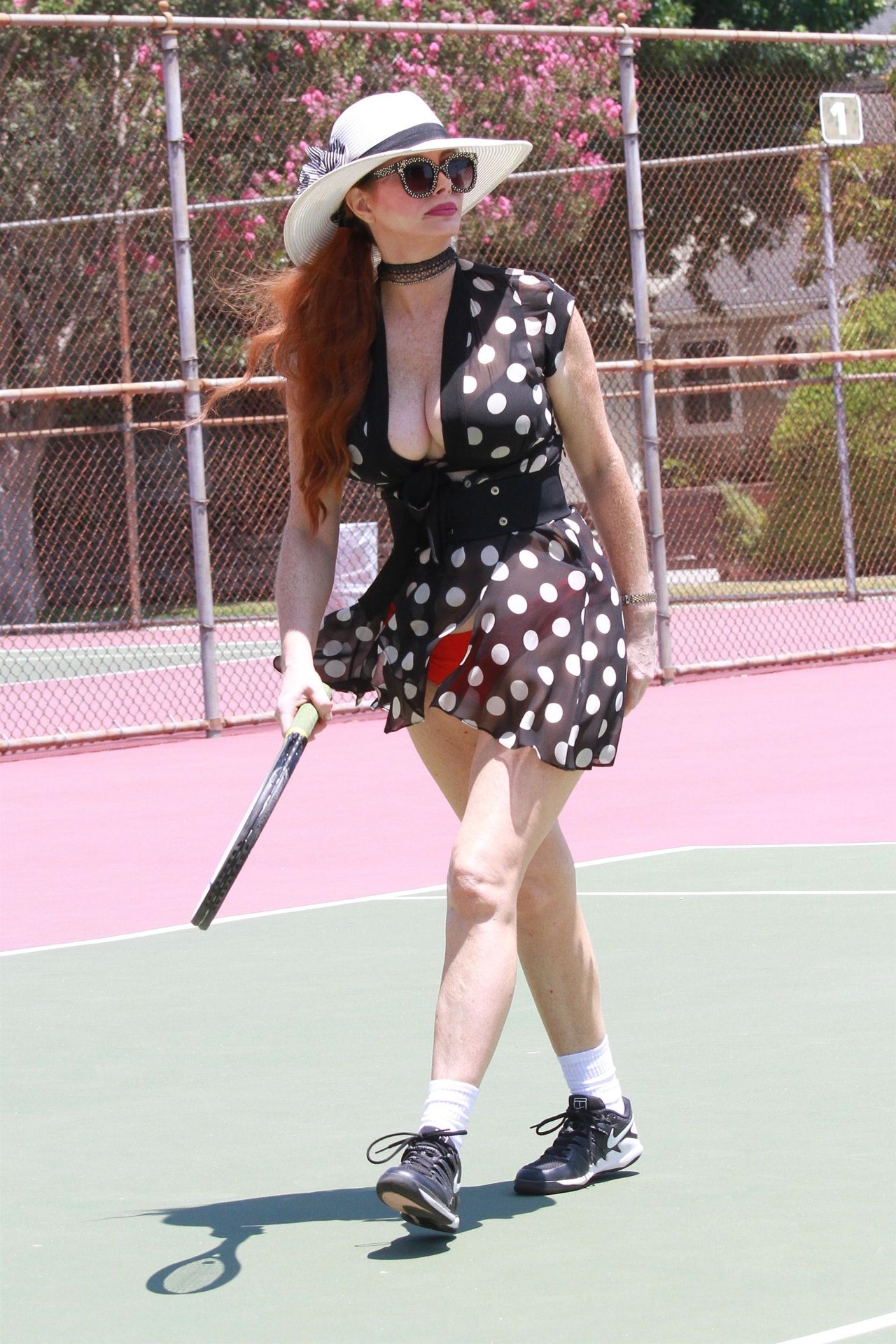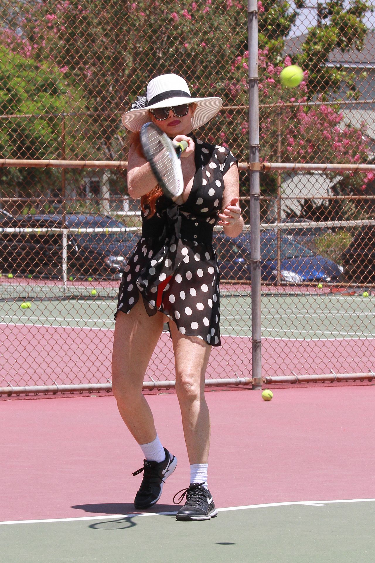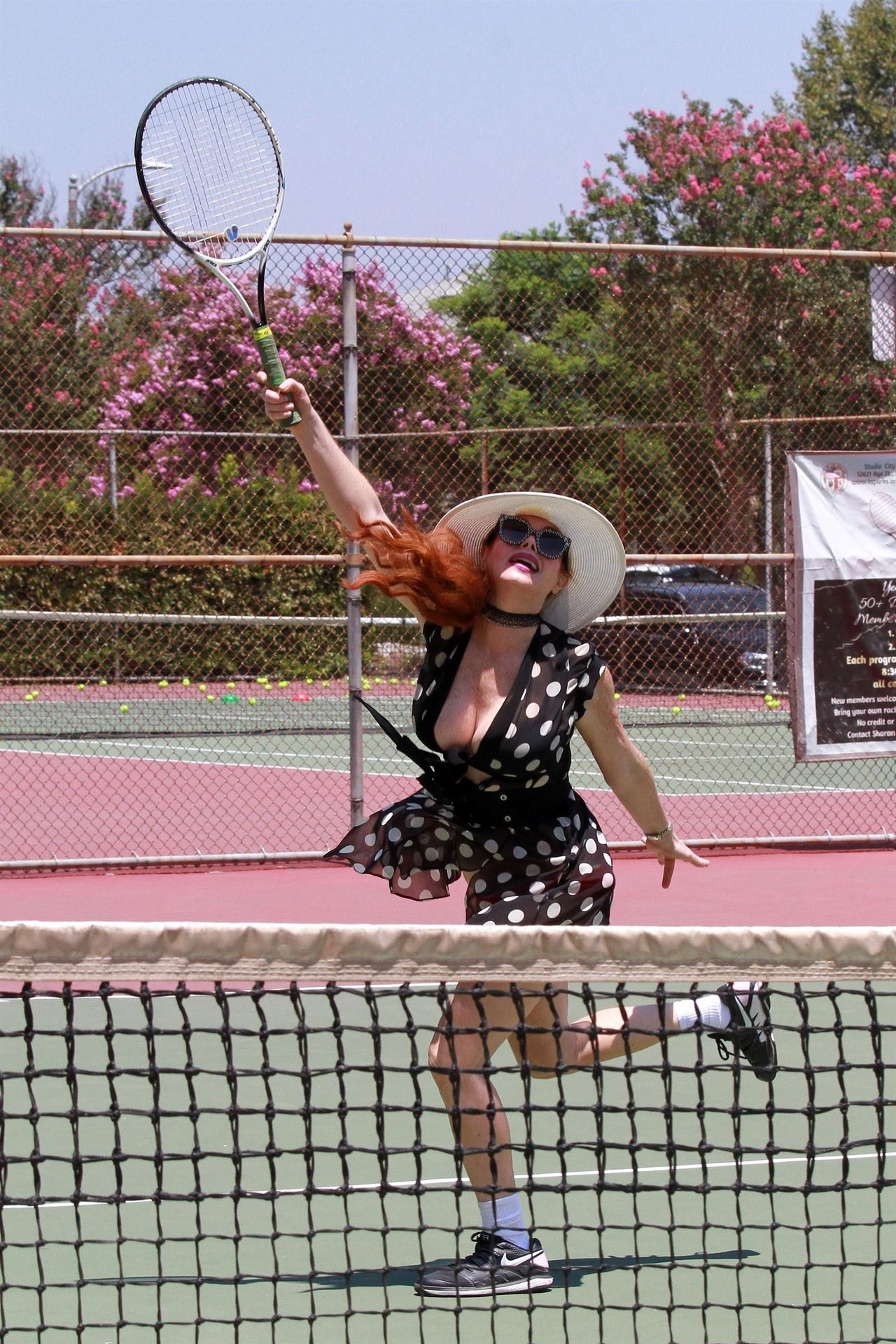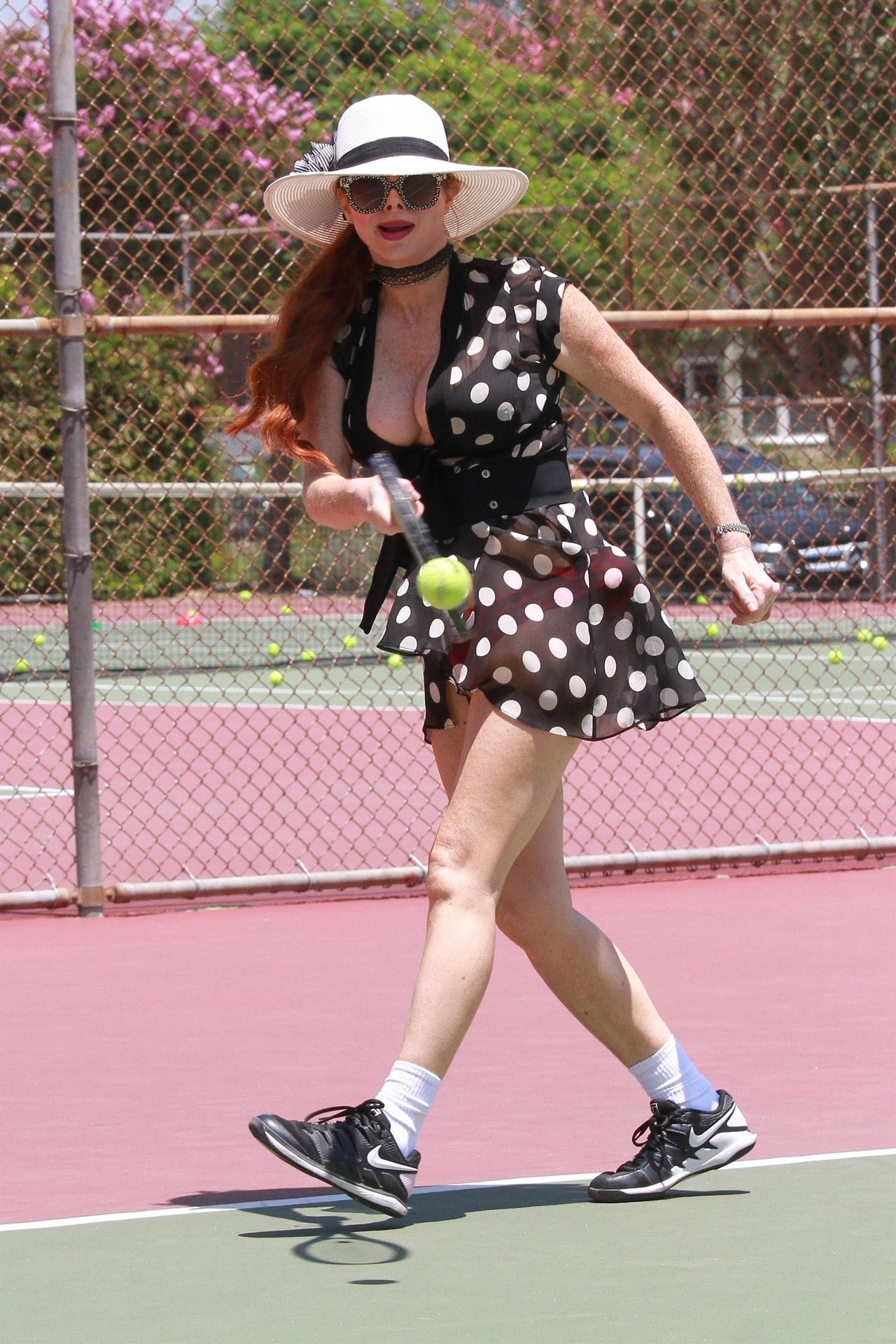 La actriz muestra un nuevo conjunto para las canchas y mucho escote. Se divierte golpeando pelotas y hace su entrenamiento.