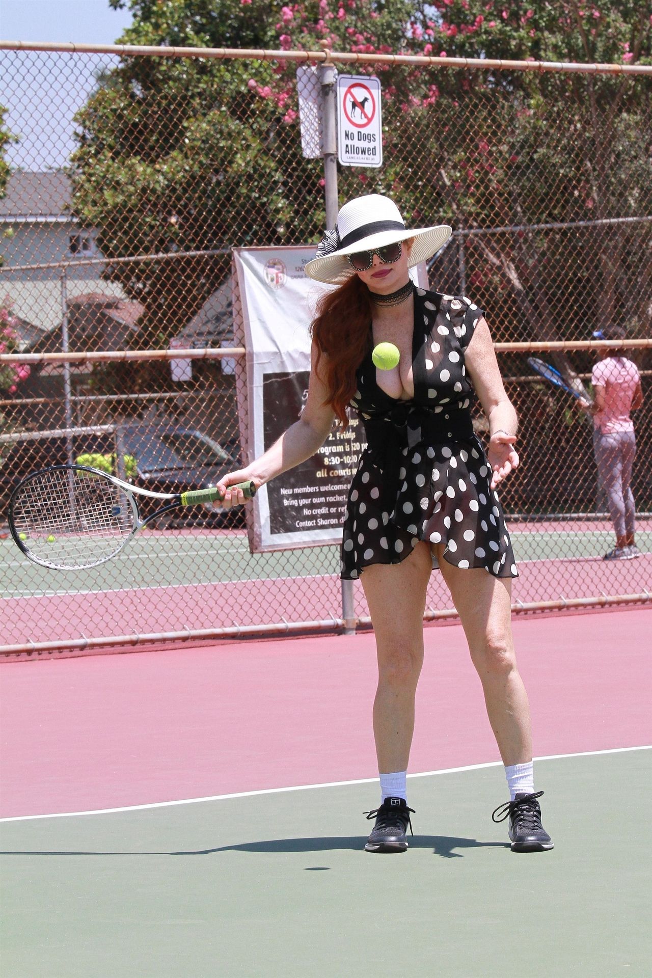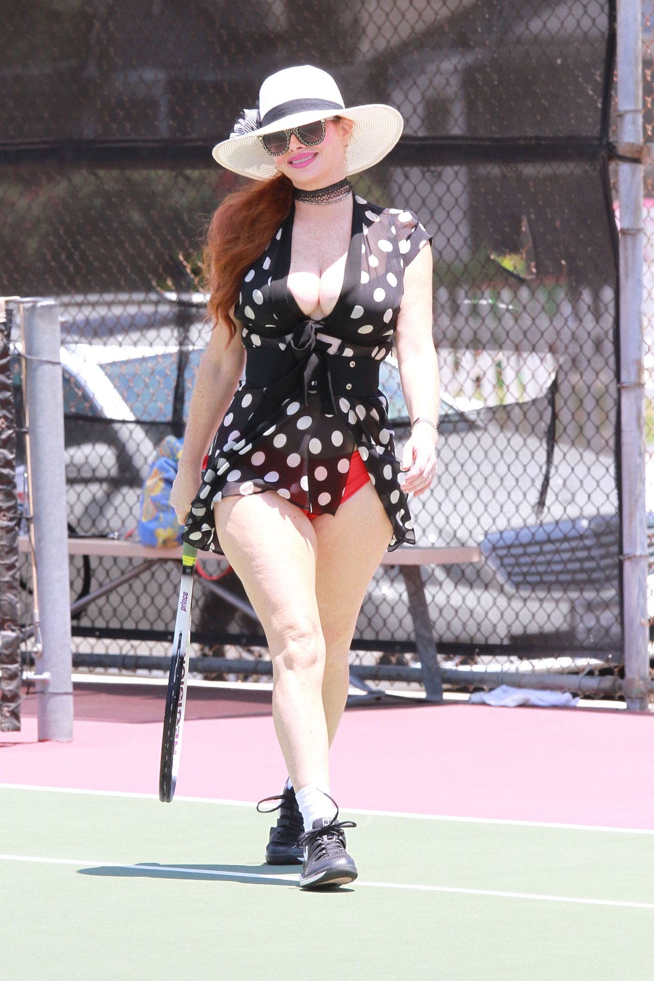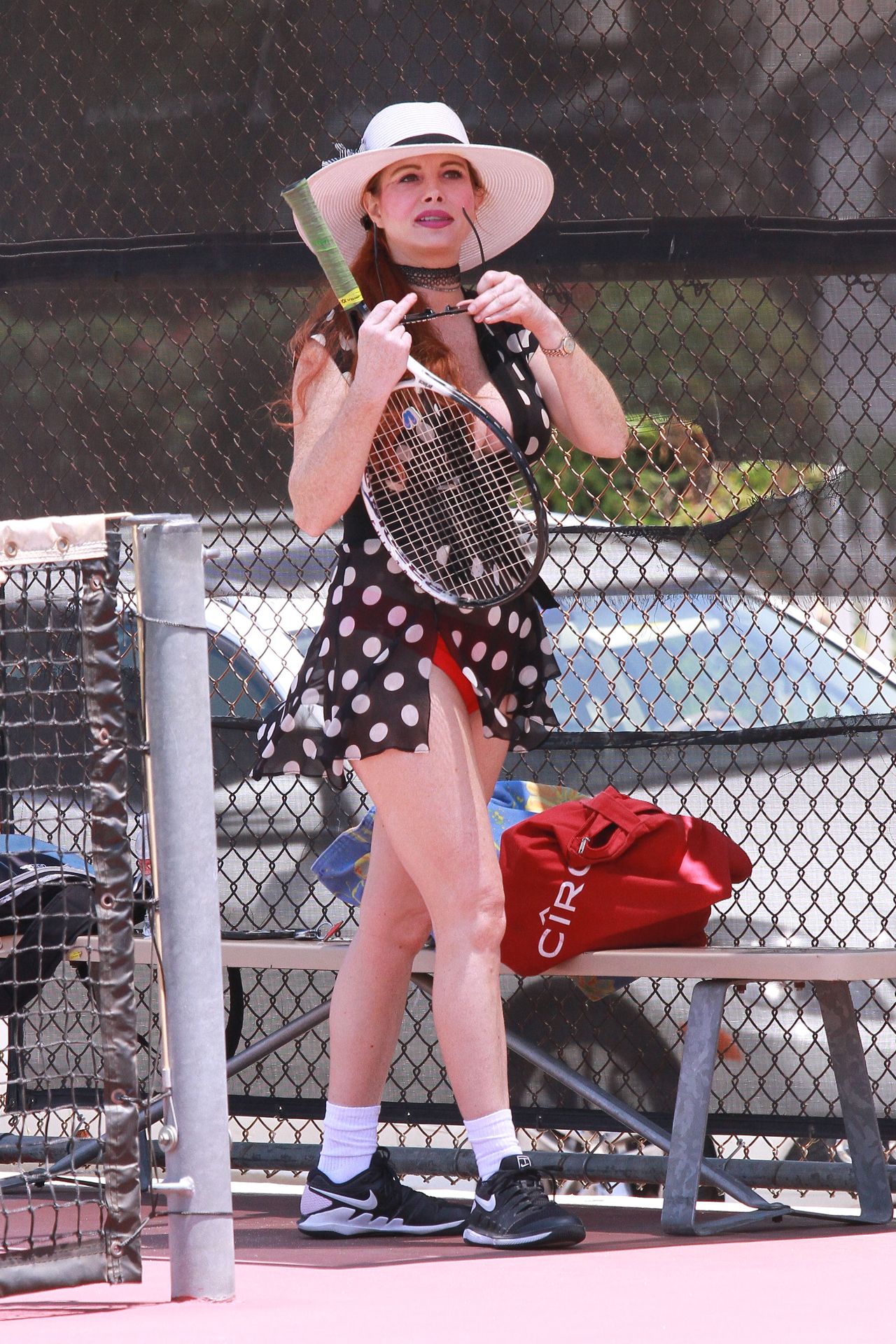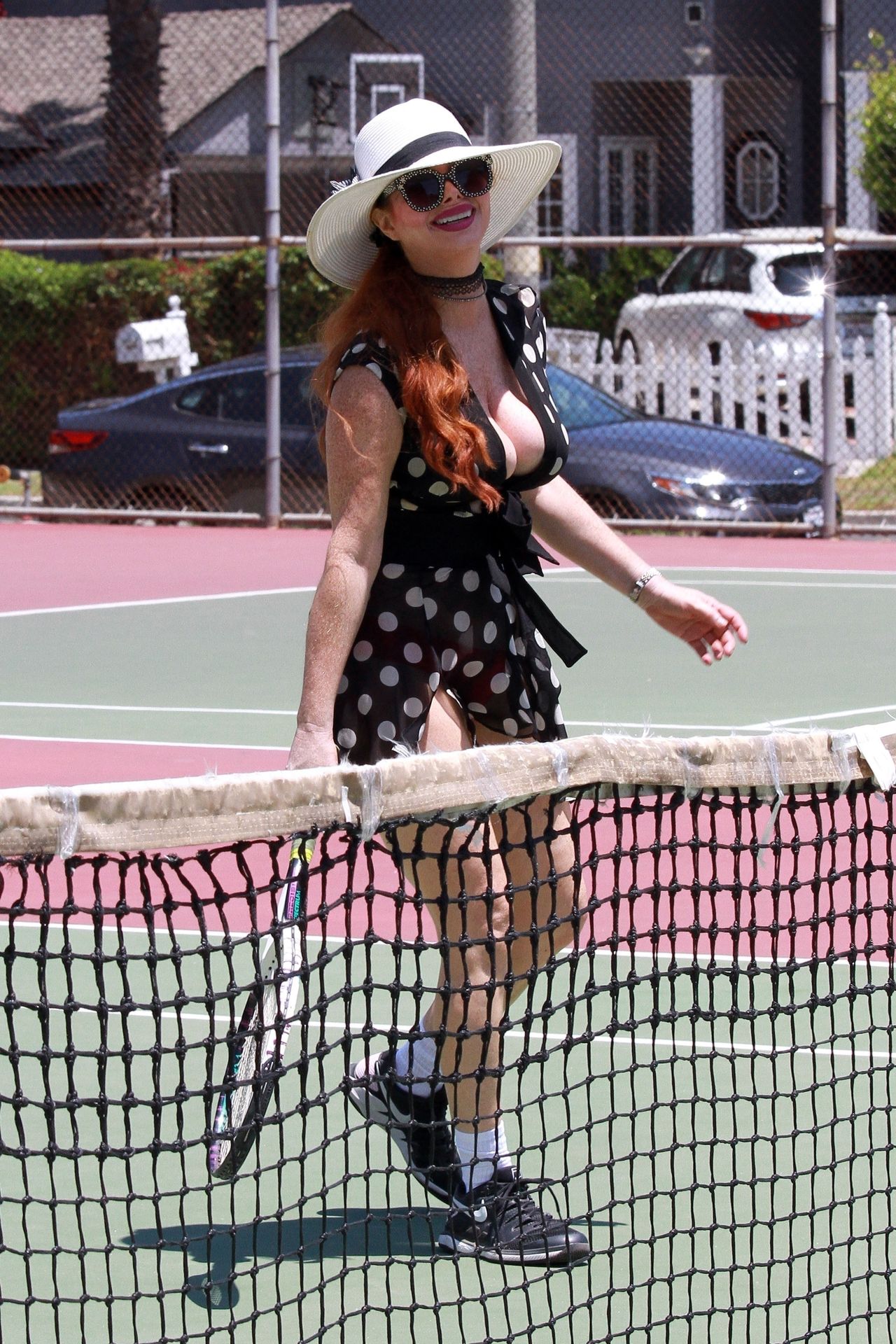 La actriz muestra un nuevo conjunto para las canchas y mucho escote. Se divierte golpeando pelotas y hace su entrenamiento.