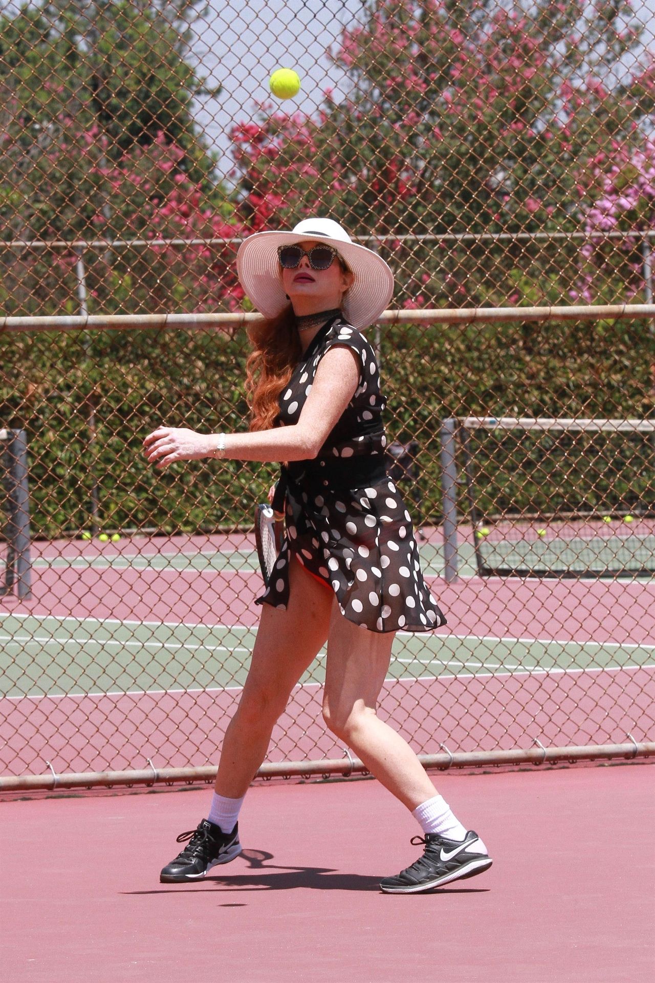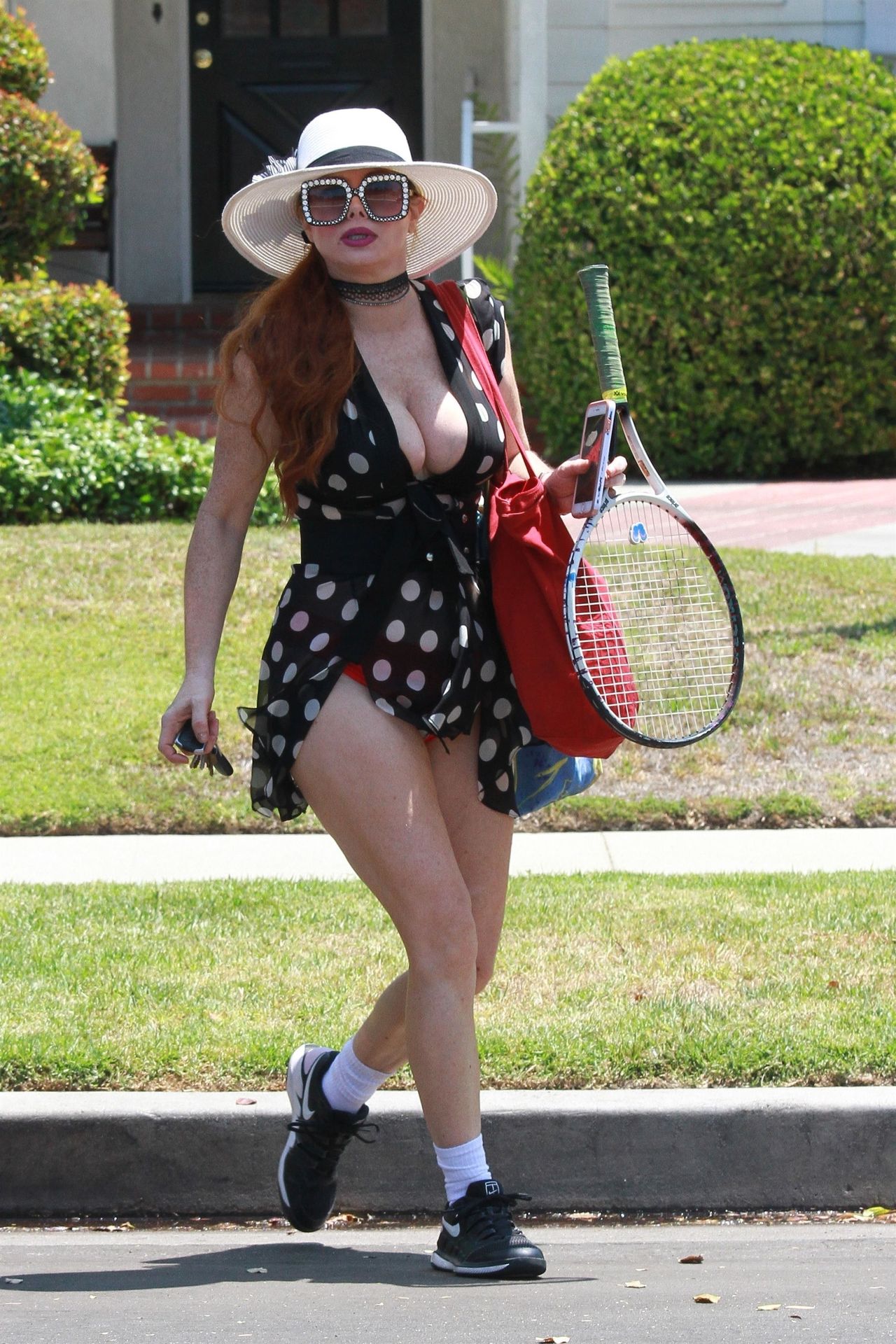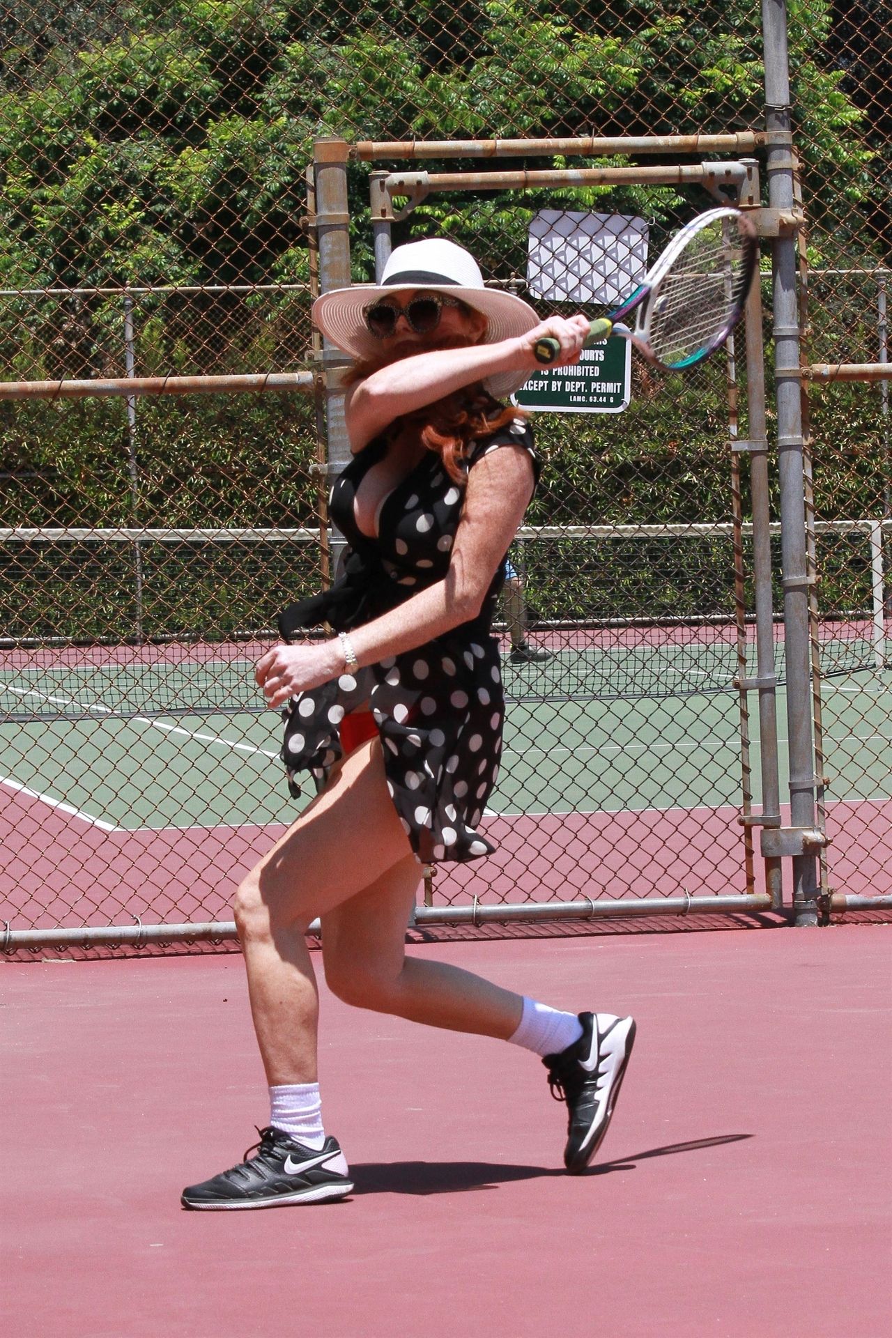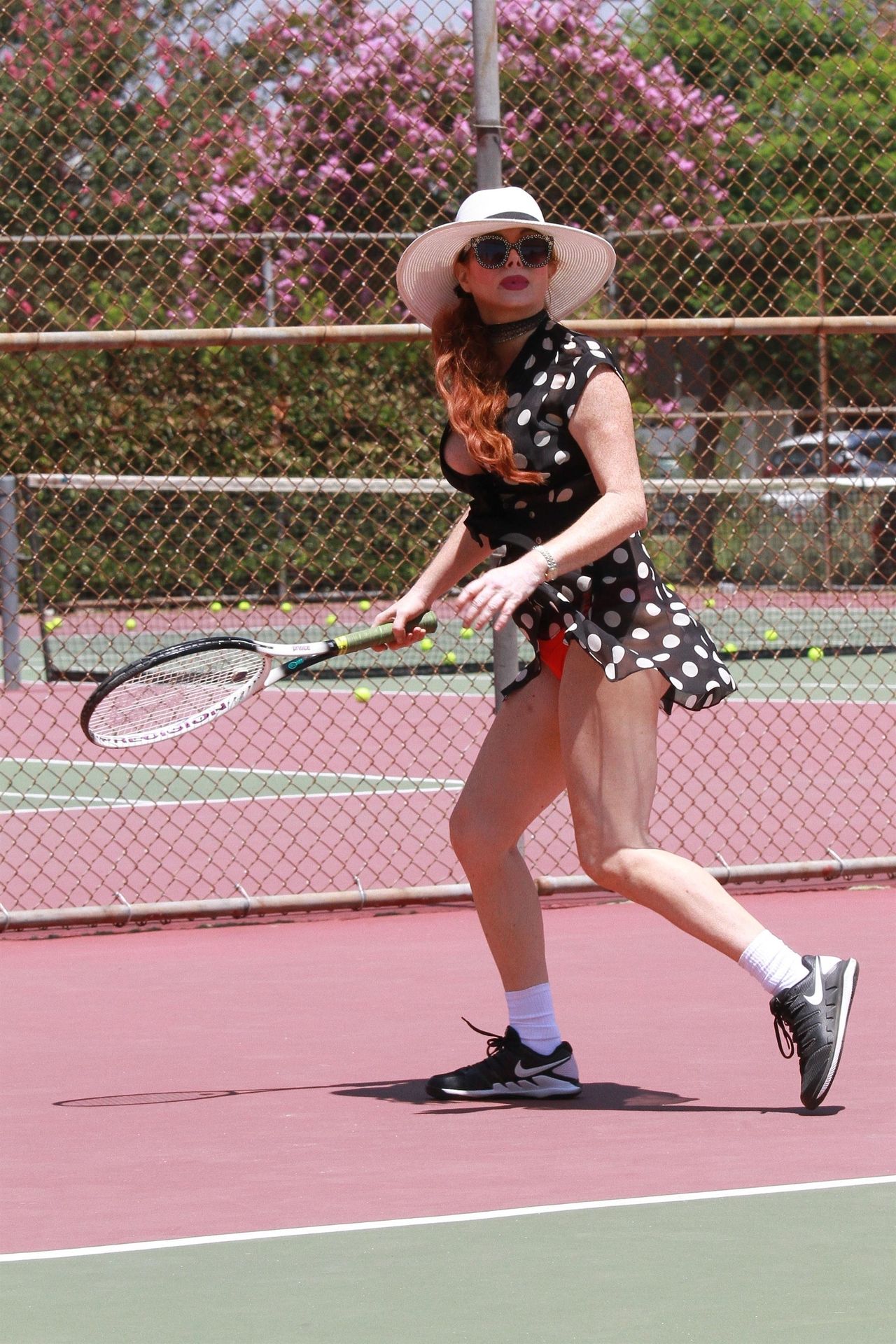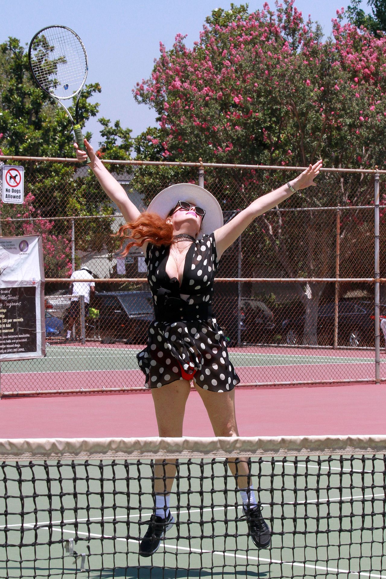 La actriz muestra un nuevo conjunto para las canchas y mucho escote. Se divierte golpeando pelotas y hace su entrenamiento.