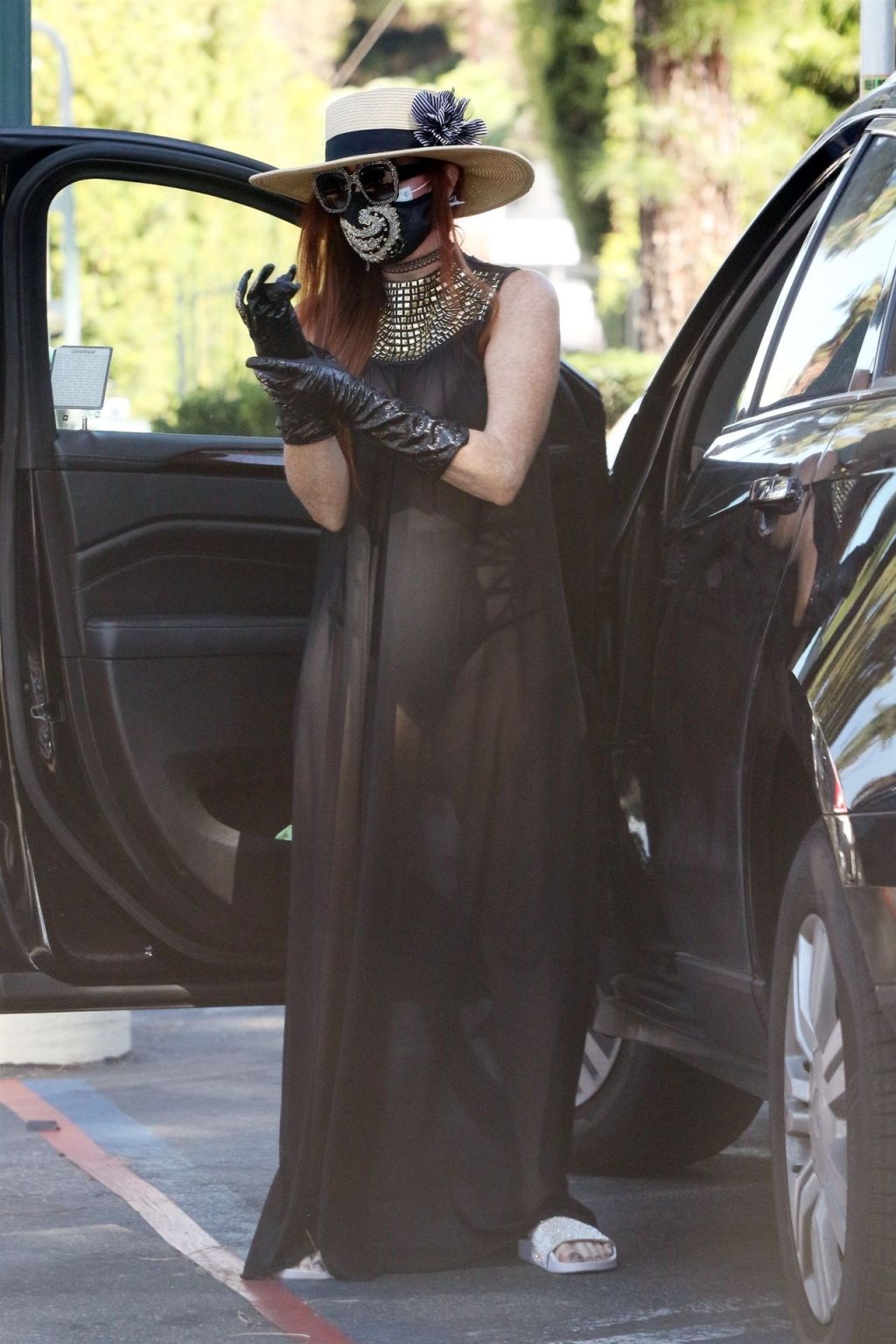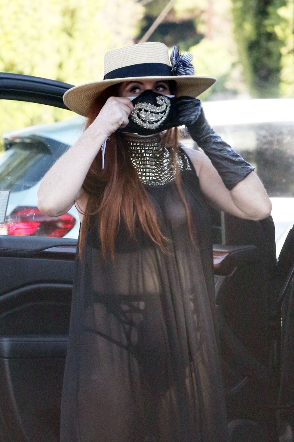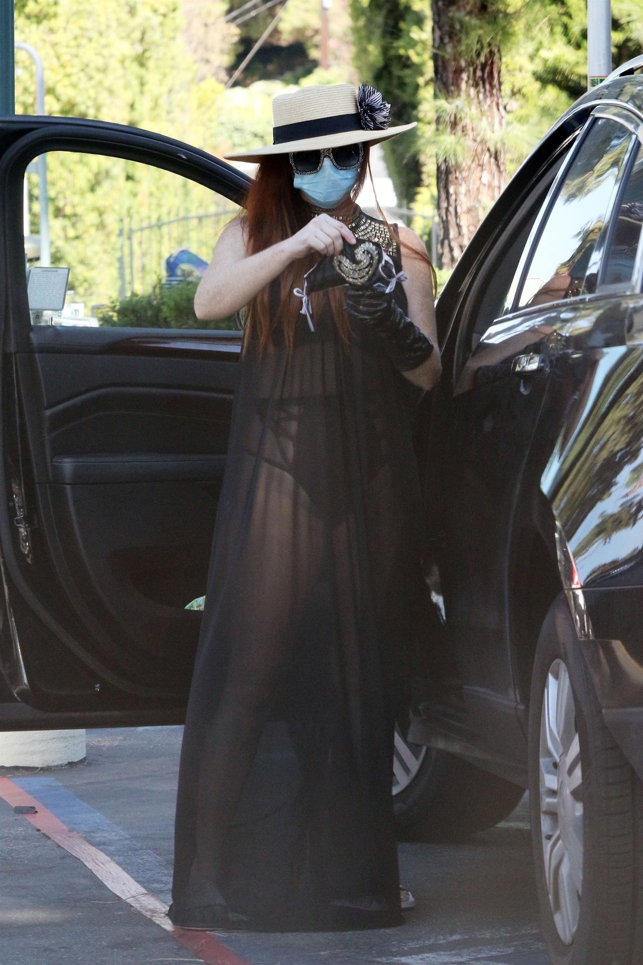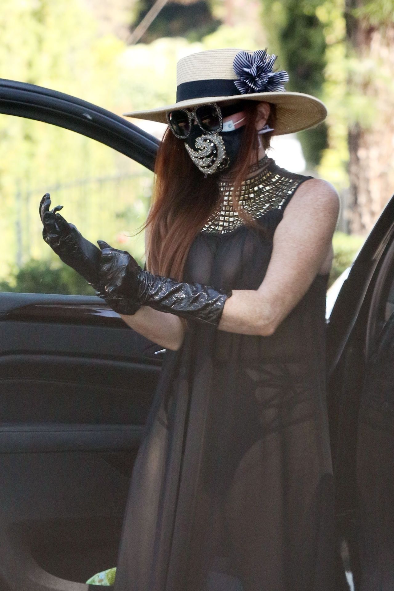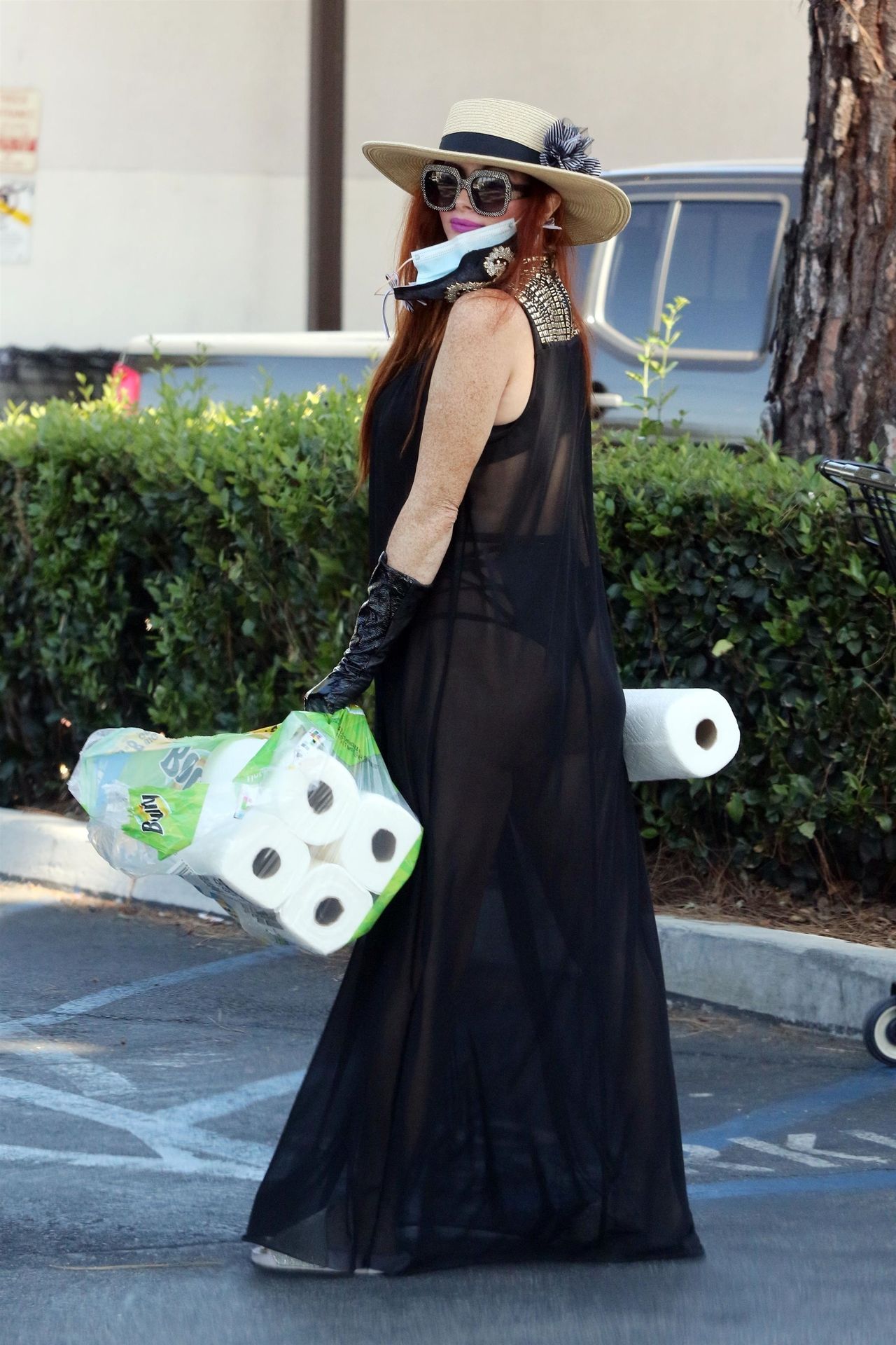 Phoebe Price se ve completamente de negro mientras se dirige a la tienda de comestibles en Los Ángeles, 09/08/2020. Se pone guantes negros antes de entrar. Al salir, carga Fanta y deja caer algunas toallas de papel.