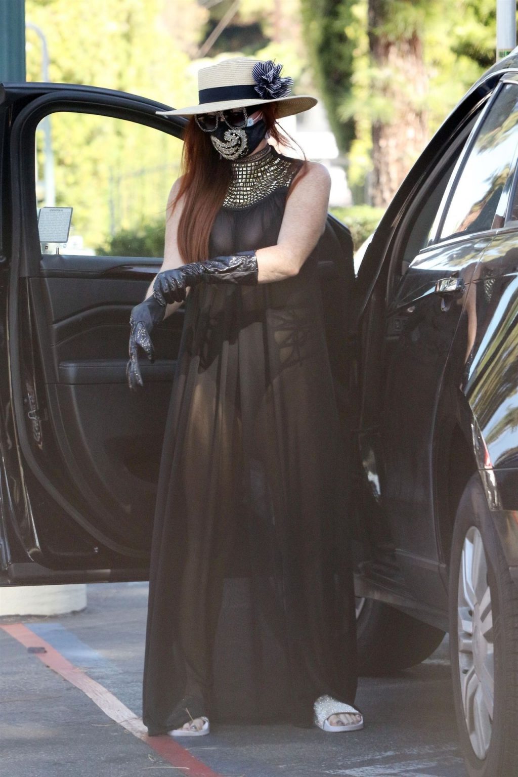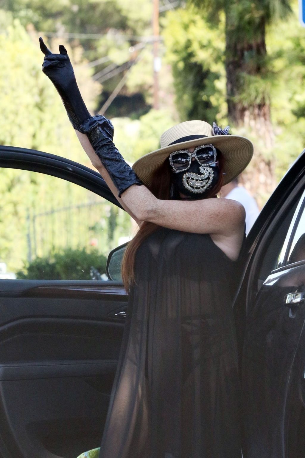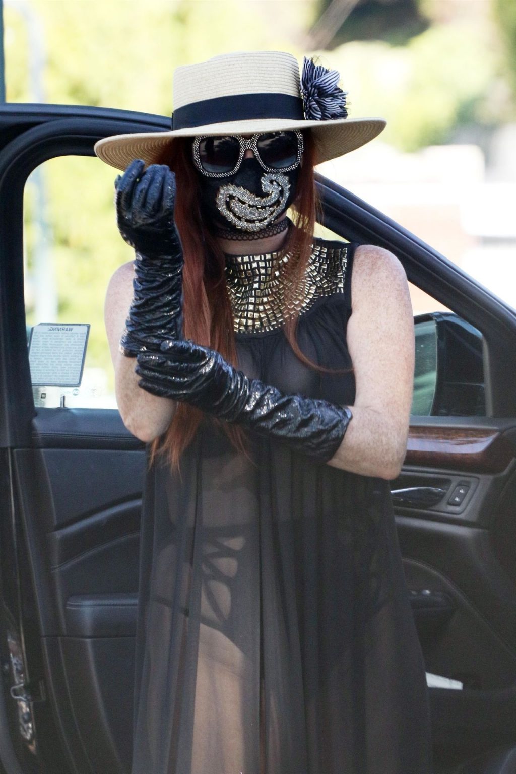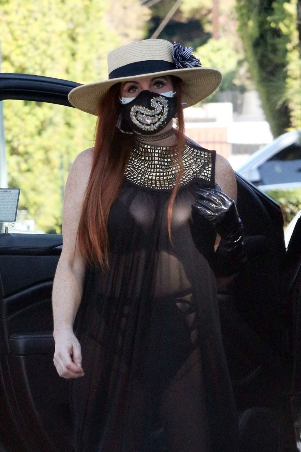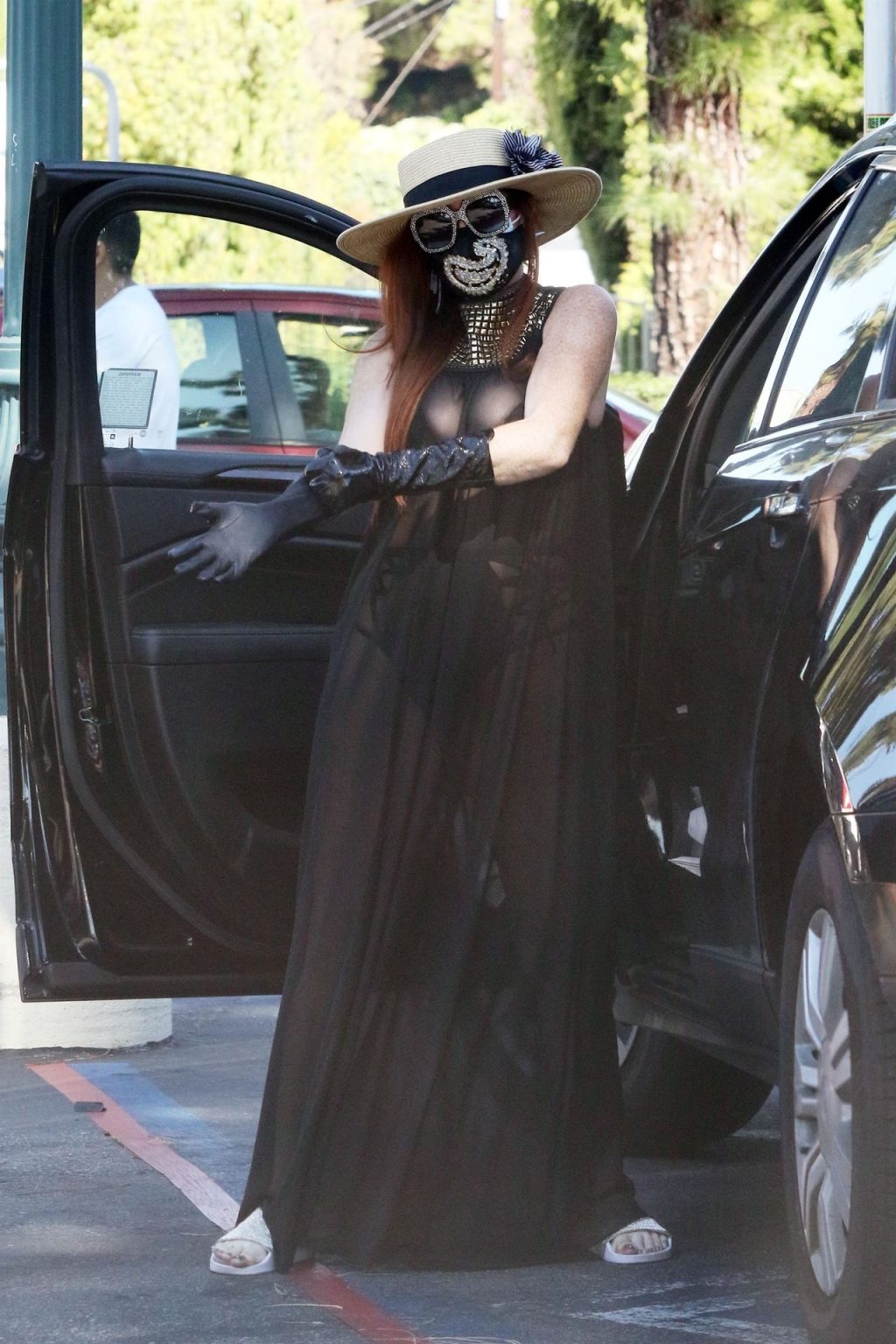 Phoebe Price se ve completamente de negro mientras se dirige a la tienda de comestibles en Los Ángeles, 09/08/2020. Se pone guantes negros antes de entrar. Al salir, carga Fanta y deja caer algunas toallas de papel.