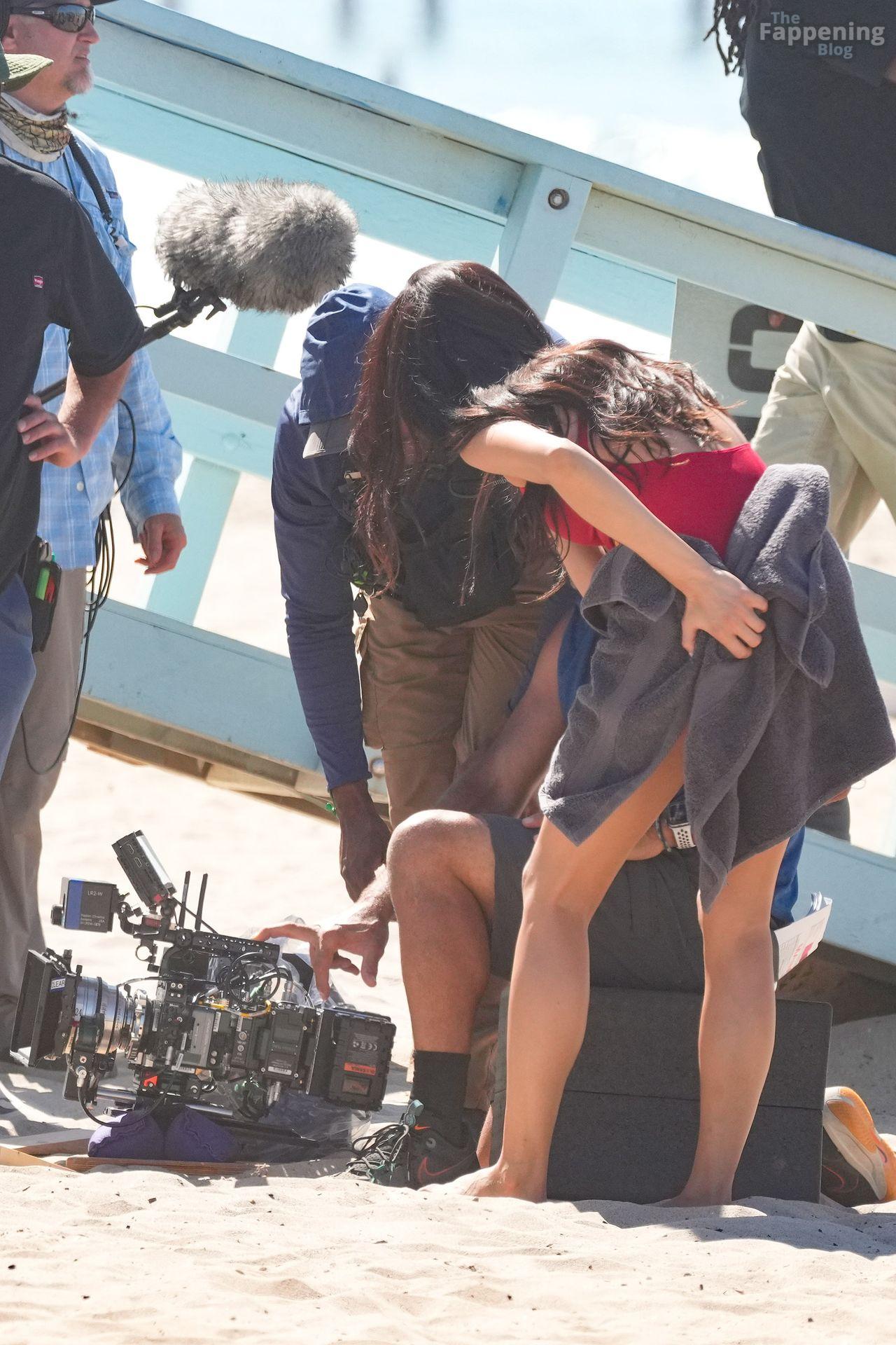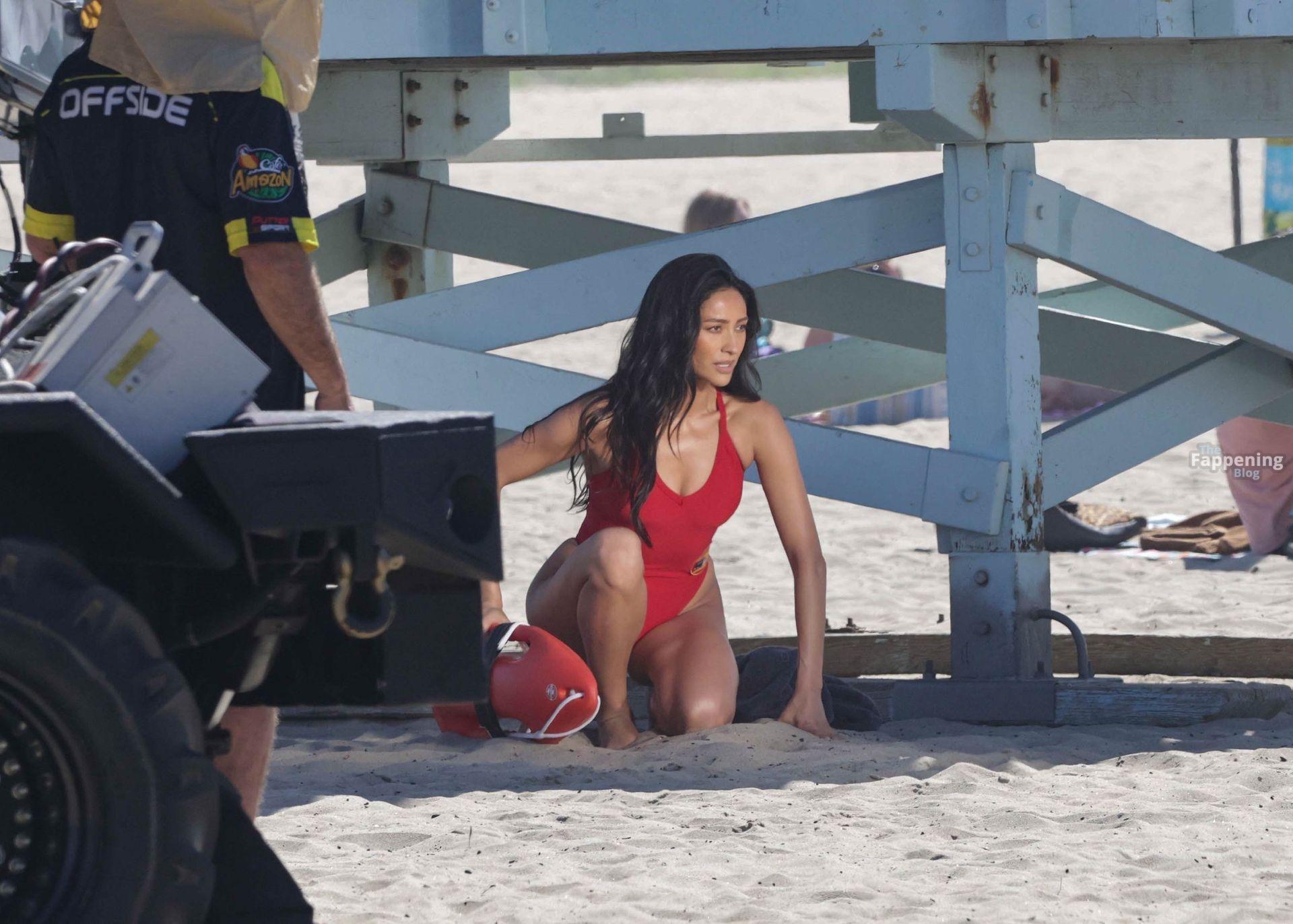 Shay Mitchell mostró su sexy cuerpo listo para la playa mientras filmaba escenas esta mañana para el reinicio de “Baywatch” de Fox.
