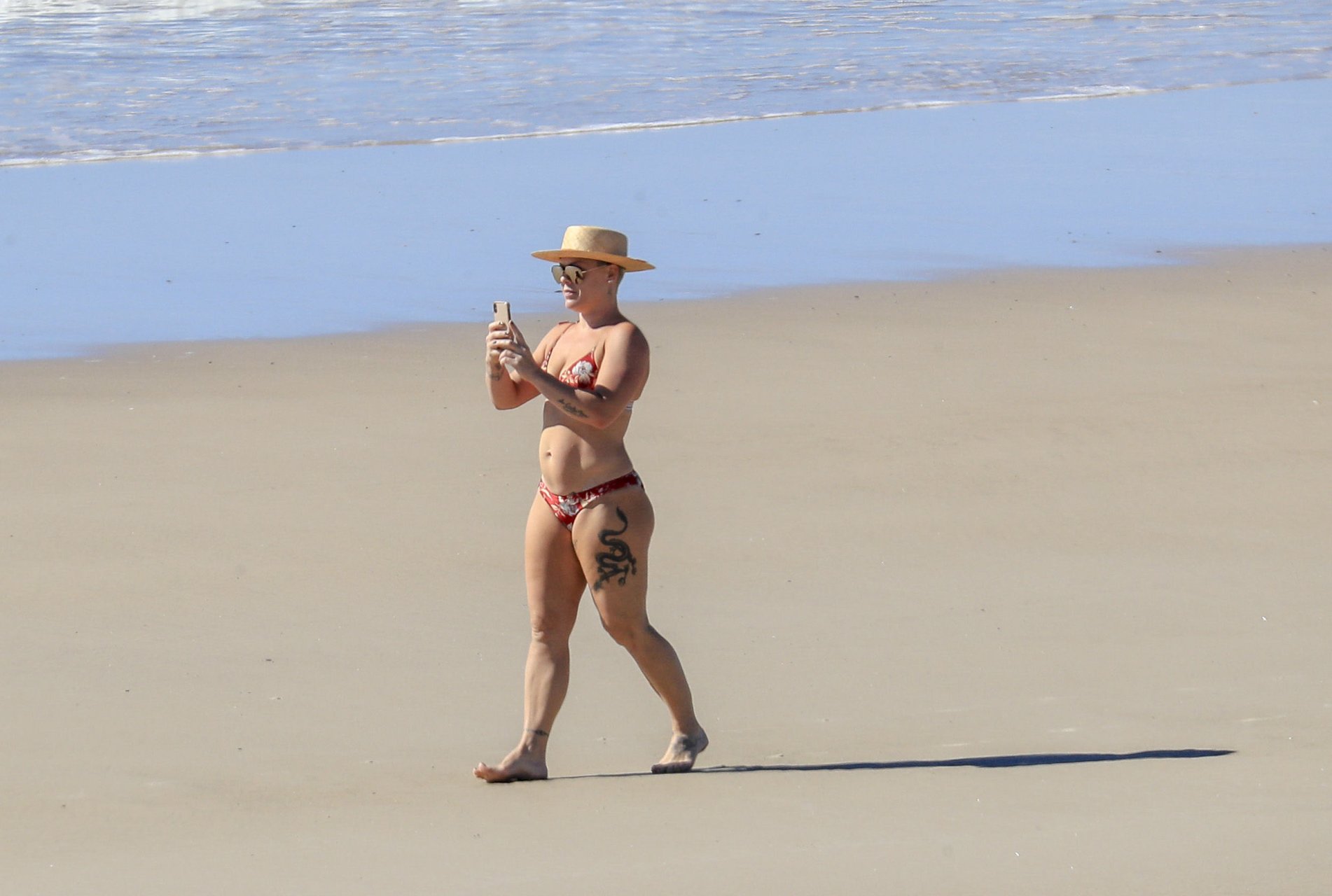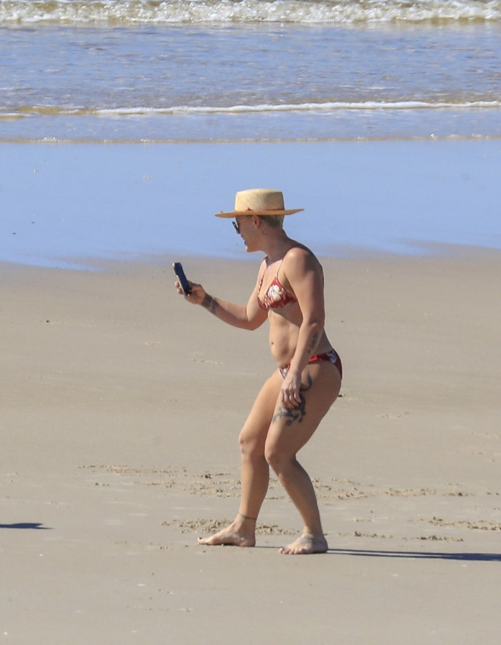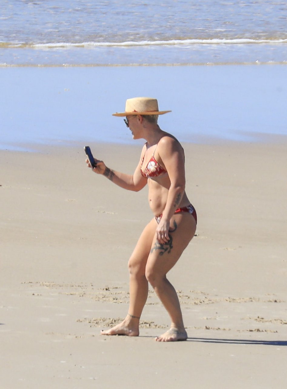 La estrella del pop Pink (Alecia Moore) disfruta del sol en bikini, mientras disfruta de un descanso junto a la playa durante su gira por Australia, en Byron Bay, 30/07/2018. P!nk (38) estuvo acompañada por su esposo, Carey Hart, y su familia en sus vacaciones en la playa.