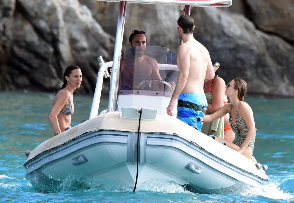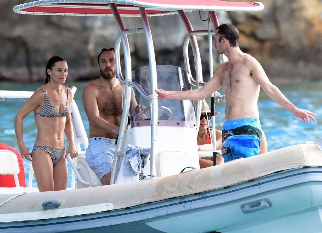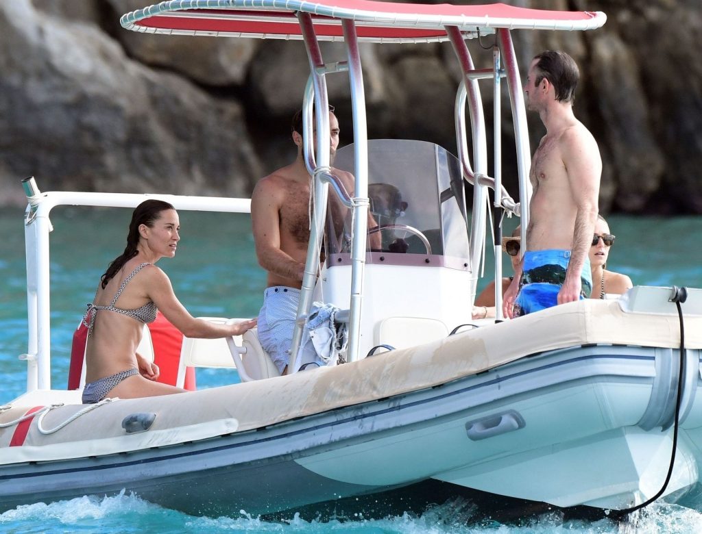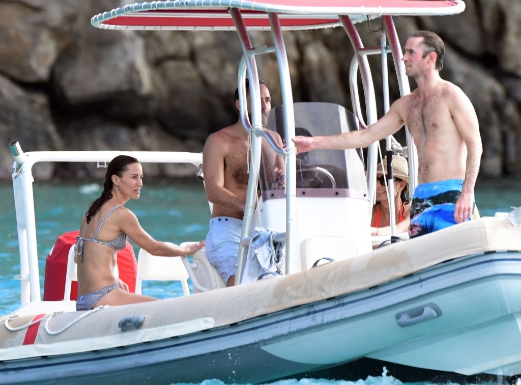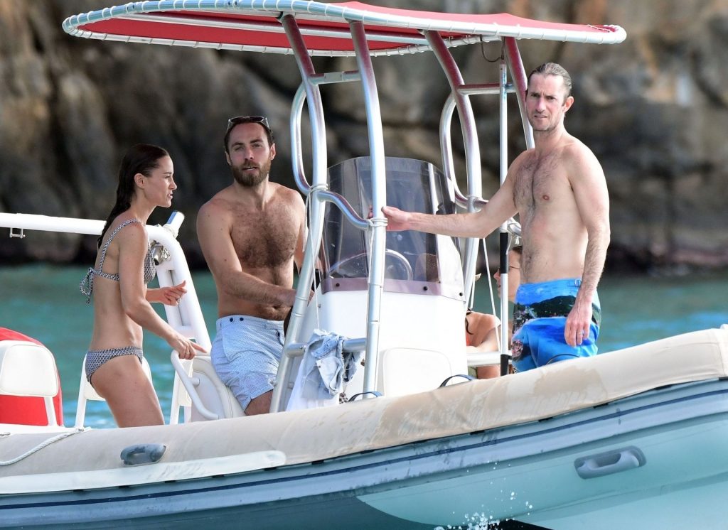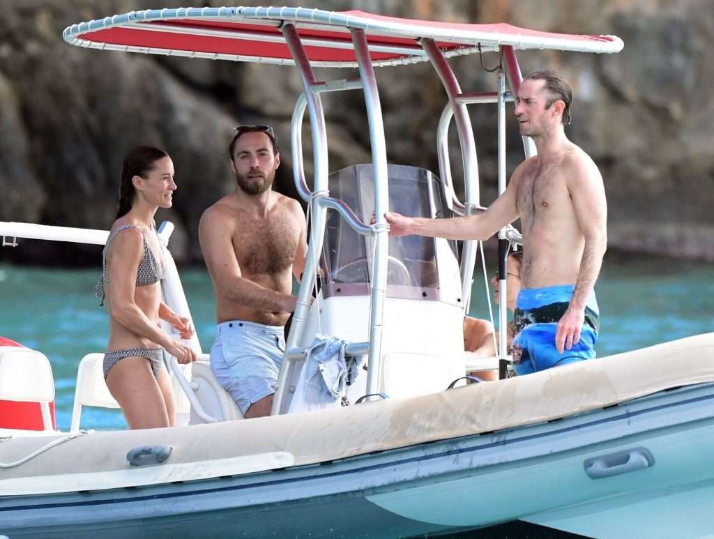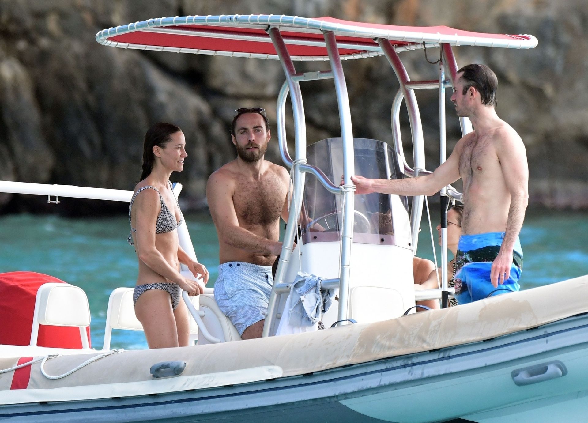La socialité Pippa Middleton, su hermano James Middleton y su esposo James Matthews, disfrutan de un paseo en barco a bordo de una pequeña embarcación en St. Barths, 30/12/2019.