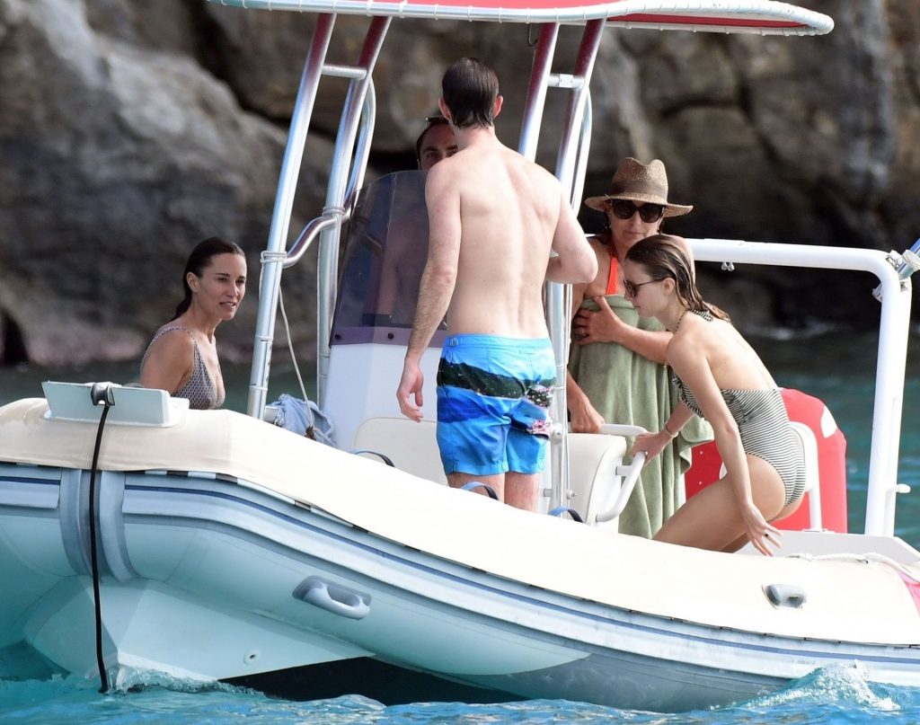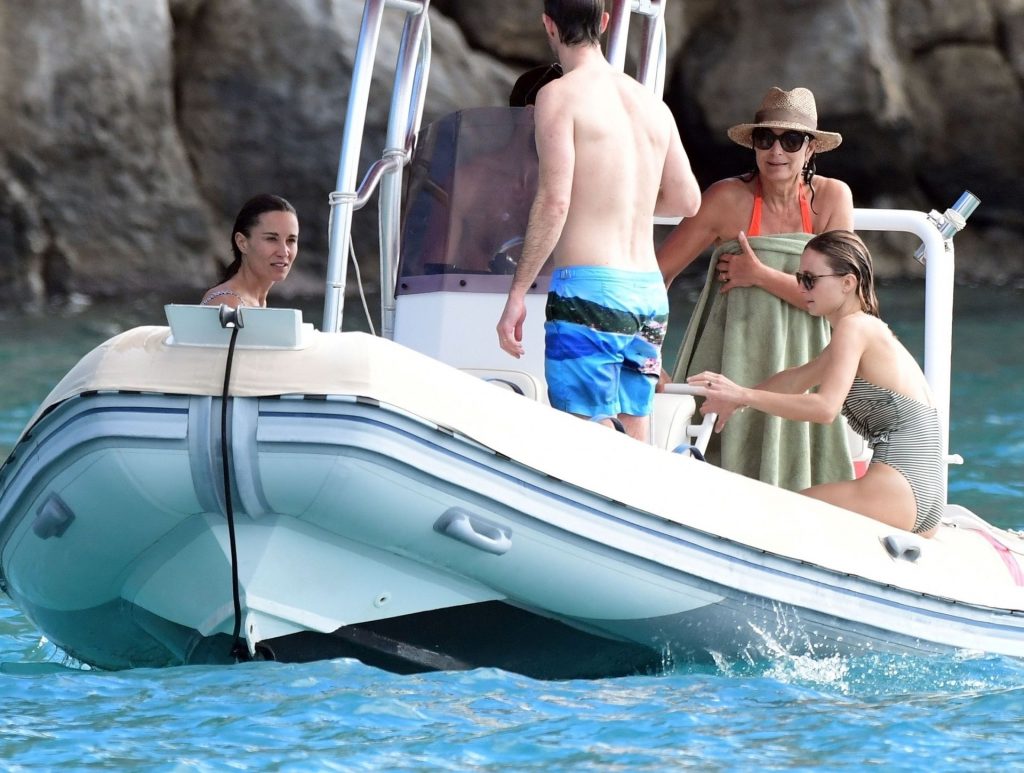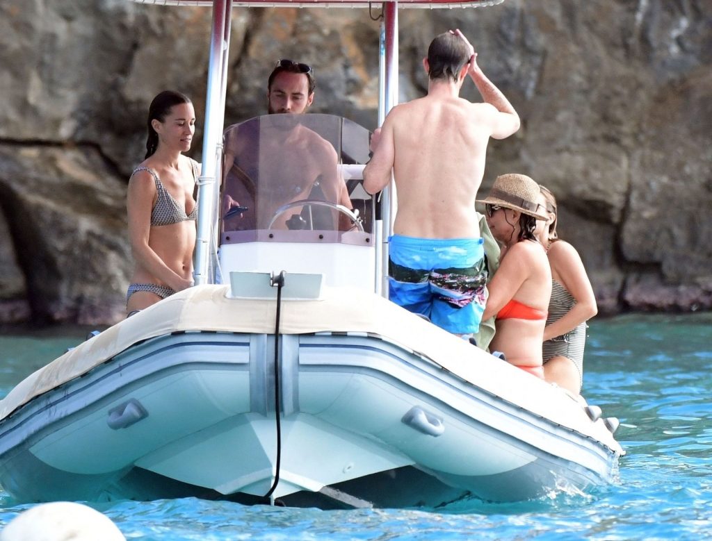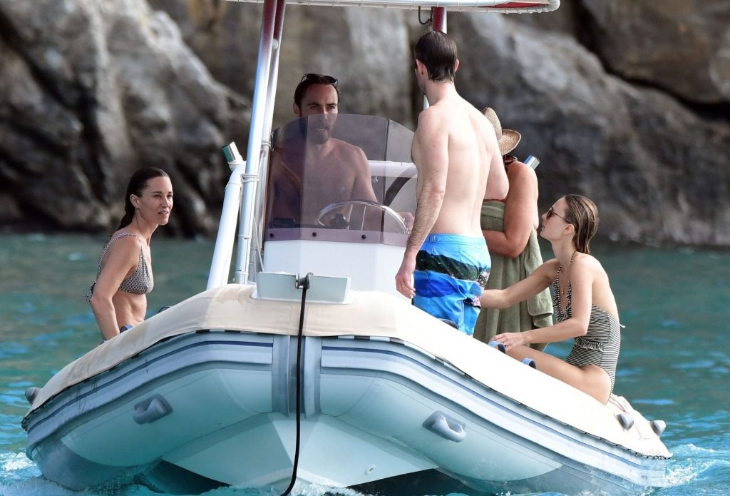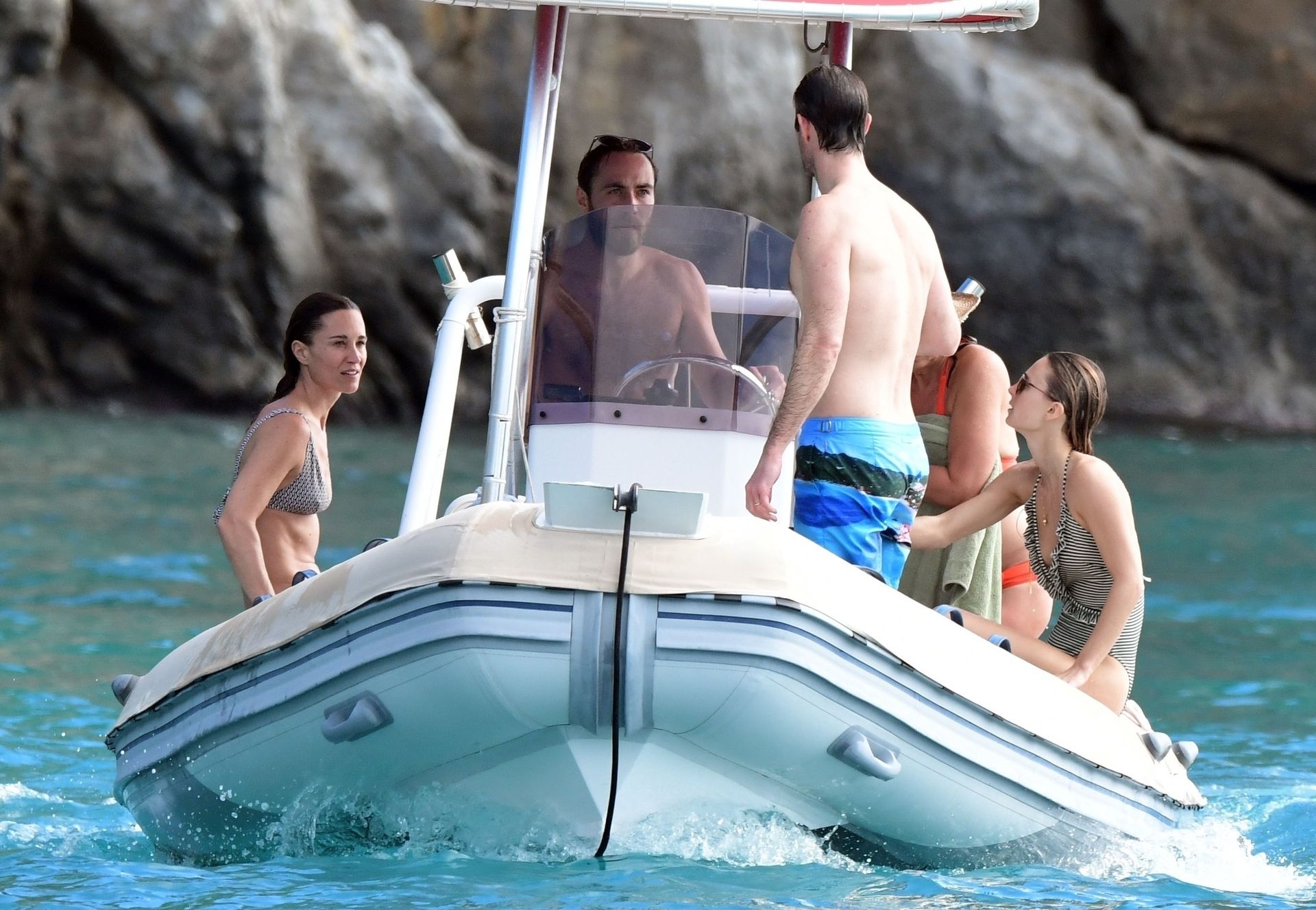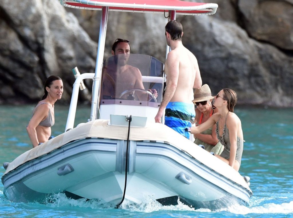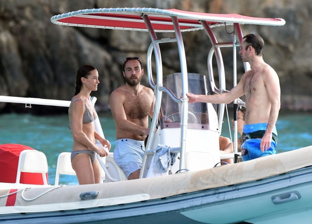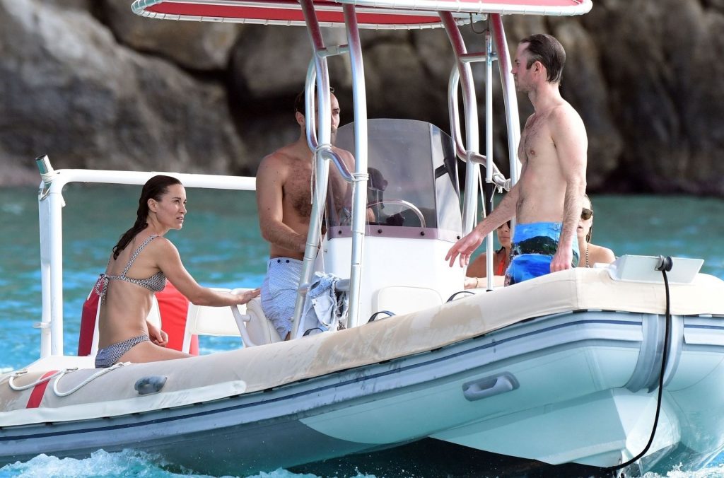 La socialité Pippa Middleton, su hermano James Middleton y su esposo James Matthews, disfrutan de un paseo en barco a bordo de una pequeña embarcación en St. Barths, 30/12/2019.