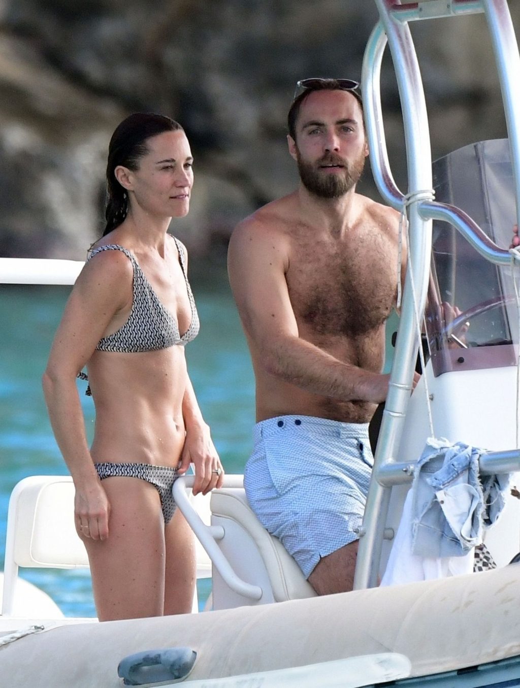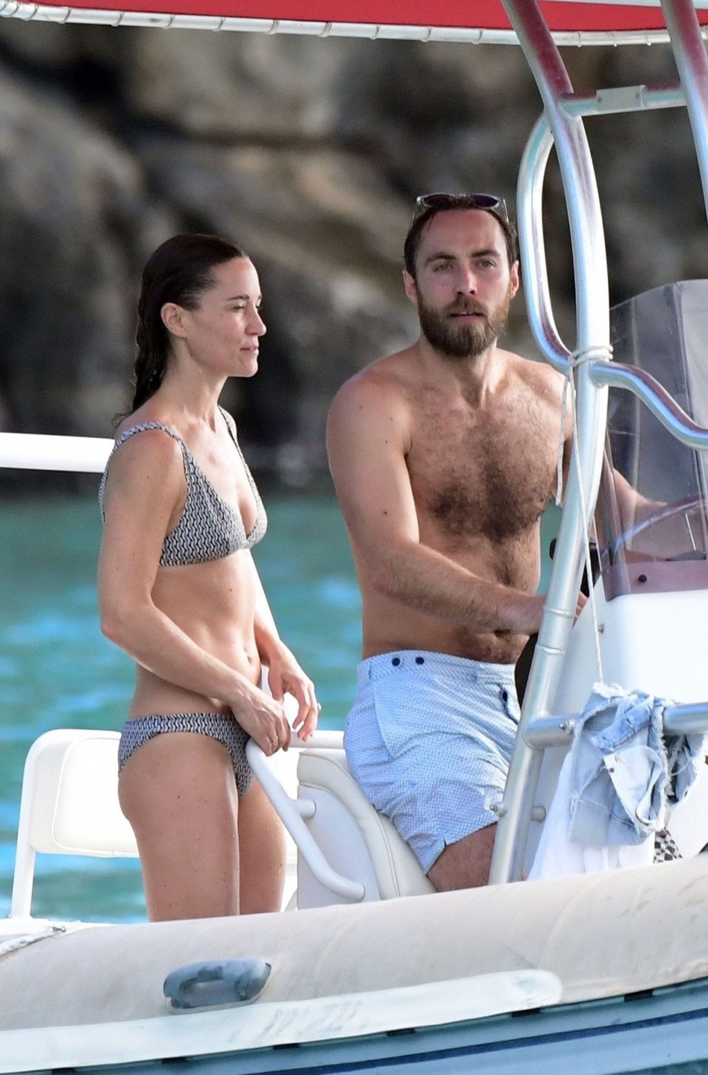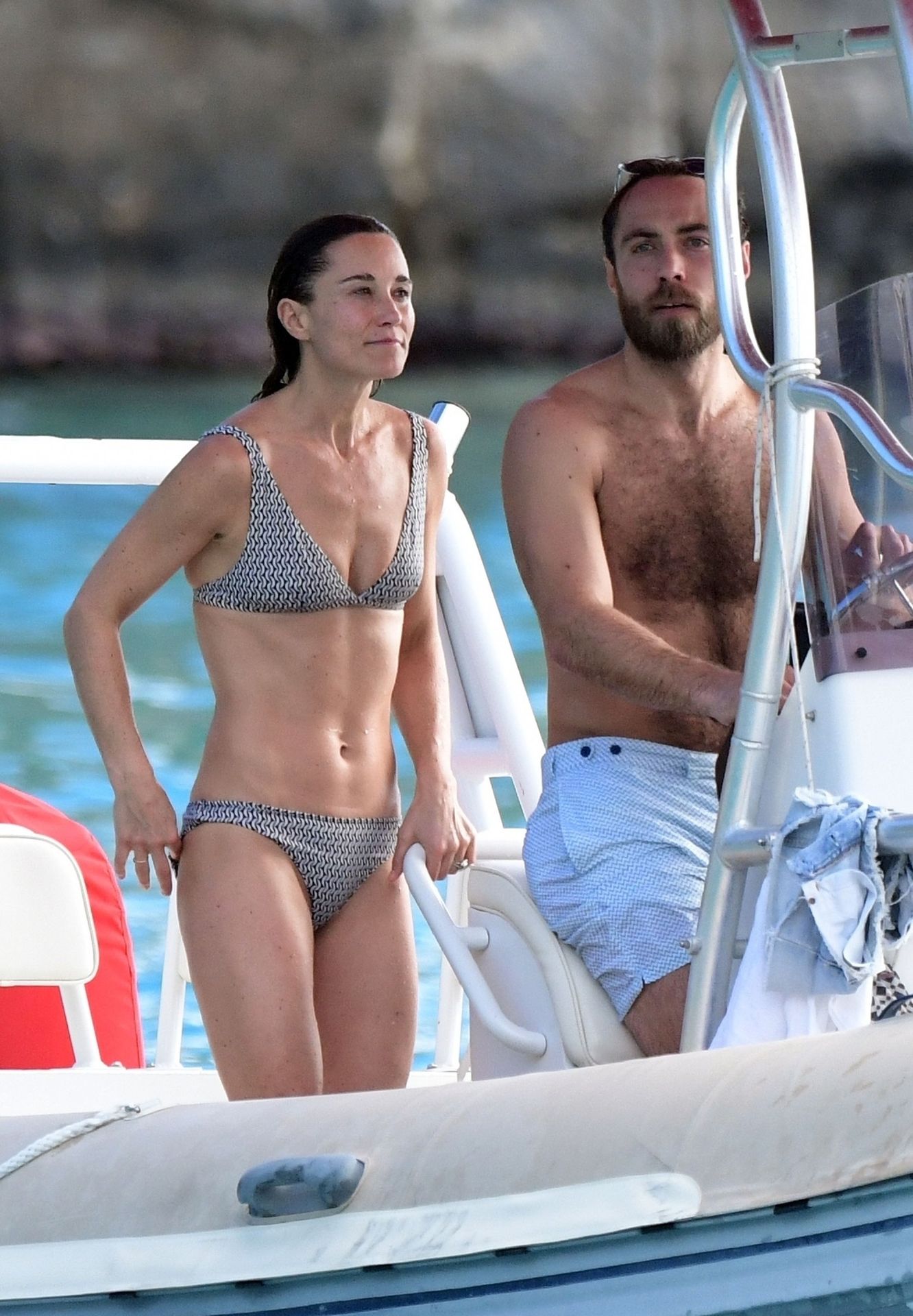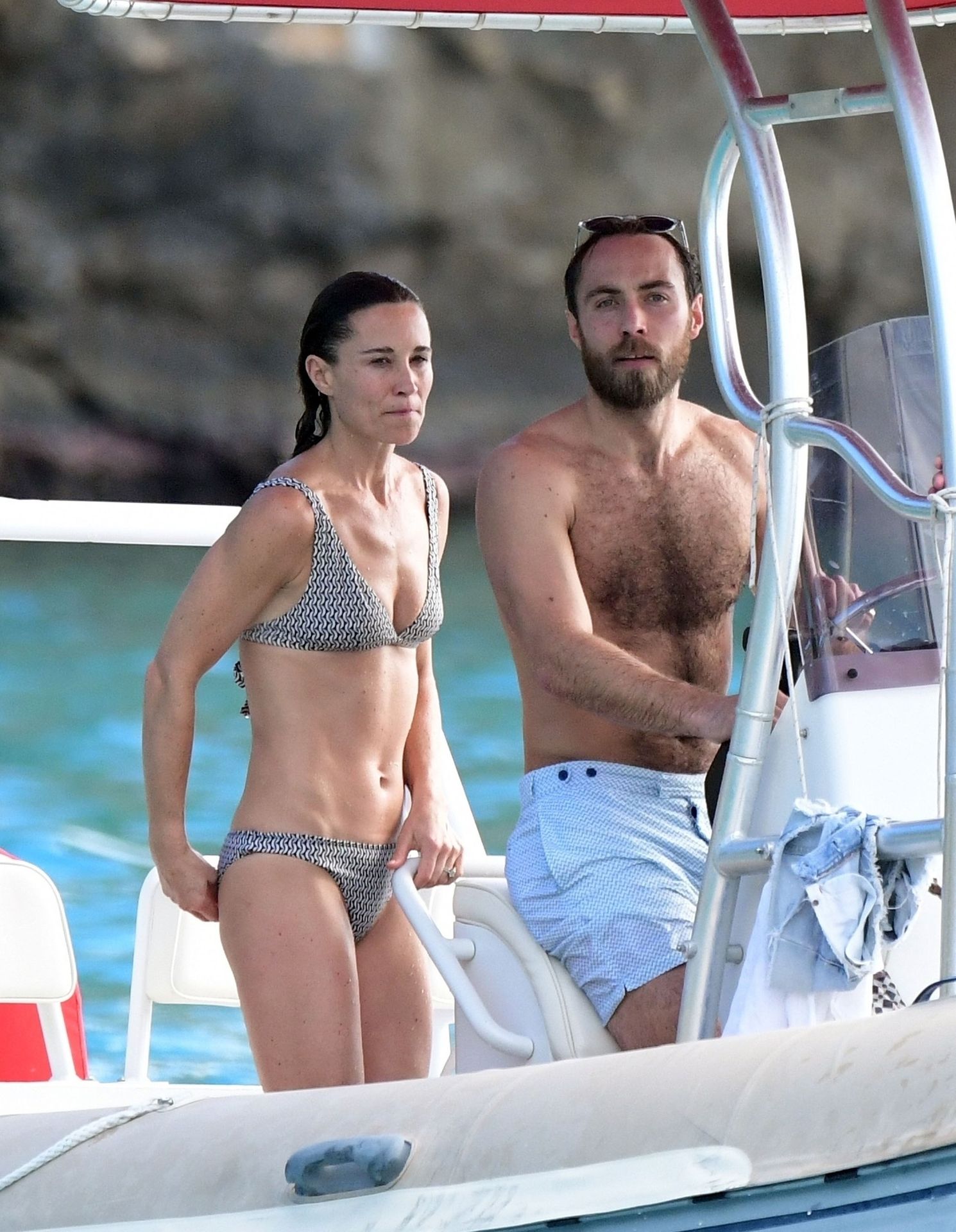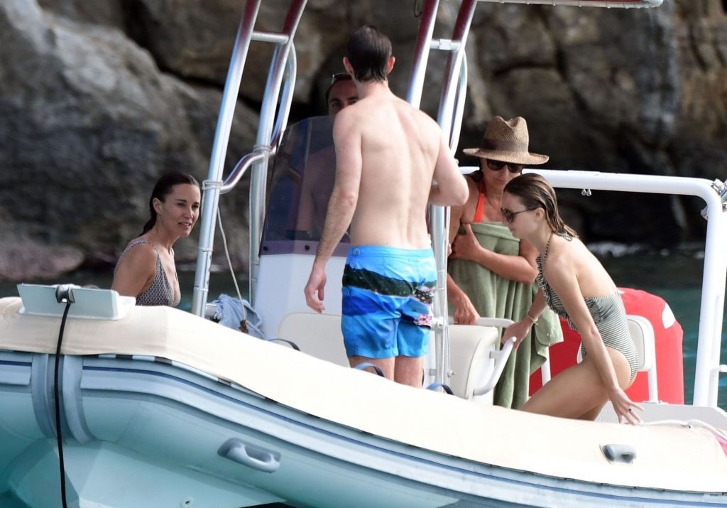 La socialité Pippa Middleton, su hermano James Middleton y su esposo James Matthews, disfrutan de un paseo en barco a bordo de una pequeña embarcación en St. Barths, 30/12/2019.