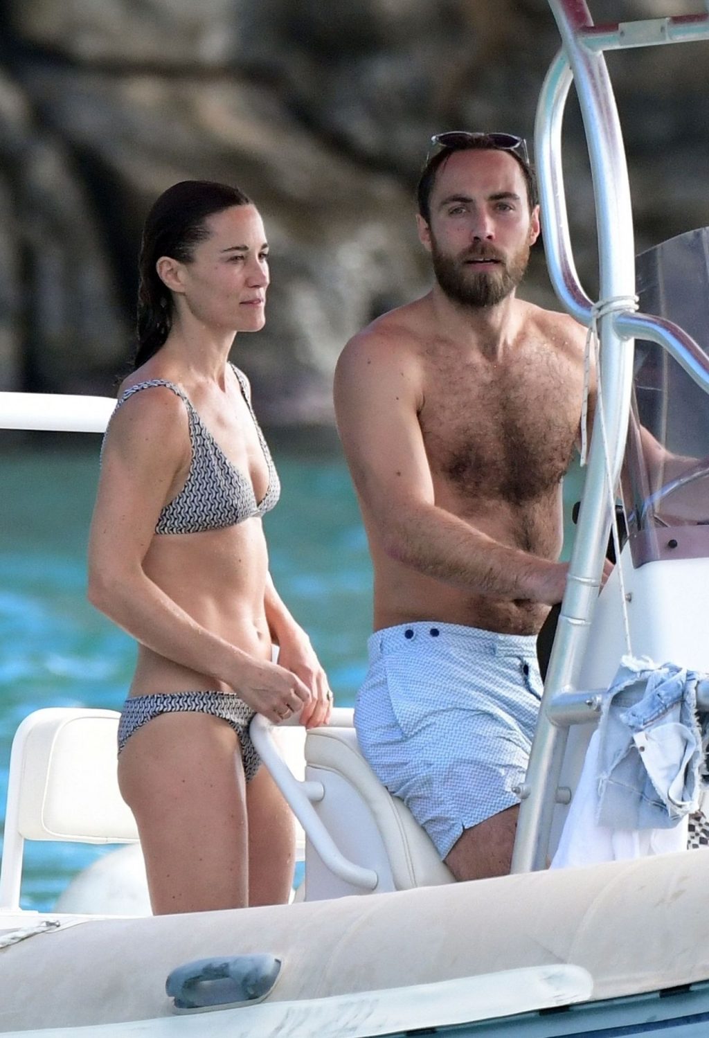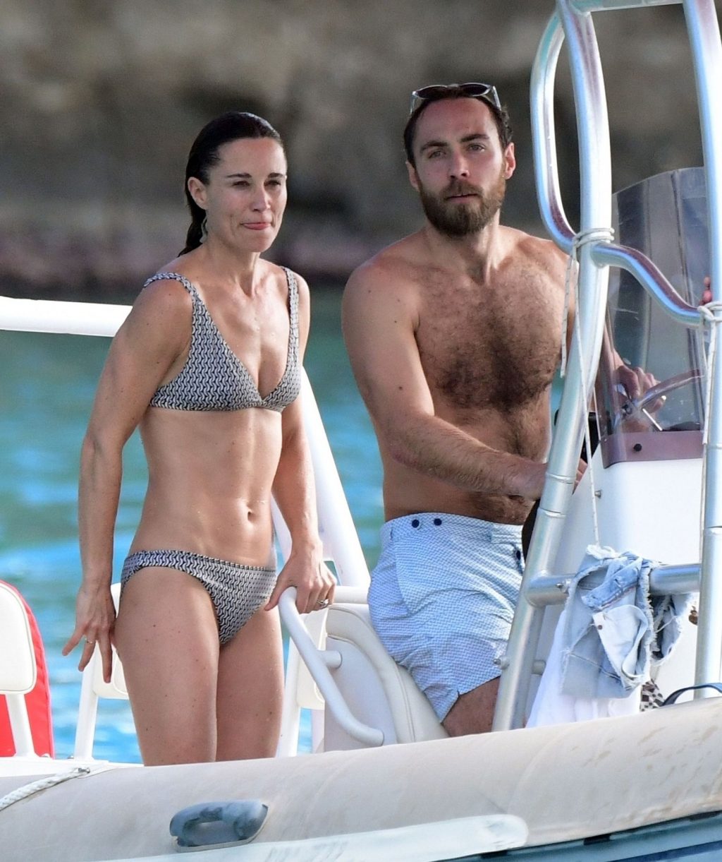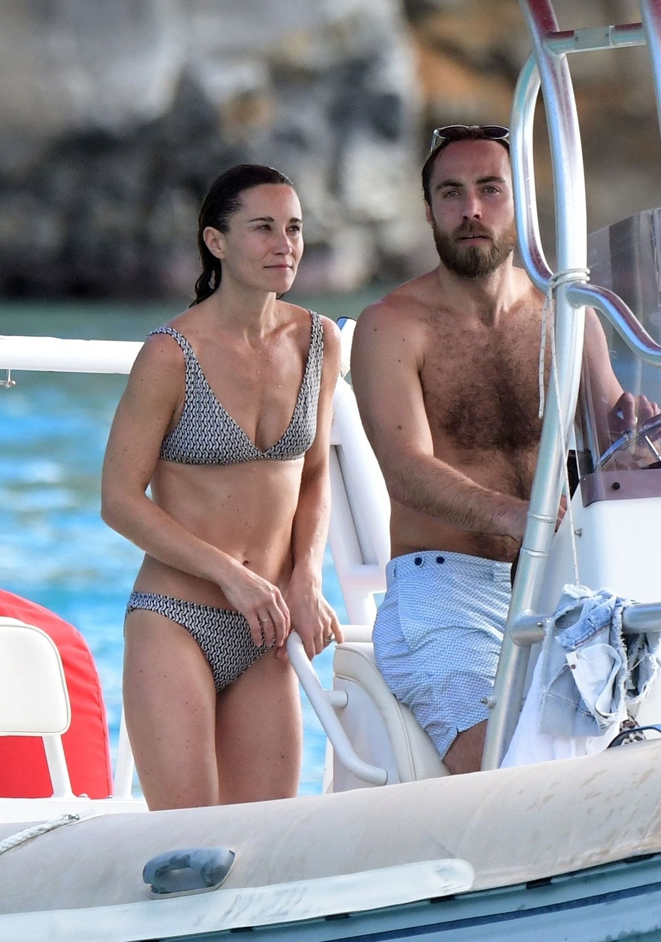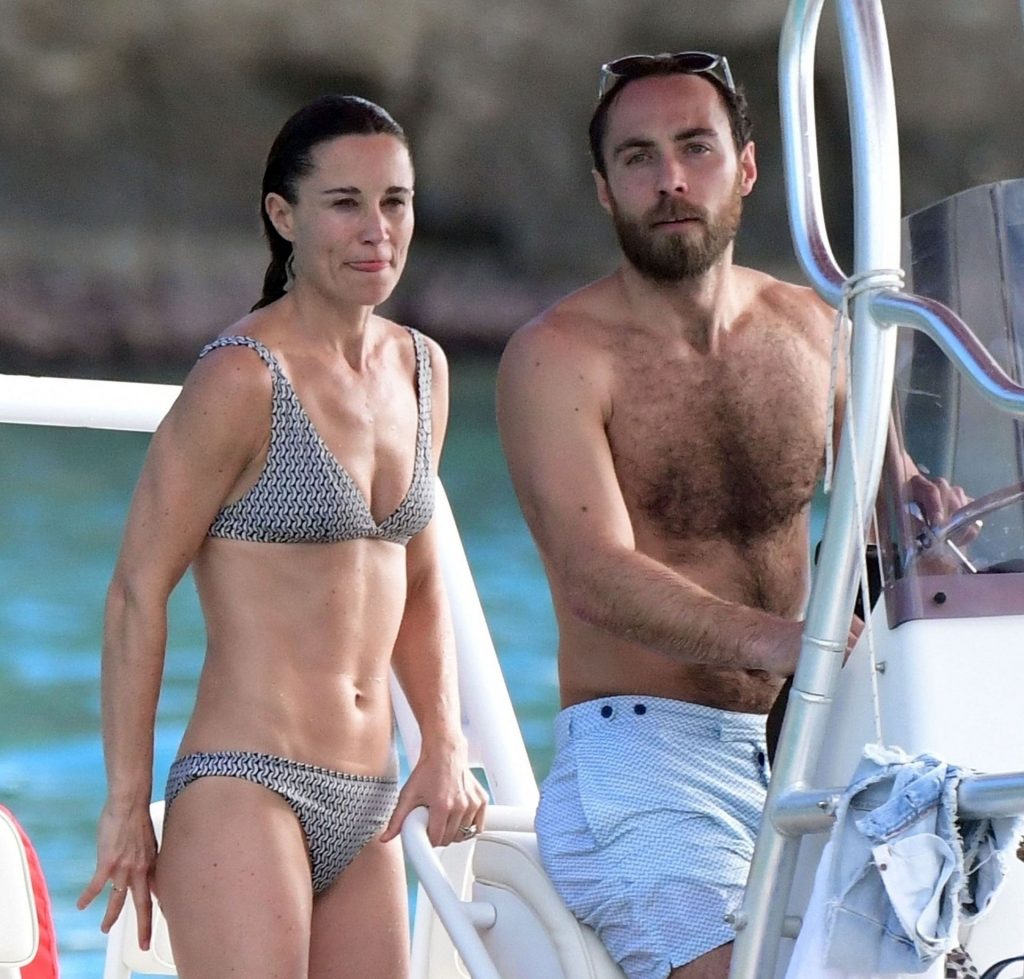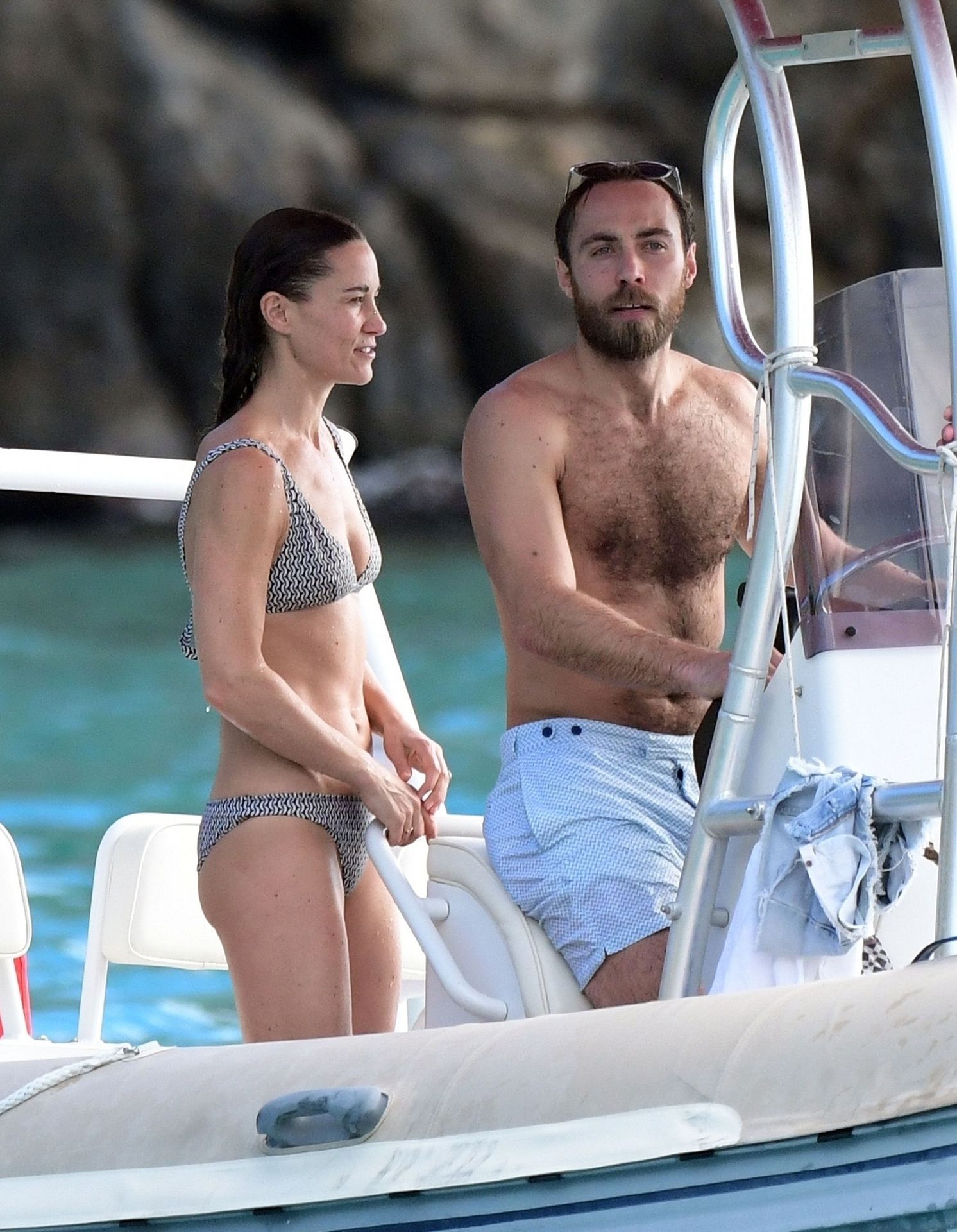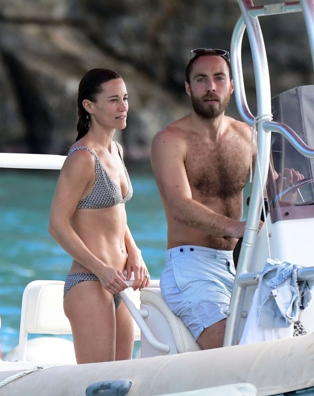 La socialité Pippa Middleton, su hermano James Middleton y su esposo James Matthews, disfrutan de un paseo en barco a bordo de una pequeña embarcación en St. Barths, 30/12/2019.