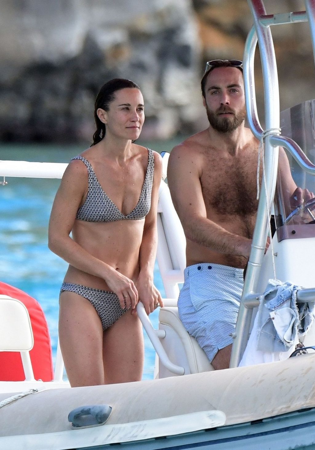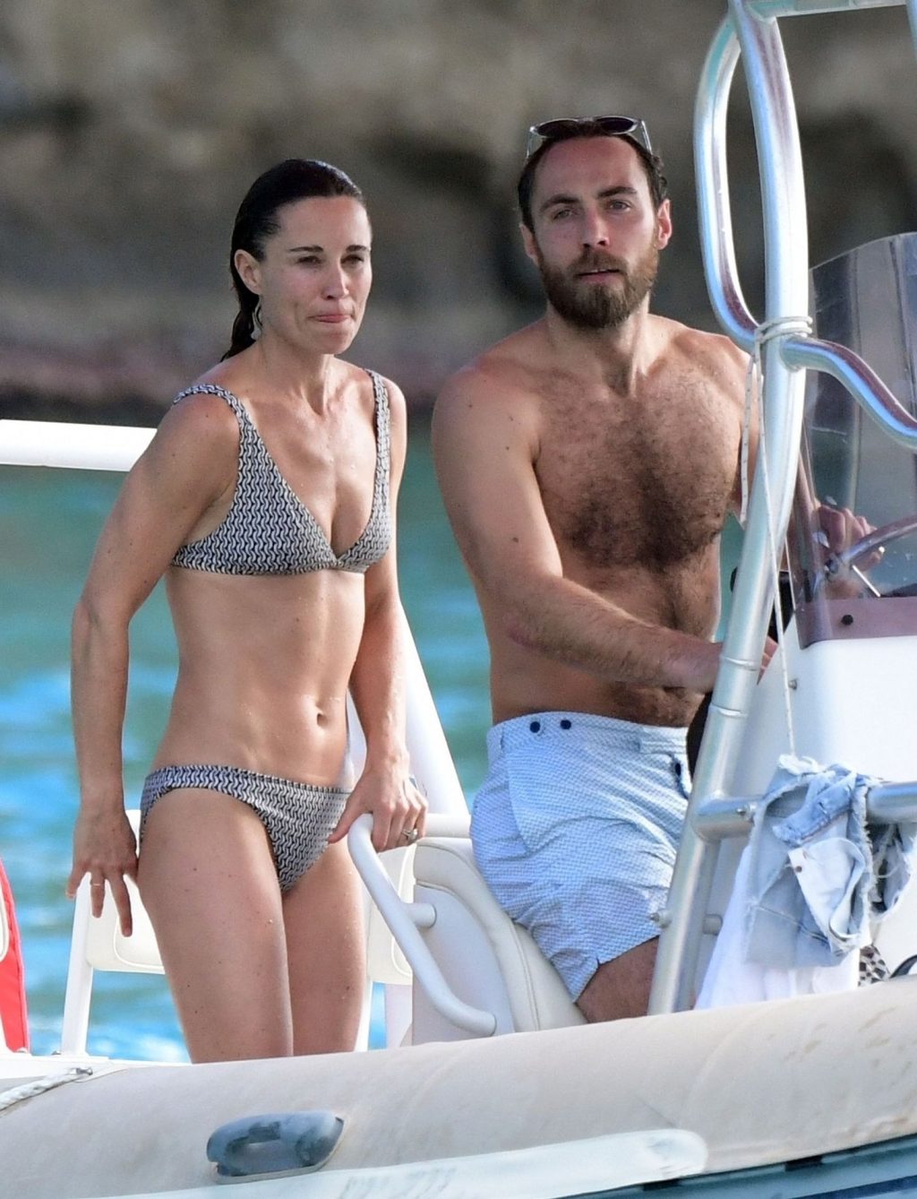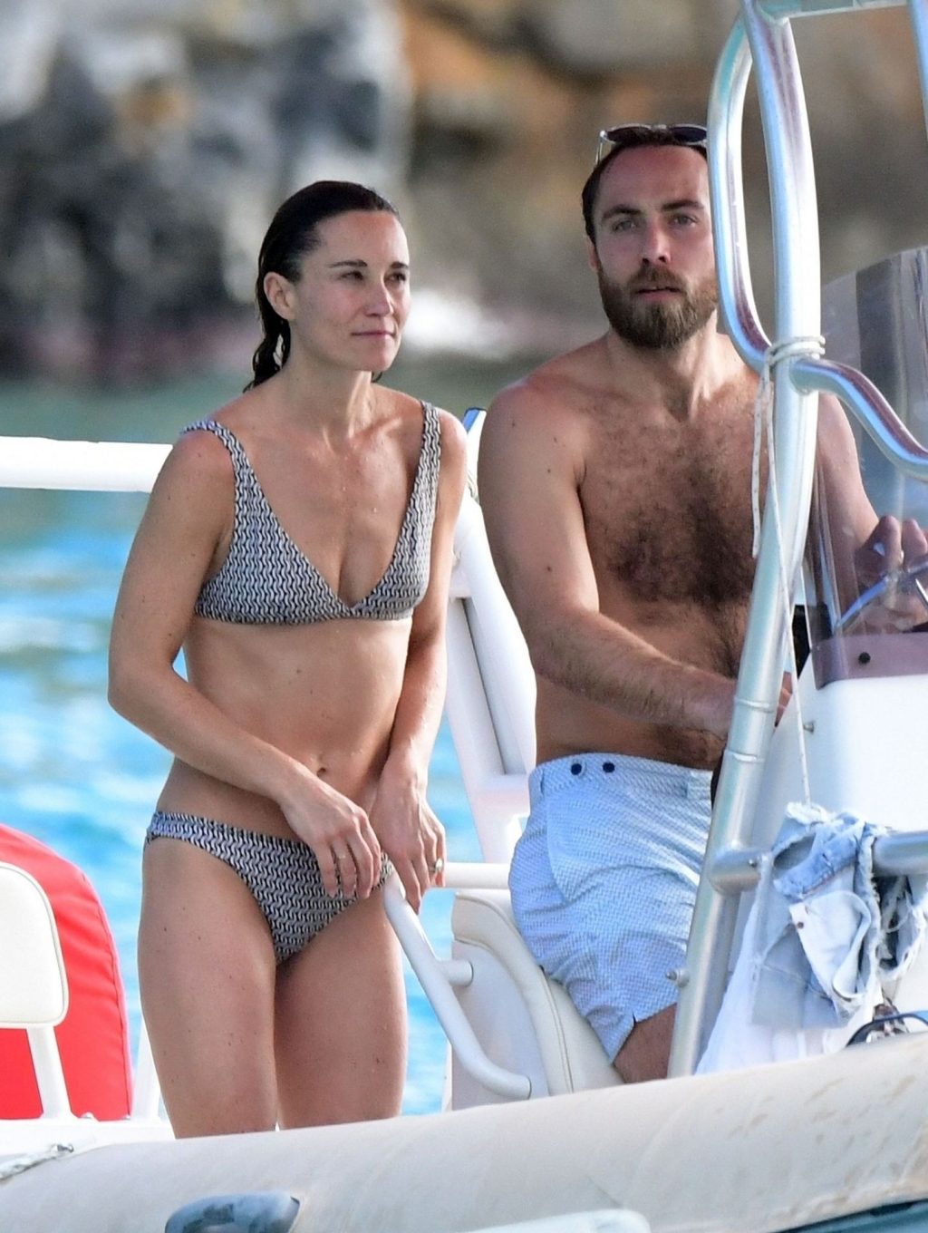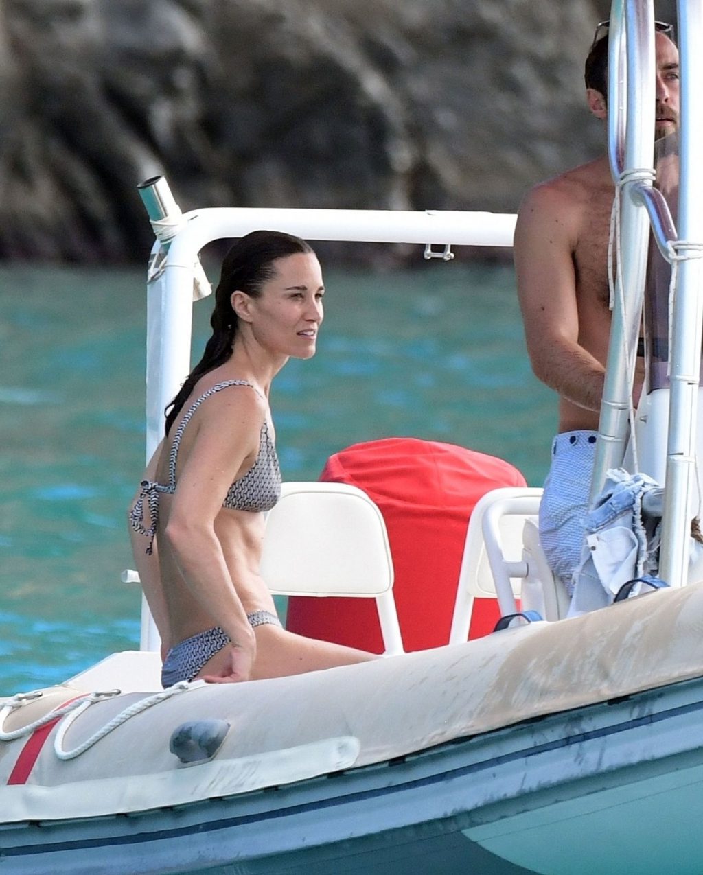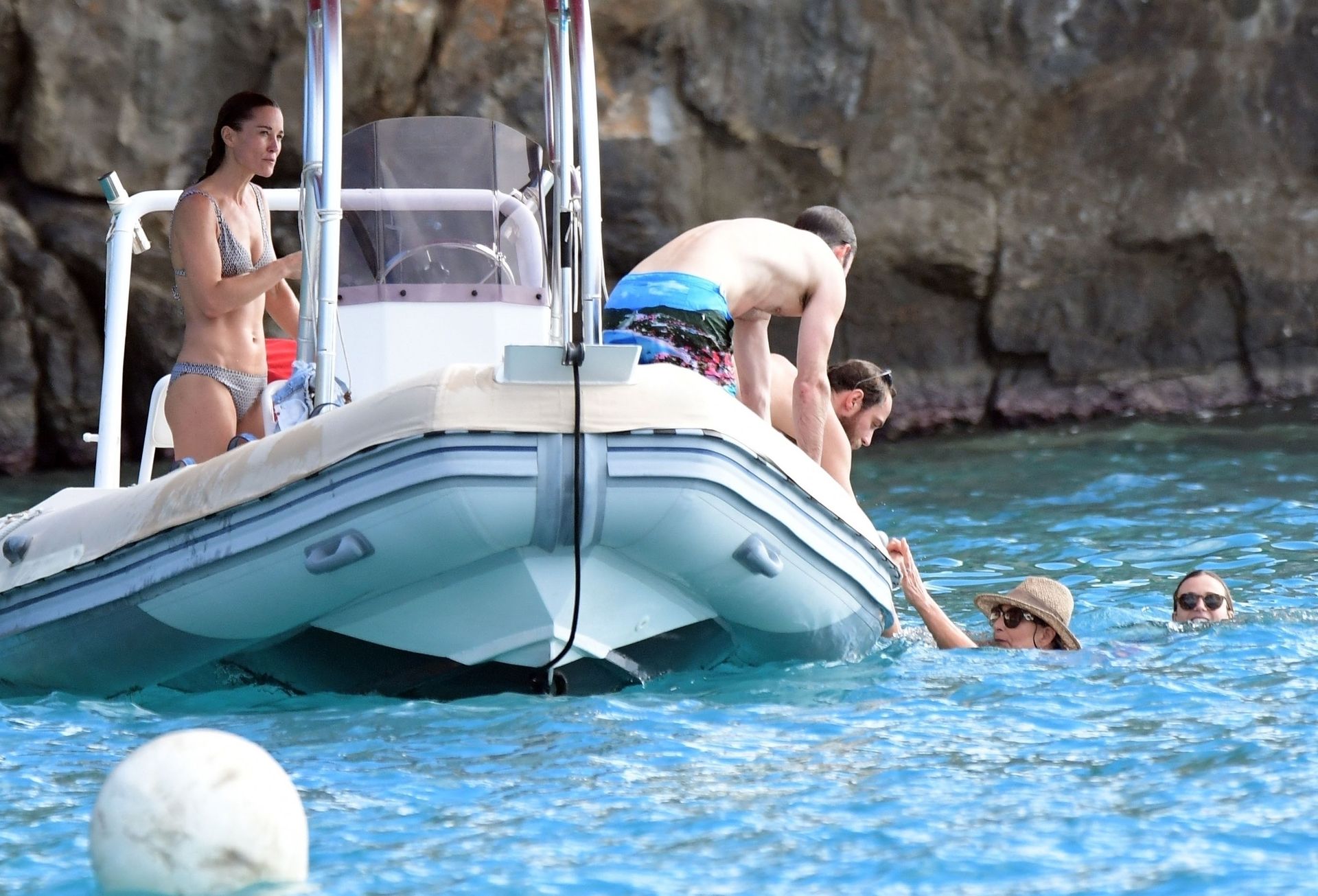 La socialité Pippa Middleton, su hermano James Middleton y su esposo James Matthews, disfrutan de un paseo en barco a bordo de una pequeña embarcación en St. Barths, 30/12/2019.