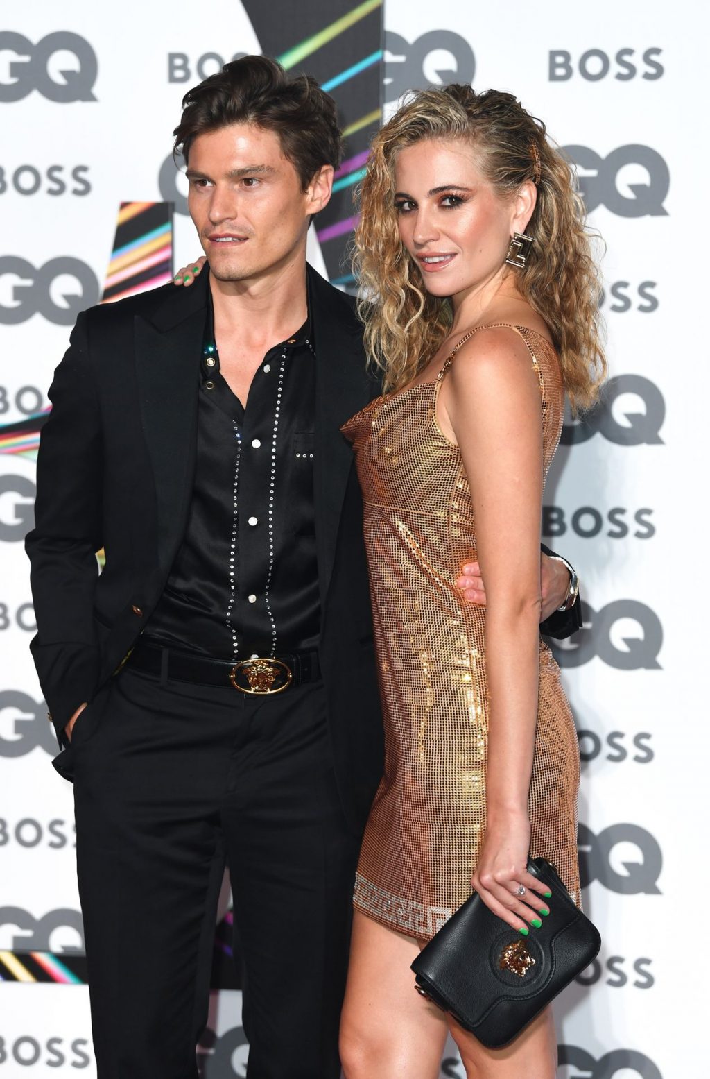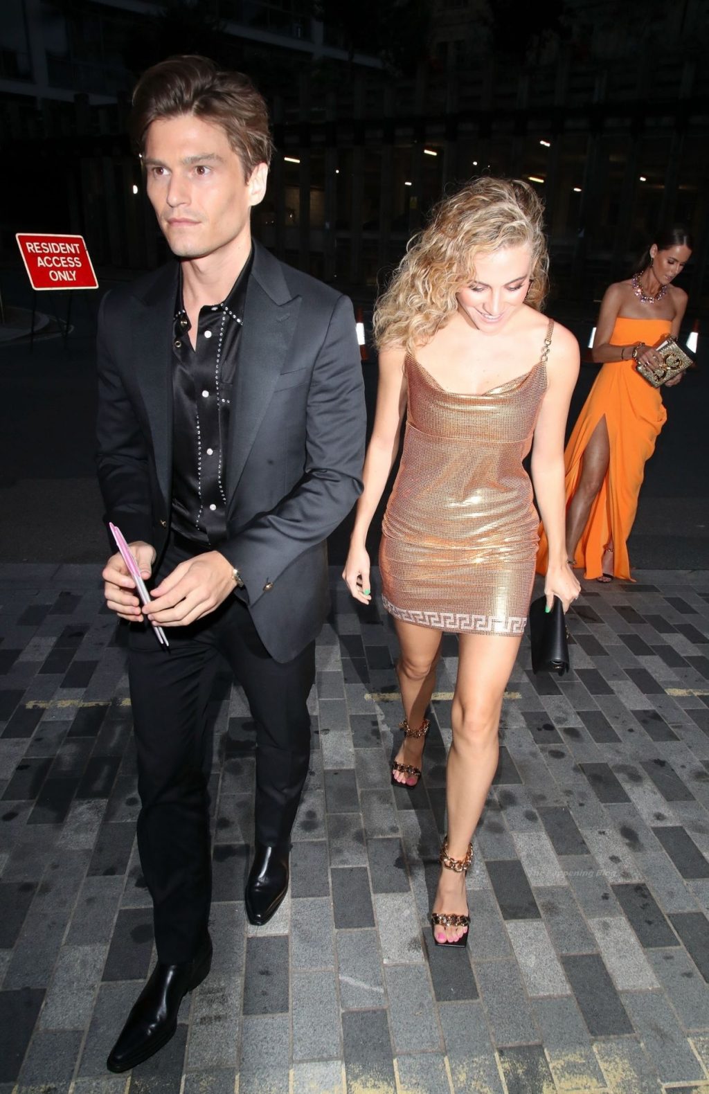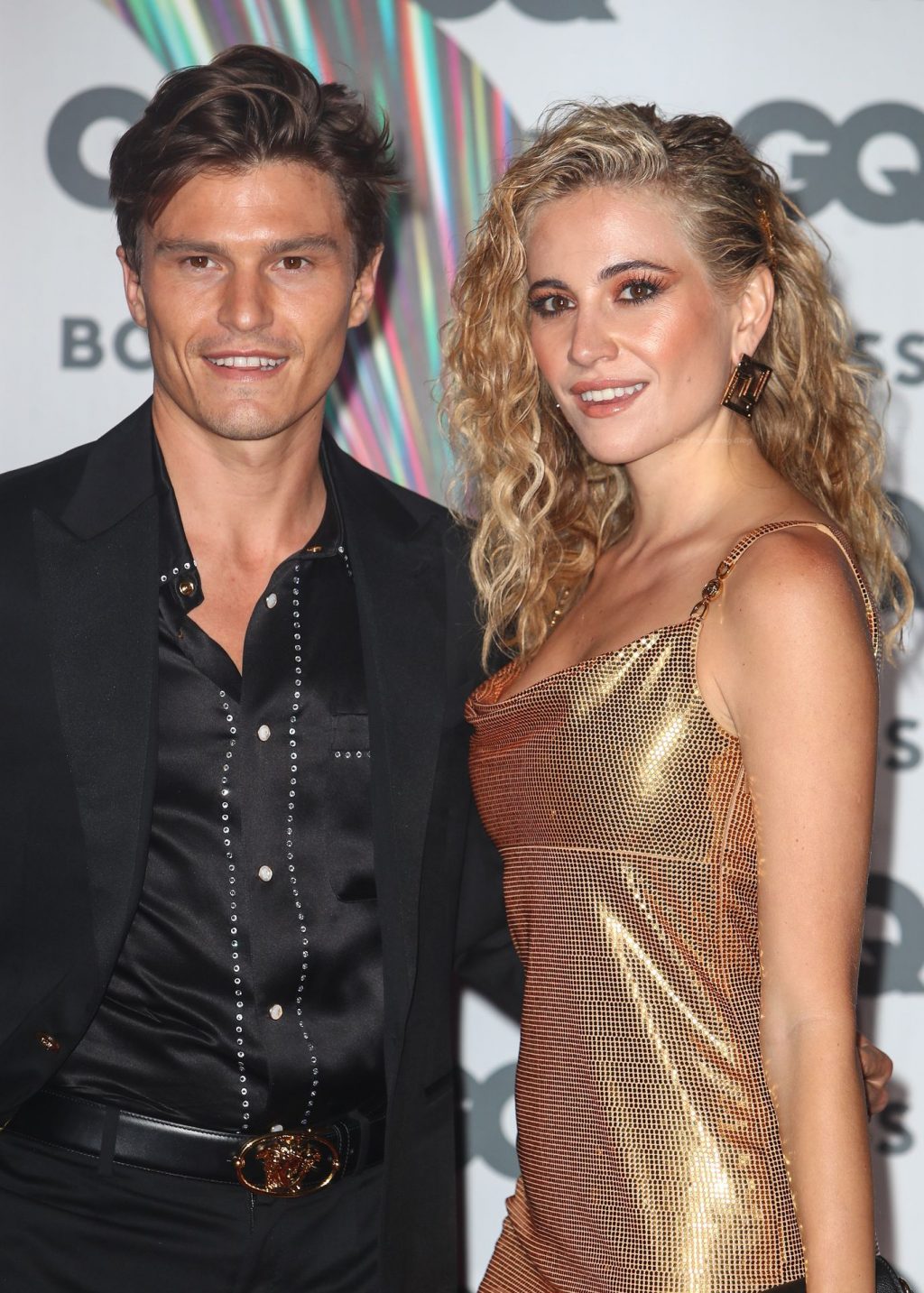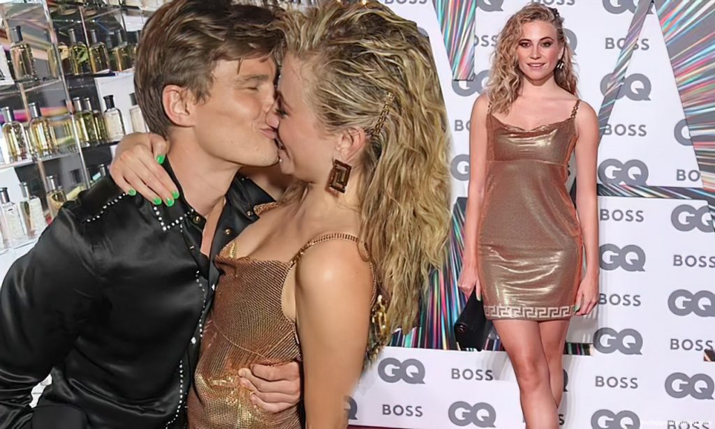 Ella deslumbra con un vestido dorado que roza el muslo y comparte un beso con su apuesto prometido, el modelo Oliver Cheshire, en la alfombra roja. Pixie parece cansada en su taxi con su pareja después del evento.