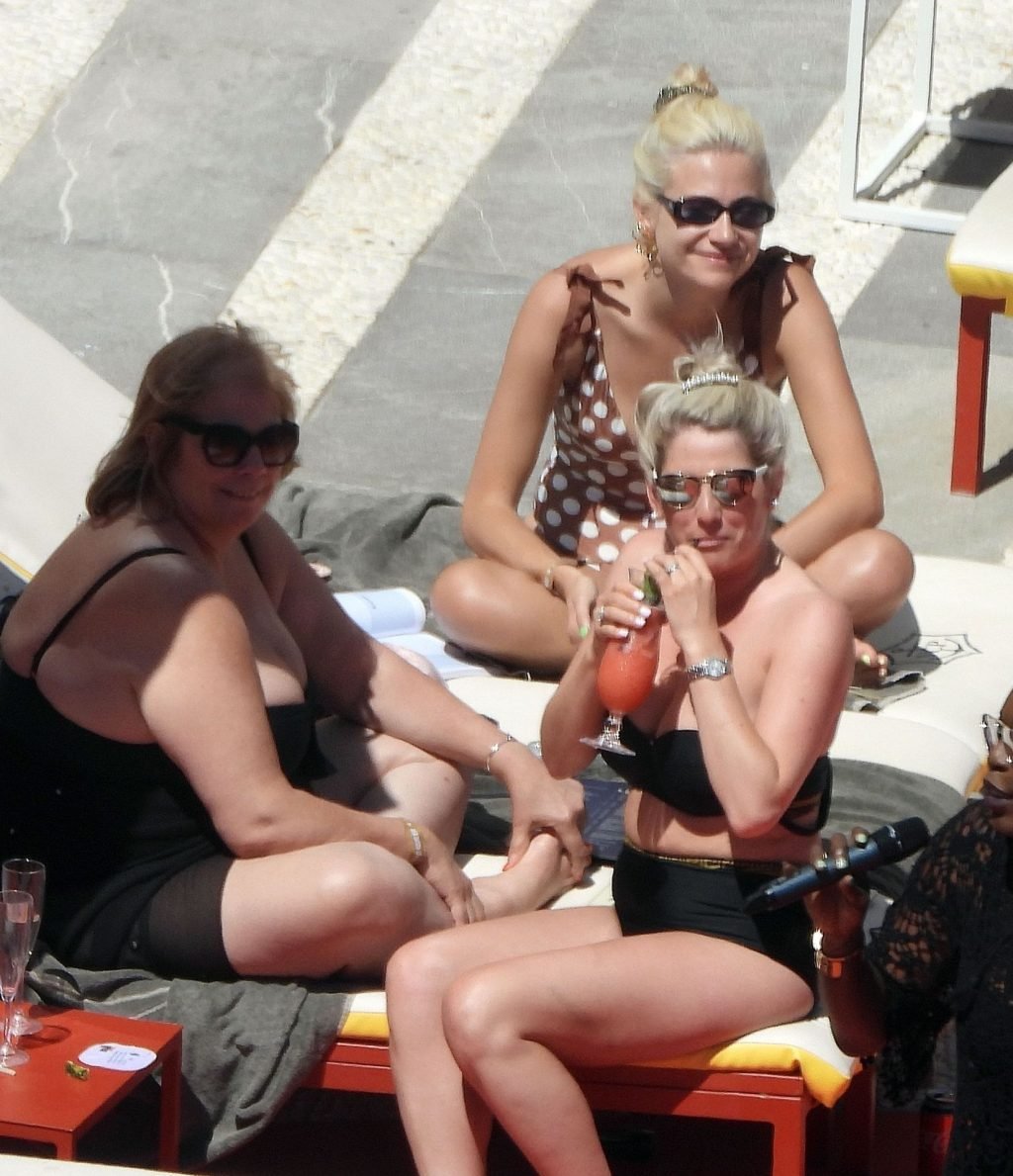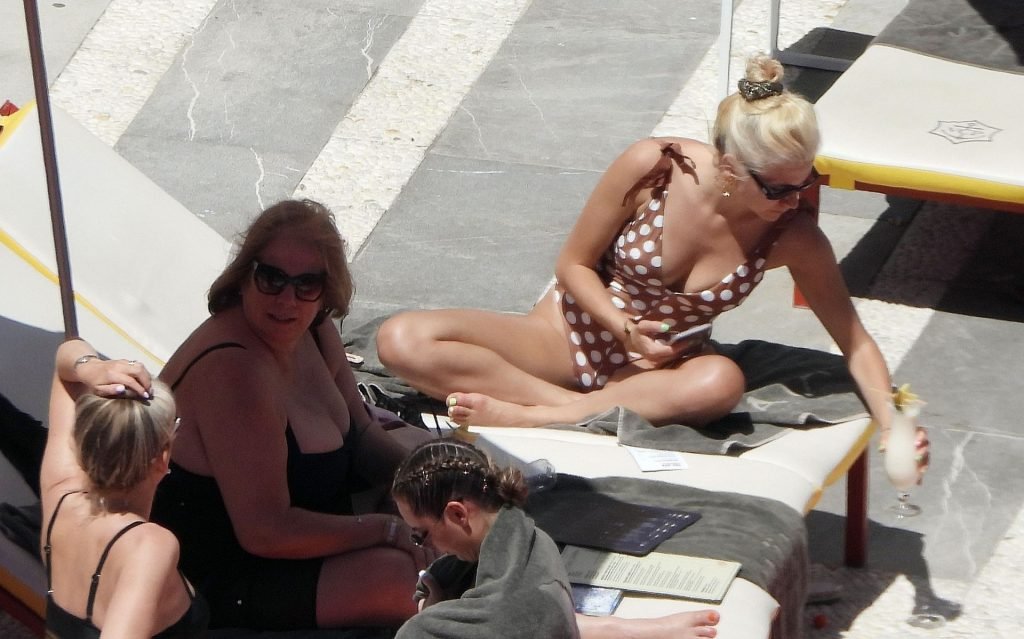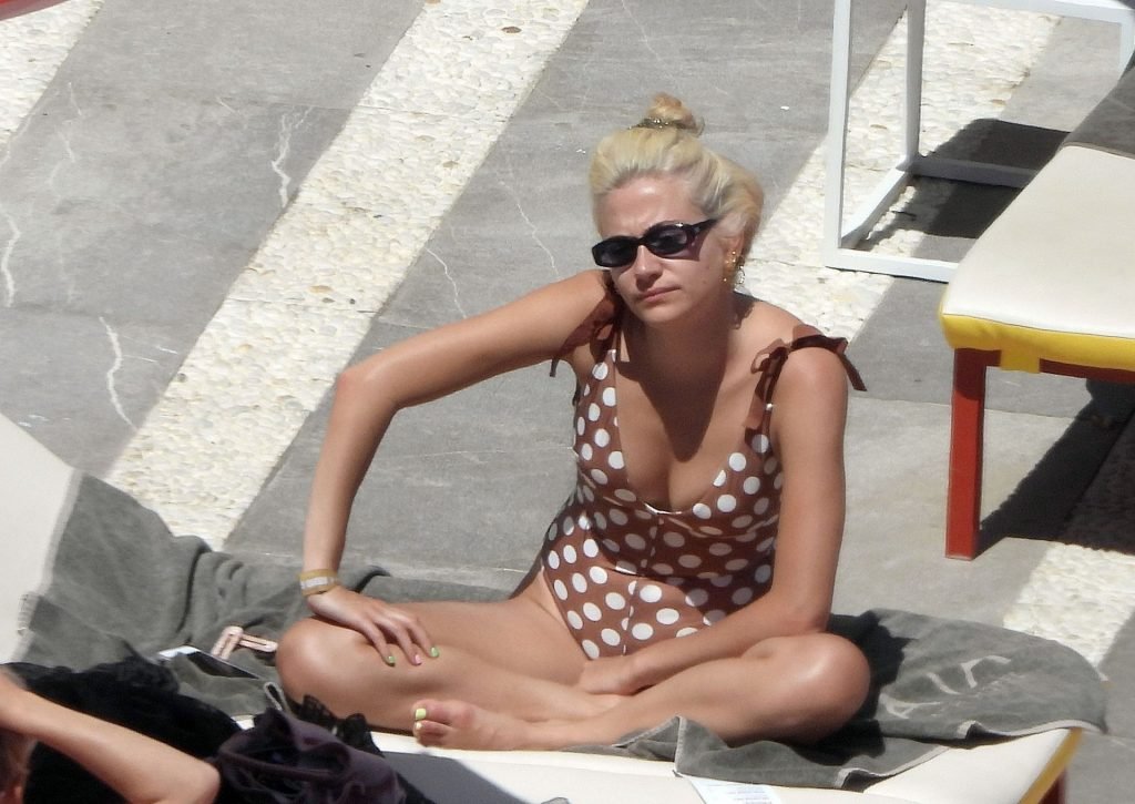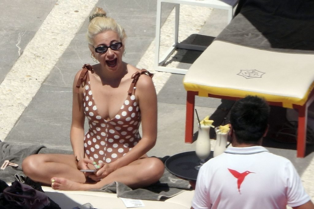 La cantante Pixie Lott luce sensacional con un traje de baño de lunares mientras se relaja junto a la piscina en Ibiza, 31/05/2019. La cantante fue fotografiada descansando en una tumbona mientras veía a un cantante actuar y bebía un cóctel!