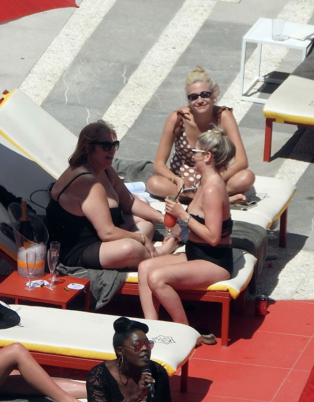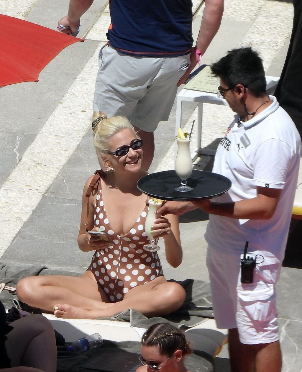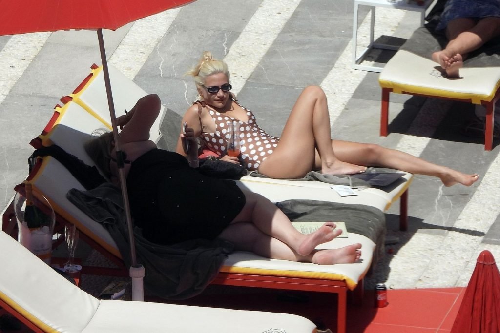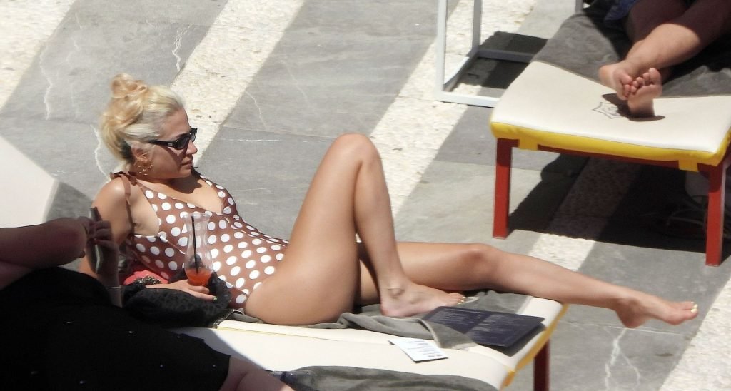 La cantante Pixie Lott luce sensacional con un traje de baño de lunares mientras se relaja junto a la piscina en Ibiza, 31/05/2019. La cantante fue fotografiada descansando en una tumbona mientras veía a un cantante actuar y bebía un cóctel!