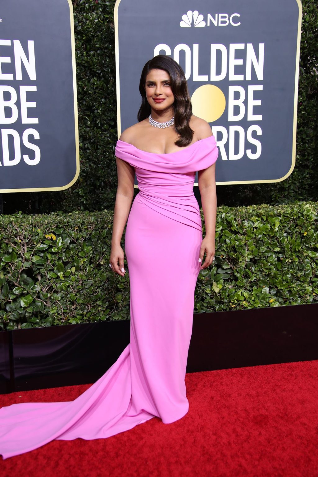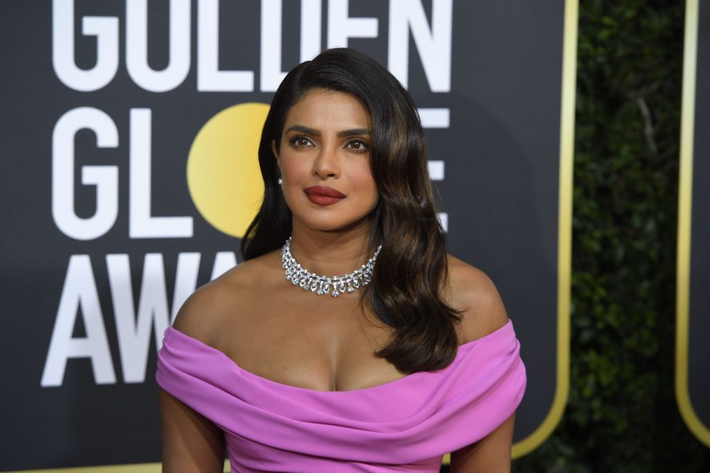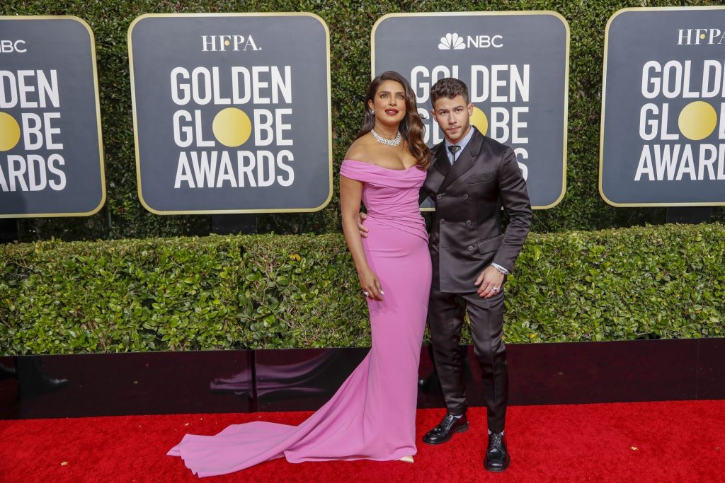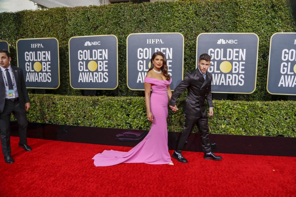 Actriz Priyanka Chopra llega a la alfombra roja durante la 77ª Entrega Anual de los Globos de Oro en The Beverly Hilton Hotel, 01/05/2020. Para la prestigiosa ceremonia en Beverly Hills, la belleza india eligió un vestido rosa de Cristina Ottaviano.
