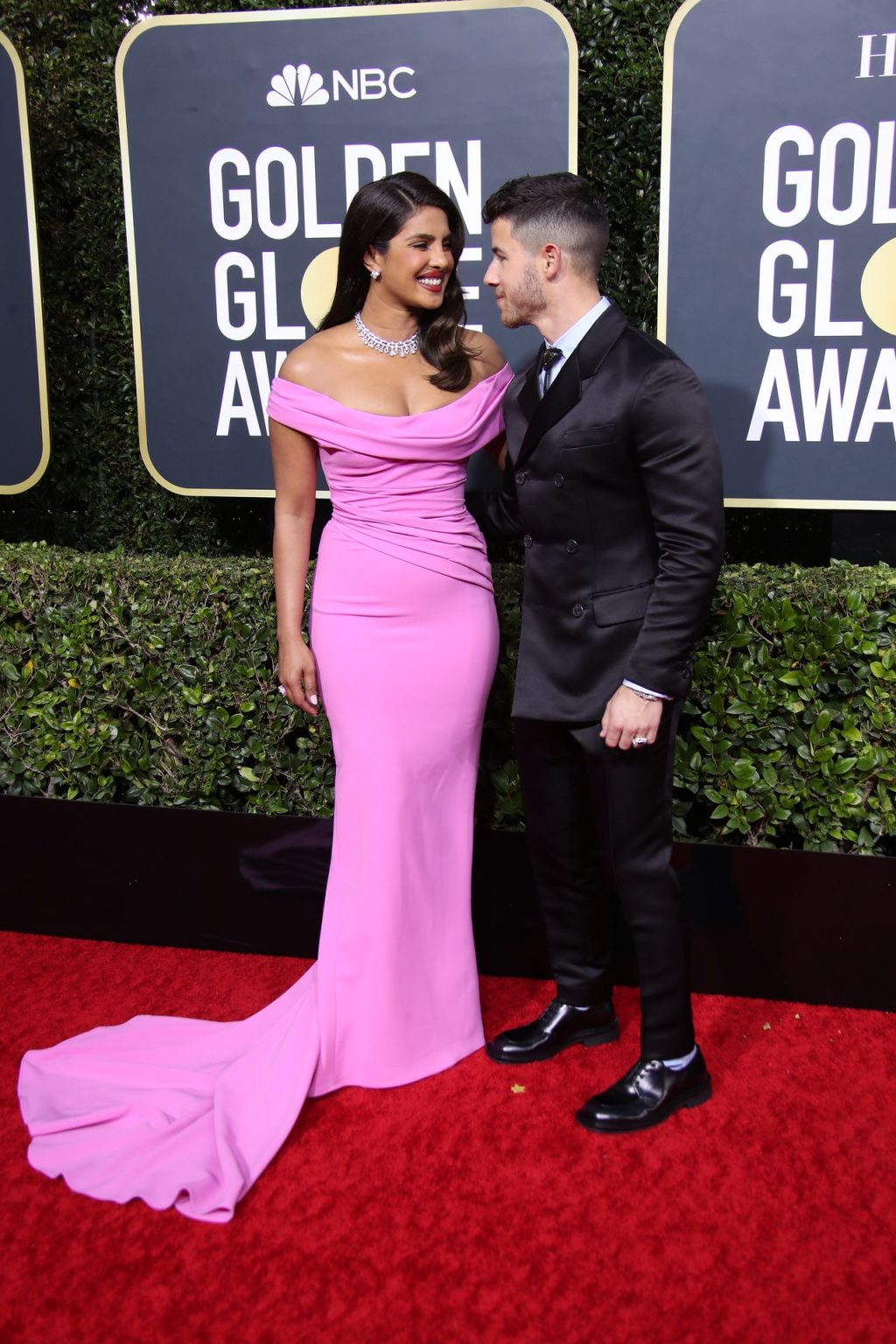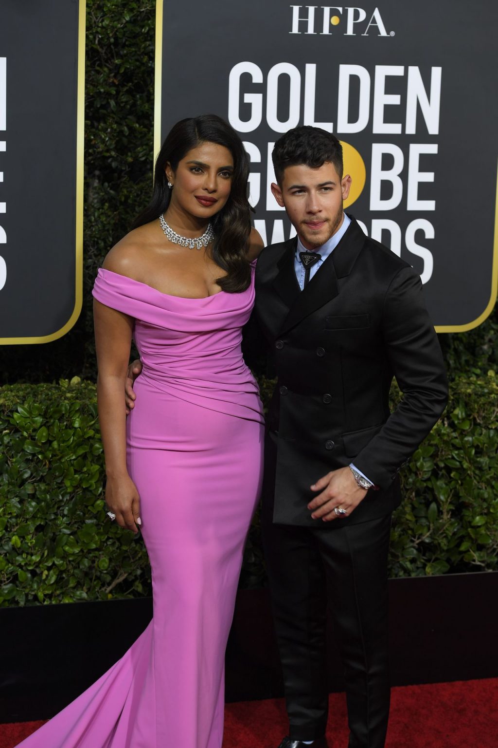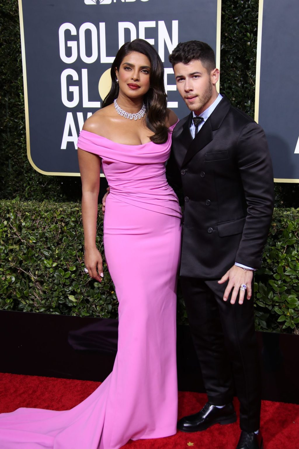 Actriz Priyanka Chopra llega a la alfombra roja durante la 77ª Entrega Anual de los Globos de Oro en The Beverly Hilton Hotel, 01/05/2020. Para la prestigiosa ceremonia en Beverly Hills, la belleza india eligió un vestido rosa de Cristina Ottaviano.