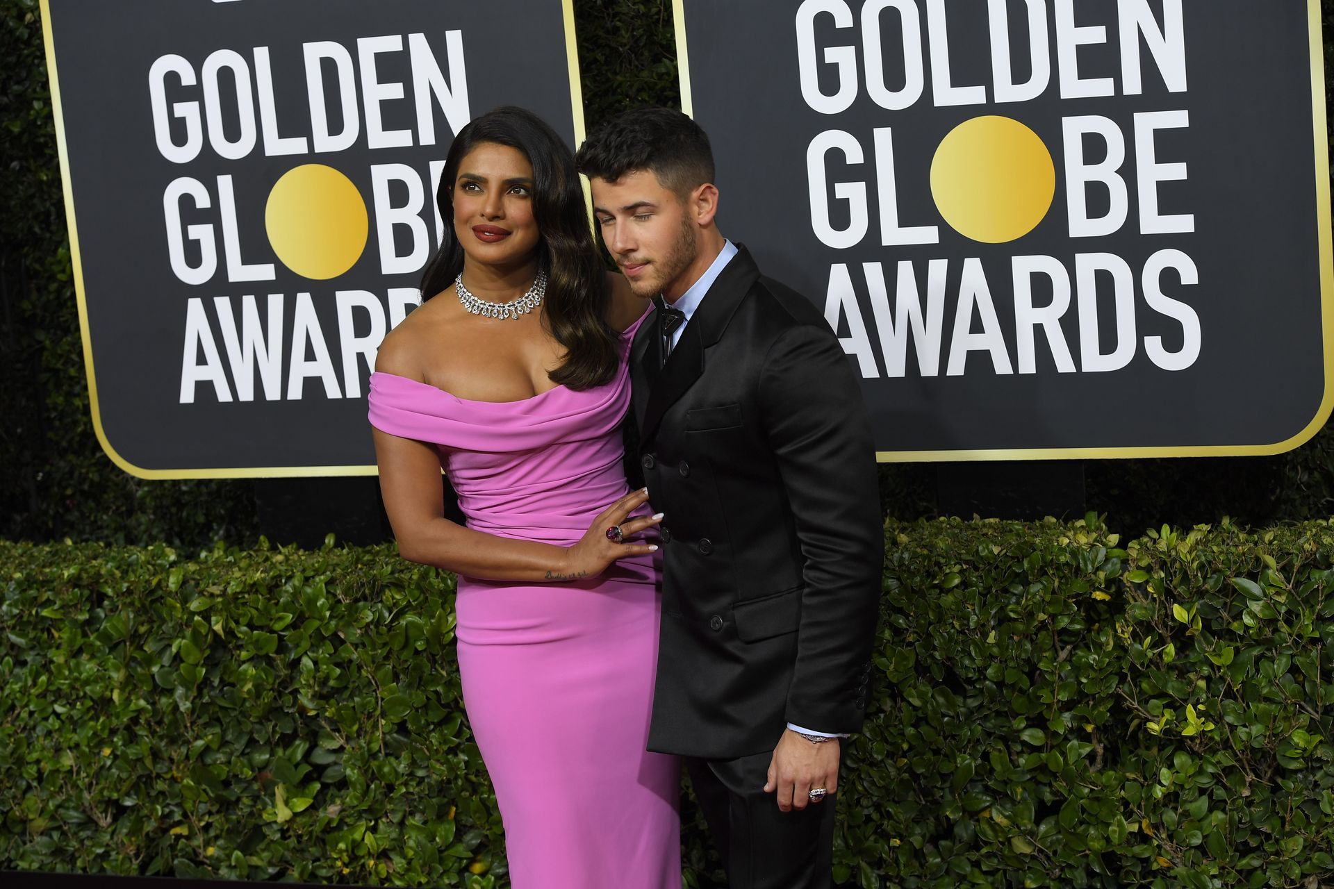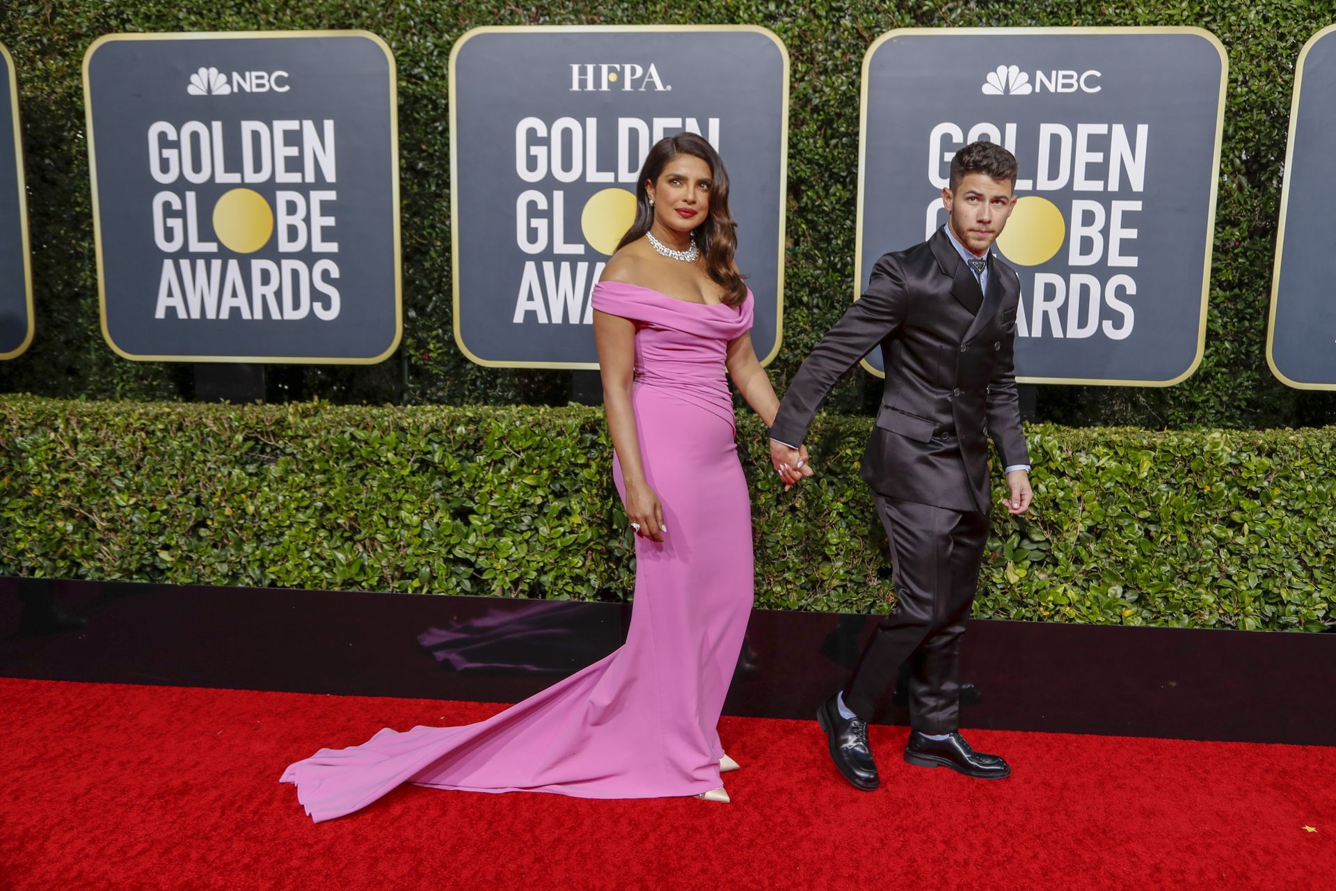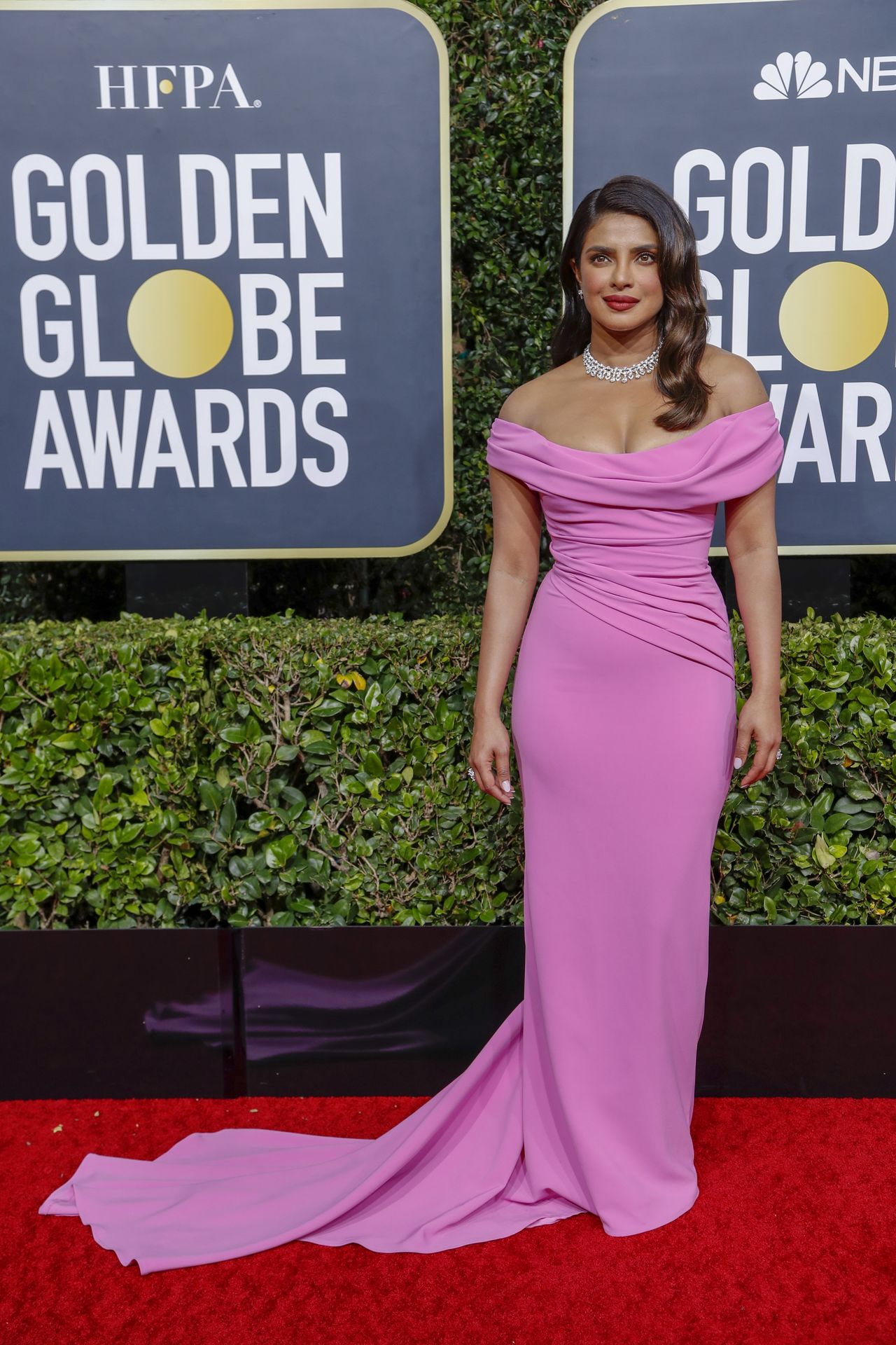 Actriz Priyanka Chopra llega a la alfombra roja durante la 77ª Entrega Anual de los Globos de Oro en The Beverly Hilton Hotel, 01/05/2020. Para la prestigiosa ceremonia en Beverly Hills, la belleza india eligió un vestido rosa de Cristina Ottaviano.