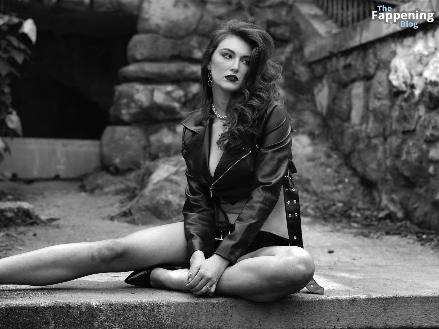 Rachel Pizzolato posa con una chaqueta de cuero y una minifalda, mostrando sus impresionantes curvas, escote perfecto y piernas de infarto en una sesión de fotos de Coveney Inc.