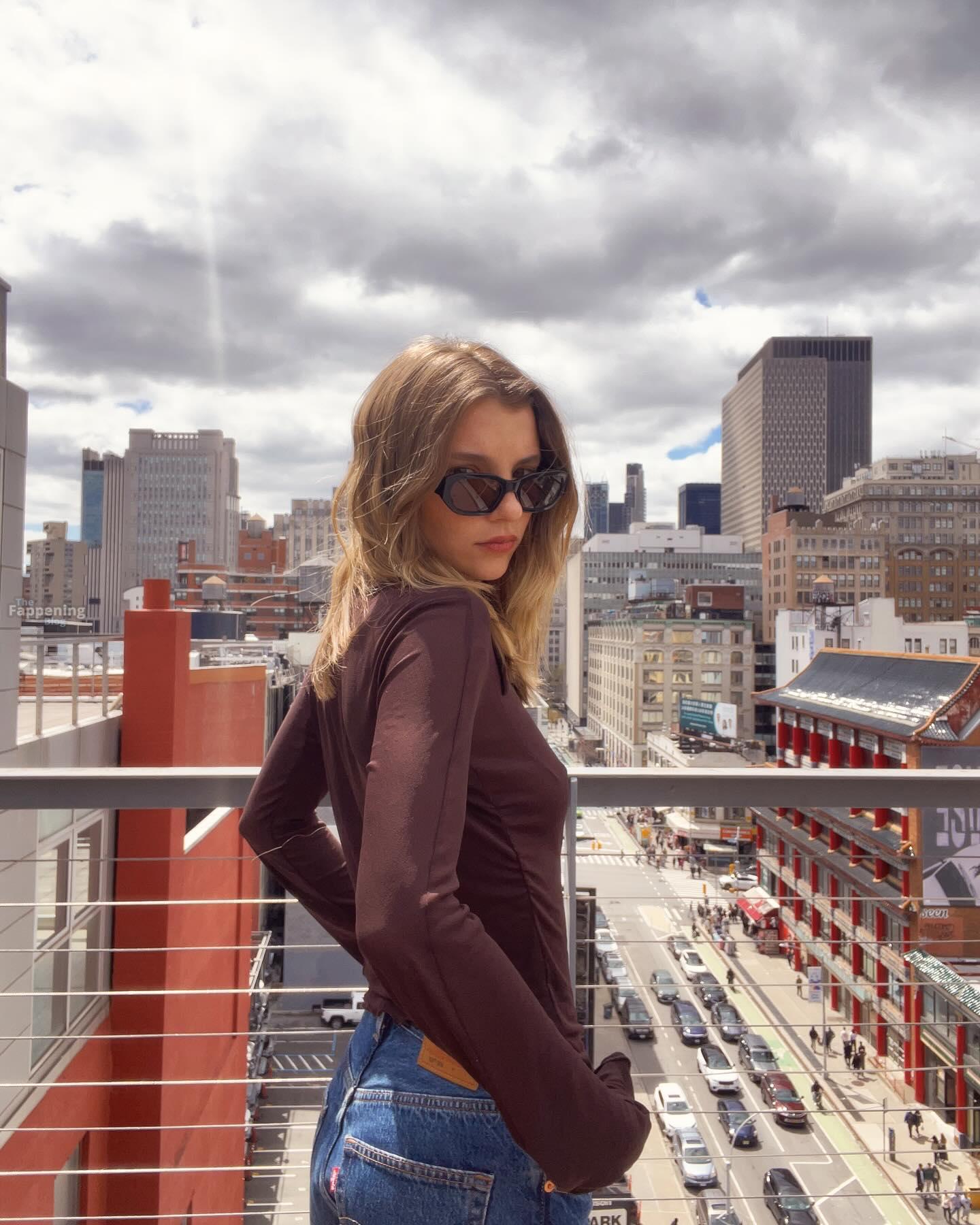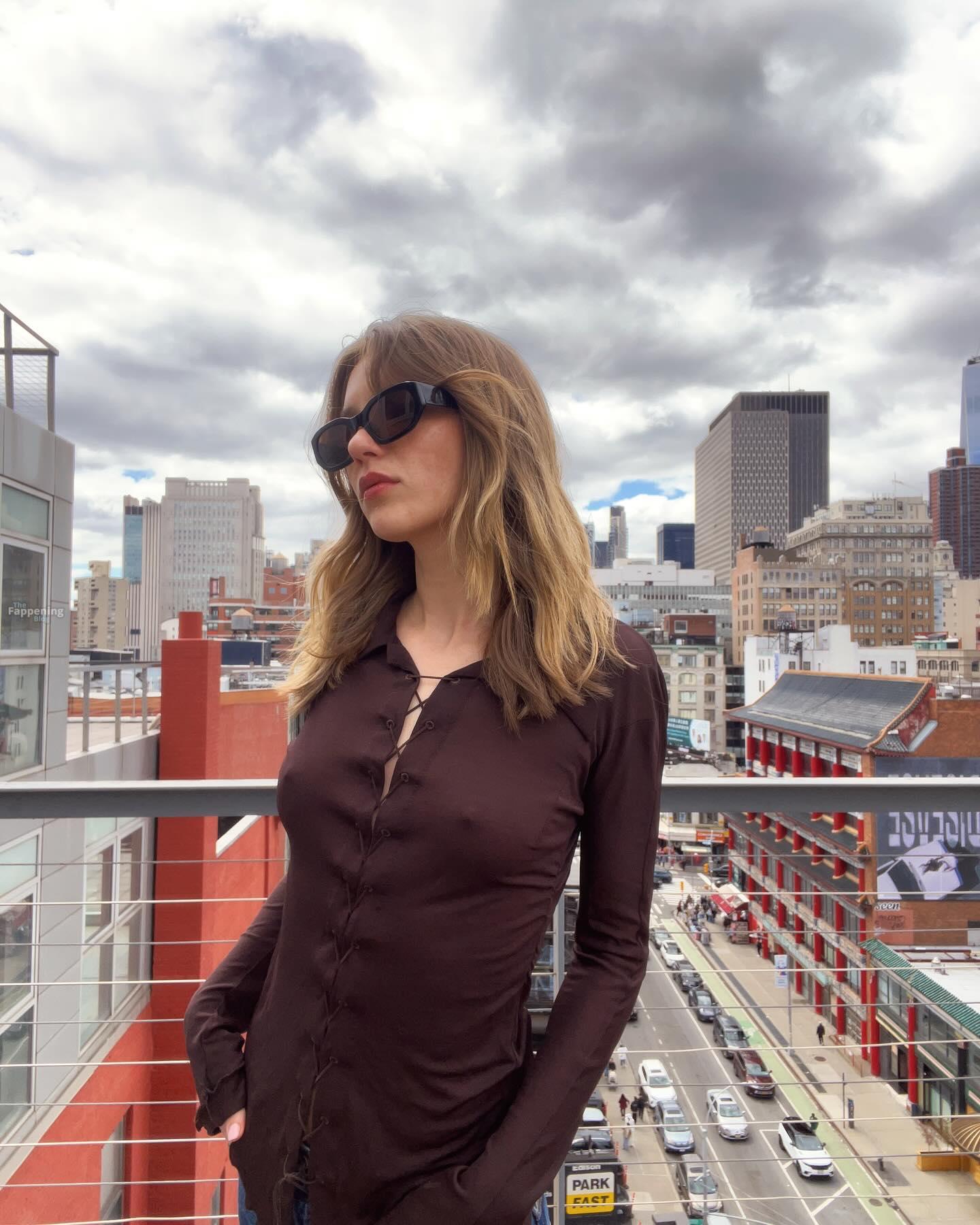 La modelo estadounidense Rachel Yampolsky posa sin sostén y muestra sus pezones marcados en Nueva York.