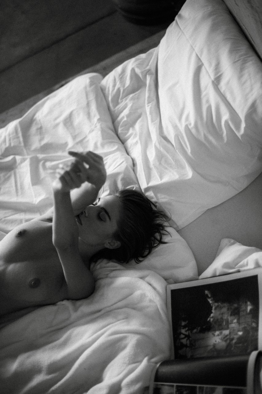 Aquí hay más fotos en blanco y negro de Rebecca Bagnol por Sacha Leyendecker para OSPHILIA (2018). La joven belleza francesa mostró su cuerpo desnudo perfecto en la cama.